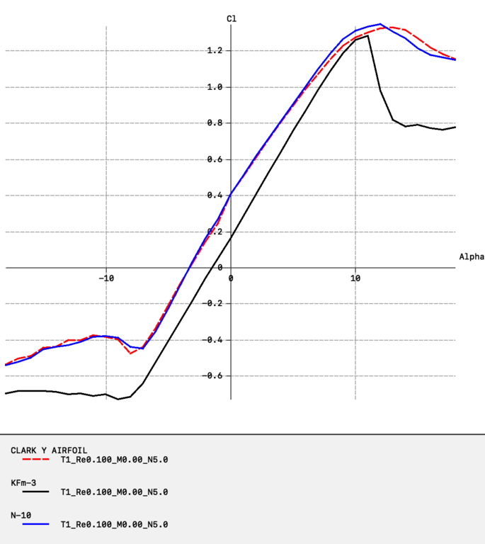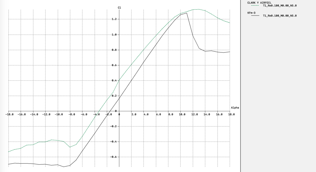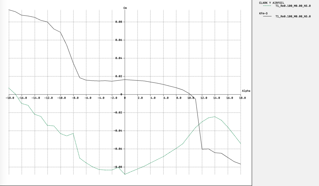 Oczywiście, że zmiana profilu powoduje zmianę zachowania modelu, oraz może wymagać korekt ustawień, np. kątów zaklinowania. Profil KFm, np. KFm-3 ma zupełnie inną charakterystykę współczynnika moment niż CLARK Y - wykres poniżej Dodatkowo, ma inny kąt zerowej siły nośnej - wykres poniżej: Problem polega na tym, że nie ma dostępnych wykresów profili KFm - to co zamieściłem, jest wygenerowane przeze mnie. Ale jak na razie mi się sprawdza - robiłem przy ich pomocy analizy i obliczenia dla naszego kolegi z Forum. Dlatego trudno jest skorzystać ze wzoru Schier'a aby wyliczyć kąt dekalażu. EDIT: Jakie zrobiłeś kąty zaklinowania w modelu z profilem KFm, skrzydło i statecznik poziomy? Nie zauważyłem - skrzydło na 0 st. Profil "flite test - kanciasty i wysklepiony" ma jeszcze "większy" na minus współczynnik momentu niż Clark - a zrobiłeś skrzydło z profilem, który ma dodatni współczynnik momentu. Clark Y oraz flite test generują moment pochylający, natomiast KFm generuje moment zadzierający (zweryfikowane praktycznie) Wiele czynników: - układ modelu (górnopłat, dolnopłat, jednopłat, wielopłat, itp.) - wznios; - profil w połączeniu z układem skrzydła i płatowca;
