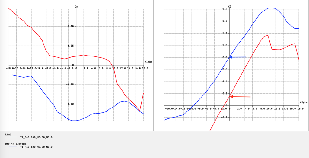 jeśli skrzydło z KFm na zero i statecznik na zero, to powinno być OK jeśli chodzi o dekalaż. Rozumiem, że statecznik to płytka. Przyczyną mogła być zbyt mała prędkość (gdybam) możliwe, że byłeś przyzwyczajony do wolnego modelu ze skrzydłem flite test EDIT: uzupełnienie do powyższego: Jeszcze raz powtórzę - moim zdaniem problem jest w prędkości modelu: Twój kanciasty profil jest zbliżony powiedzmy do RAF 19 Porównaj charakterystyki takiego profilu i KFm-3 (zaznaczyłem strzałkami różnicę) aby zrównoważyć ciężar modelu, musisz zwiększyć prędkość. odniosę się jeszcze do tego: Czyli, jeżeli dobrze czytam wykresy, powinienem zwiększyć kąt natarcia płata (bo pracuje w niekorzystnym zakresie kątów) oraz statecznika (żeby skorygować moment zadzierający kfm) ? Dla KFm-3 nie szalałbym ze zwiększaniem kąta zaklinowania - max +1,5 stopnia, ale jak słusznie zauważyłeś trzeba zmienić kąt zaklinowania statecznika poziomego - ustaw go na +1 stopień, ale nie więcej niż na +1,5 stopnia (może być pomiędzy) Kąty mierz na dolnej powierzchni skrzydła i statecznika.