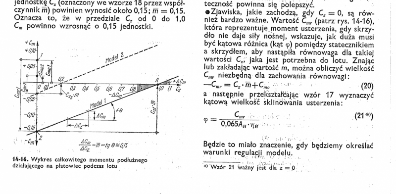 C.d. zastanówmy się nad wzorem Schier'a na wielkość kąta dekalażu. Potrzebny jest jeszcze ten wzór: Tak naprawdę wielkość tą możemy odczytać z wyznaczania SC przy pomocy cg ecalc Jak widać zaznaczone w ramce czerwonej = 0,31 - ja przyjąłem 0,32, bo faktycznie wyszło po poprawkach 0,319 Jak widać zależy od: powierzchni skrzydła: S; powierzchni statecznika poziomego; SH; odległości pomiędzy SC a środkiem aerodynamicznym SCA statecznika poziomego: LH; SCA (średniej cięciwy aerodynamicznej) lśr; Omówię przydatność tego wzoru na przykładzie modelu Lublina, który robi Kesto Zakładamy zapas stateczności podłużnej na poziomie 15%, czyli wartość m z daszkiem = 0,15 Lublin to górnopłat, czyli sprawność usterzenia = 0,8 Aby skorzystać z tego wzoru potrzebne są charakterystyki profilu - biorę dwa GOE387, który był brany pod uwagę na początku, oraz IAW 127 - oryginał jaki był w Lublinie Obie charakterystyki dla Re 500 000 - odpowiednie dla SCA oraz prędkości modelu kąty zerowej siły nośnej dla: GOE387 ok. -5,5 stopnia; IAW 127 ok. -3 stopnia. Cm profili: przyjmijmy wartości średnie: GOE387 ok. 0,09 jako wartość bezwględna; IAW 127 ok. 0,05 jako wartość bezwględna. Potrzebujemy też wyznaczyć wykres, który Schier przedstawia na rysunku 14-16 Ja do tego użyję XFLR5, można to liczyć wg wzorów, które podaje Schier, ale to czasochłonne (nie mam na to czasu) Cm=0 dla Cl=0,45 No to liczymy dla IAW 127 (liczymy ze wzoru 21 dla wartości z - pionowe położenie SC = 0) kąt dekalażu = (0,45*0,15+0,05)/0,065*0,32*0,8 = 7,06 stopnia, Dla GOE397 po podstawieniu 0,09 zamiast 0,05 wychodzi 9,5 stopnia. To dekalaż aerodynamiczny, a jaki będzie geometryczny? Ten, który będziemy sprawdzać i ustawiać w modelu? Załóżmy, że skrzydło w obu modelach zaklinowaliśmy na +2 stopnie, kąt zerowej siły nośnej dla: GOE387 = 5,5 + 2 = 7,5 IAW 127 = 3+2 = 5 Wartości 5,5 oraz 3 to kąt zerowej siły nośnej dla profilu w wartości bezwzględnej z wykresu Cl vs alfa zamieszczonego powyżej. Na ile zaklinować statecznik poziomy z profilem symetrycznym (jego kąt zerowej siły nośnej = 0)? IAW 7,06 - 5 = 2,06, czyli na - 2 stopnie. GOE 9,5 - 7,5 = 2, czyli też na - 2 stopnie Czyli geometryczny dekalaż w obu przypadkach to 4 stopnie: +2 stopnie skrzydło, - 2 stopnie statecznik poziomy. A gdybyśmy AH powiększyli z 0,32 na 0,43? (można to uzyskać poprzez: zwiększenie powierzchni statecznika poziomego, odległości statecznika poziomego od SC, lub obie naraz) Policzyłem tylko dla profilu IAW 127 - dekalaż aerodynamiczny wynosi 5,5 stopnia Czyli geometryczny: 2,5 stopnia: skrzydło zaklinowane na +2 stopnie, statecznik na -0,5. To wg Schier'a - ktoś może sprawdzić, czy nie pomyliłem się w rachunkach, A co na to XFLR5 tylko dla profilu IAW 127 dla AH = 0,43, geometrycznie, skrzydło zaklinowane na +2 stopnie, statecznik na -1,8 stopnia, czyli geometryczny dekalaż = 3,8 stopnia (wg Schier'a 2,5 stopnia) dla AH = 0,32, geometrycznie, skrzydło zaklinowane na +2 stopnie, statecznik na -2,9 stopnia, czyli geometryczny dekalaż = 4,9 stopnia (wg Schier'a 4 stopnie) Są różnice, ale moim zdaniem lepiej iść wg tego co napisał Schier, niż wg tego co w dużym uproszczeniu podaje Gordon "Białogłowy" Ja osobiście ufam XFLR5 - jeszcze się nie przejechałem na wyliczeniach. Jaki z tego wniosek, ano jeden podstawowy, że dekalaż zależy od: - AH - ja to nazywam krótko, współczynnik wielkości statecznika poziomego ("norma" to >0,4, jeśli mniejsze trzeba uważać i zastanowić się nad profilem skrzydła, np. o mniejszym Cm) - Rodzaju profilu, jego wartości Cm (im ma większą strzałkę ugięcia tym gorzej) - układu modelu, sprawność usterzenia dla górnopłata =0,8, a dla dolnopłata 0,6 Warto mieć to na uwadze, a nie tylko położenie SC. Edit - to co na niebiesko, to po edycji. jak się pomyliłem w obliczeniach, to przepraszam -