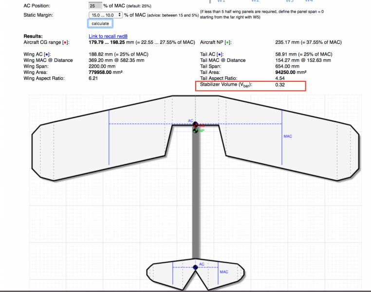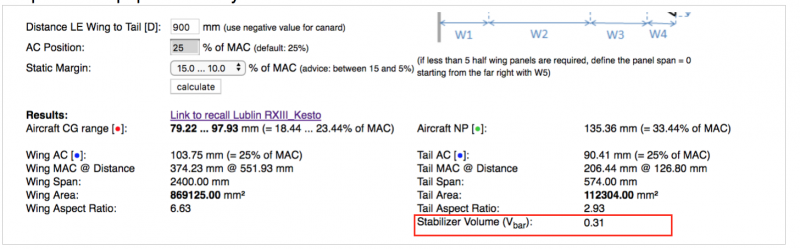 Nawiązując do konstrukcji samolotu Lublin RXIII Powyżej pokazałem użyteczność wzoru z książki Schier'a na obliczanie kąta wzajemnego sklinowania skrzydła i statecznika poziomego, ale tylko jego wersji uproszczonej. Należy pamiętać, że w górnopłatach położenie SC jest znacznie poniżej SCA. W przypadku Lublina RXIII wersji hydro trzeba jeszcze uwzględnić poprawkę na moment pochylający model od oporu pływaków, ale o tym już było. Podobny problem jest z modelem samolotu RWD 8 - też już było o tym, że oryginał ma profil IAW 140 o niskim współczynniku momentu, podobnie jak IAW 127 w samolocie Lublin RXIII. I również mały współczynnik wielkości statecznika poziomego. Poniżej wyznaczony SC dla RWD 8 w skali 1:5 Jak widać "Stabilizer Volume" =0,32 Układ samolotu RWD 8 powoduje złudzenie jakoby ramię statecznika poziomego było długie, ale to złudzenie. Do obliczeń równowagi bierze się pod uwagę średnie cięciwy aerodynamiczne (SCA - edit: tu na rysunku oznaczone jako MAC), a ze względu na skos skrzydła RWD 8, SCA skrzydła jest przesunięta ku tyłowi. Ktoś powie (napisze), że mój RWD 8 lata z profilami Clark Y, OK - może latać, tylko jak? Co trzeba zrobić aby go wytrymować do lotu poziomego? No i pytanie, jak by wyglądał jego lot ślizgowy gdyby silnik uległ awarii. Latają modele latających skrzydeł z profilem Clark Y. Nikt nikomu tego nie zabroni. Ostatni aspekt kąta sklinowania (dekalażu), a zmniejszenie ilości balastu do wyważenia modelu. C.d.n. -