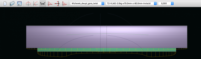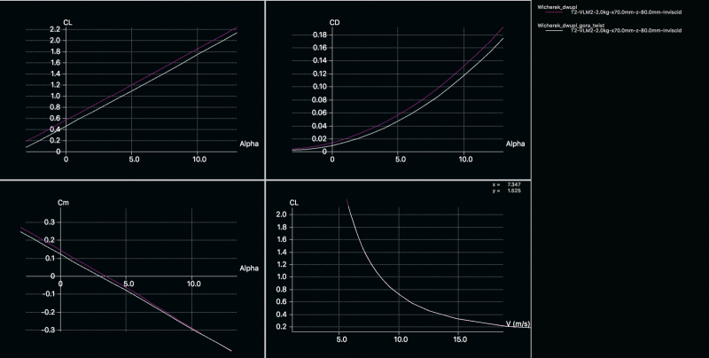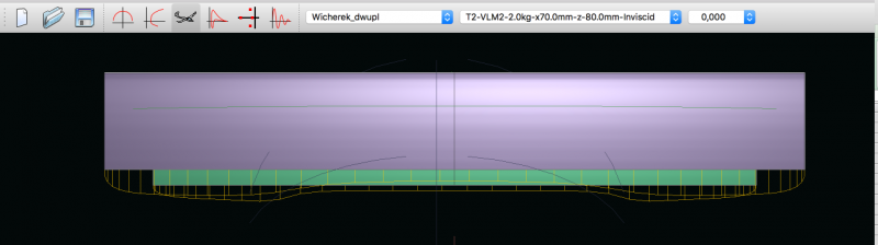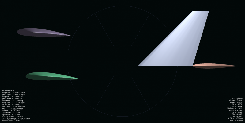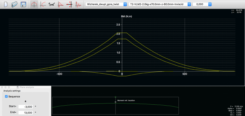 Wicherek dwupłat wg proporcji z rysunku – długość cięciwy 250mm, bez wzniosu skrzydeł. Dlatego wygląda jak wygląda. Analiza aerodynamiczna: Przyjąłem tylko profil NACA 2415 dla obu skrzydeł, nie ma wielkich różnic pomiędzy NACA 2415 a 2418 w tych zakresach Re Przyjąłem masę dla tego modelu 2kg Zrobiłem analizy dla modelu bez zwichrzenia płata górnego i ze zwichrzeniem. Wyniki analiz: Filetowa krzywa dla modelu bez zwichrzenia, Biała dla modelu ze zwichrzeniem górnego płata tylko. Różnice są widoczne zwłaszcza jeśli chodzi o opór, również lekki spadek siły nośnej ale nie aż taki drastyczny – pokażę jak się to odbija na prędkości. Wykresy rozkładu siły nośnej wzdłuż rozpiętości: modelu bez zwichrzenia Na przelocie mamy V=11,3 m/s = 40,7 km/h a współczynnik oporu 0,014 modelu ze zwichrzeniem górnego płata tylko Na przelocie mamy V=12,5 m/s = 45 km/h a współczynnik oporu 0,009 Niestety XFLR nie za bardzo uwzględnia wzajemne oddziaływanie płatów na siebie (chyba, że nie umiem ustawić czegoś) A tak wglądają wykresy momentu gnącego: Bez zwichrzenia: Ze zwichrzeniem Tu już różnicę widać wyraźnie. Opory indukowane (żółte linie): Bez zwichrzenia: Ze zwichrzeniem: Powyższe symulacje pokazują, że moje sugestie ze zwichrzeniem płata górnego były słuszne. Że zmniejszy obciążenia całego układu przy tej rozpiętości i może uchronić od tego o czym pisał „Mirolek” i ja też. Pewnie - jeśli ktoś zrobi sztywną konstrukcję to nic się nie stanie, ale Wicherek, to głównie mała masa (ktoś pisał o tym) Położenie środka ciężkości ustawione „na oko” Nie wiem dlaczego pomysłodawca Wicherka dwupłata nie zmniejszył rozpiętości w stosunku do jednopłata.