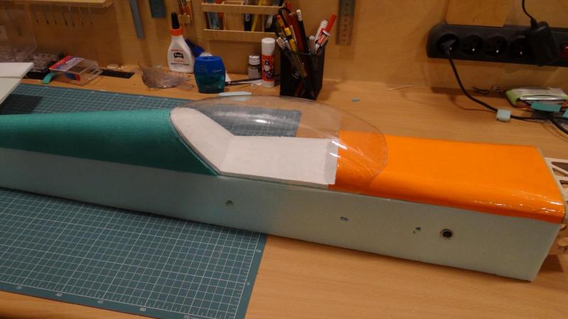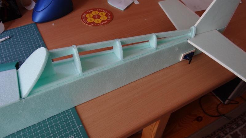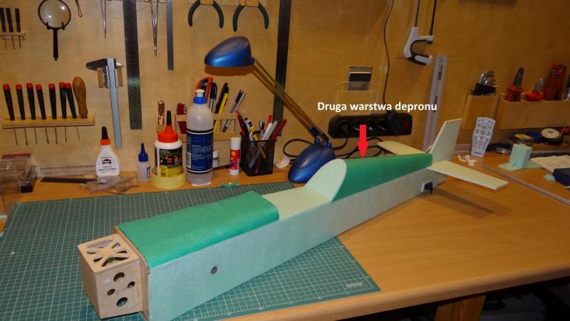Następnym etapem budowy było wzmocnienie kadłuba. Wzmacniając kadłub zrobiłem również kanał do przewodów od serw zamontowanych w ogonie. Dzięki temu swobodnie mogę je przemieszczać, co jest przydatne podczas demontażu serw. Następnie wkleiłem statecznik poziomy. Do tego celu wykonałem podpórki, które umożliwiły mi uzyskanie odpowiedniego poziomu statecznika. Górną część kadłuba wykończyłem dwoma warstwami depronu o grubości 3 mm. Obecnie kadłub uzyskał odpowiednią sztywność. Koledzy - chciałem do tego samolotu wykonać przezroczystą owiewkę kabiny, a nigdy tego nie robiłem, to czy możecie podzielić się swoimi sposobami wykonania takiej kabiny?- 55 odpowiedzi