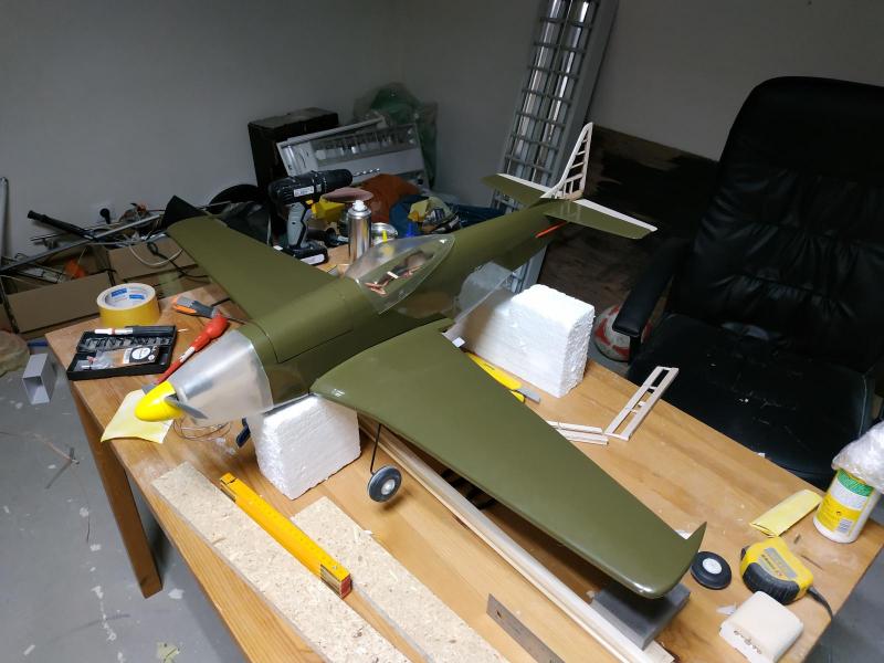 Cześć Wszystkim, Dawno nie odświeżałem relacji z budowy bo w ogóle nie miałem czasu siąść do modelu.. Czasem znalazłem parę minut ale to dosłownie na jakieś małe prace co sumarycznie pchało budowę do przodu. Dziś wreszcie parę godzinek mogłem mu poświęcić Aktualnie model jest już prawie gotowy.. Prawie Model prawie cały oklejony, został mi spód skrzydeł, stery i statecznik pionowy. Myślałem, że oklejanie będzie trudne i polegnę a tu nawet dobrze mi poszło. Kolor oliwkowy, do tego dojdą akcenty żółtego i detale czarno białe. No i wykończenie kabiny.. Aktualnie wygląda to tak: -