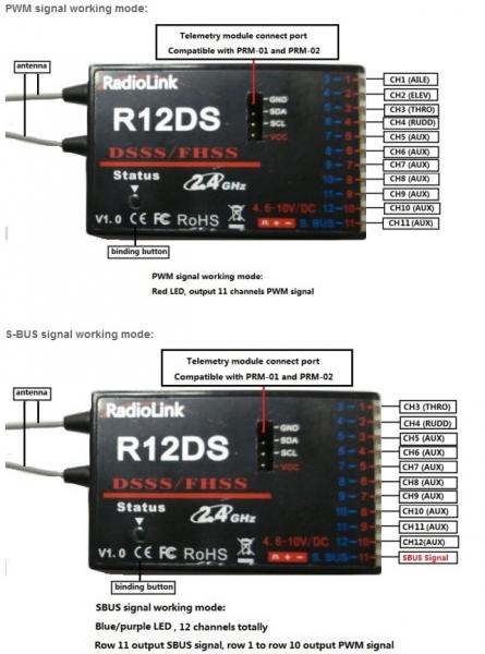 Wygląda to następująco: Two signal working mode: (1)PWM signal output working mode:red LED indicates PWM signal output, 11 channels Totally. (2) S-BUS signal output working mode: blue/purple LED indicates S-BUS signal output, 12 channels totally. S-BUS and PWM signal working at the same time. S-BUS signal channel(3 pin of row 11) output 12 channels S-BUS signal, PWM signal channels(3 pin of row 1 to row 10) output CH3 to CH12 PWM signals, but 12 channel in total. How many PWM signal channels you can use depends on how many S-BUS signal channels you have used(e.g: you have use 4 S-BUS signal channels, then you have 8 PWM signal channels to use). -
