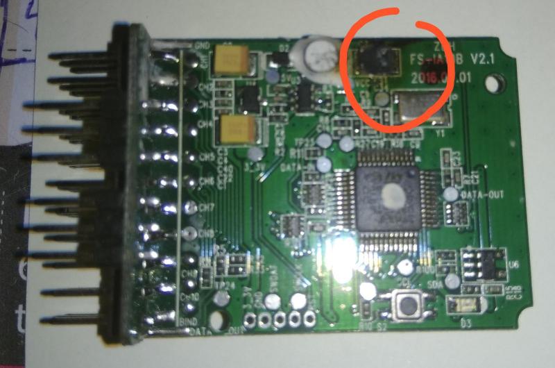 3. Witam.... Posiadam odbiornik FS-IA10B i niestety przez pomyłkę zamieniłem + z - i niestety poszedł dym i po odbiorniku. Spalił się jeden element na wejściu, może jest tu jakiś fachowiec, który podpowie mi co to za element bo fajnie było by spróbować go reanimować. Dołączam zdjęcie z zaznaczonym spalonym elementem.