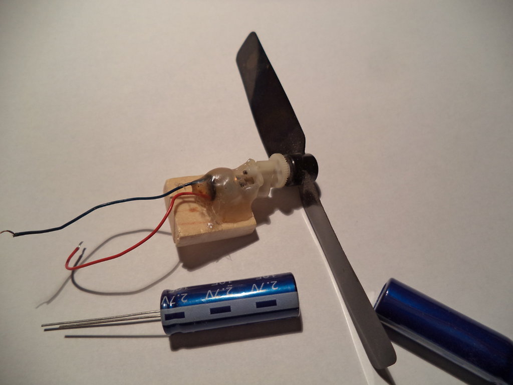 Zestaw silnik i kondensator użyłem tylko w dwóch gumówkach.Ciąg silnika 25 gram-śmigło GWS 4025,ale w modelu 18 gram już było widać brak mocy i wznoszenia.Zdjęć już nie mam ale w tym roku coś lekkiego wykonam.A ładowałem z pakietu 3x1,5V baterie AAA około 20 sekund