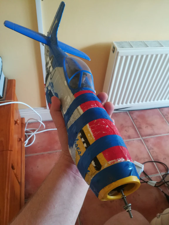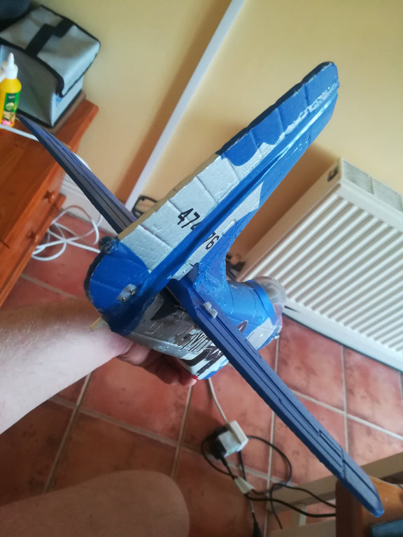 Witaj rojo, witajcie forumowicze. Miałem tworzyć podobny temat, ale podepnę się pod ten bo jest identyczny. Po roku latania trenerkiem-górnopłatem i nauczeniu się podstaw latania z lotkami w czterech kanałach, postanowiłem kupić sobie warbirda - zawsze marzyłem o mustangu. Kupiłem piankowego P51-d wyprodukowanego przez firmę ''Ares". Rozpiętość 750mm, standardowe wyposażenie i ustawienia zgodne z wytycznymi producenta. Sytuacja podobna jak użytkownika rojo, z tym że mój model od razu po wyrzuceniu z ręki, leci lekko do góry i przewala się od razu na lewe skrzydło, lądując nosem w ziemi. Trymowanie, ustawianie wychyleń nie wiele pomogło. W najlepszym wypadku model nabierał szybko wysokości miotając się i ostatecznie przy próbie skrętu przewalał się na skrzydło. Połamałem na nim kilkanaście śmigieł, kleiłem kadłub w czterech różnych miejscach (widać też taśmę którą zabezpieczyłem klejone miejsca). Dziwię się że nadal trzyma się to wszystko w całości. Skrzydła, stateczniki i tył modelu ok - nic się im nie stało. Dzięki temu tematowi dowiedziałem się kilku cennych informacji, postaram się wyważyć model taką samą techniką jak zrobił to autor tematu. W moim przypadku nie kupiłem modelu RTF ale zamówiłem po prostu osobno kadłub, skrzydło, stateczniki i akcesoria takie jak podwozie, owiewka silnika itd. Potrzebowałem też dedykowanego silnika, bo konstrukcja modelu tego wymagała, ale poza tym cała elektronika jest moja. Może właśnie w tym jest problem? Niby usadowiłem serwa, odbiornik i pakiet lipo w miejscach przeznaczonych przez producenta, ale jednak możliwe że coś jest źle. Niby założenie jest takie że RTF to model gotowy do lotu zaraz po wyciągnięciu z pudełka. Natomiast mój to taki frankenstein bo kompletowałem każdy element modelu osobno z różnych sklepów o mało kto ma jeszcze części do tego modelu w magazynie. No i ważna sprawa: ten model ponoć przychodzi z żyroskopem w wersji RTF, mój oczywiście nie posiada żyroskopu bo przecież sam go składałem i nie posiadam gyro. Czy to ma jakiś wpływ na lotność? Mam znajomego modelarza który lata warbirdami i gdy skończy się pandemia wirusa to spotkam się z nim i poproszę o pomoc w wyważeniu i oblataniu wstępnym. Ja mam już dość - tyle razy zaliczyłem kreta że mam traumę. Gdy myślę że miałbym go kolejny raz rzucić do lotu to kraja mi się serce.