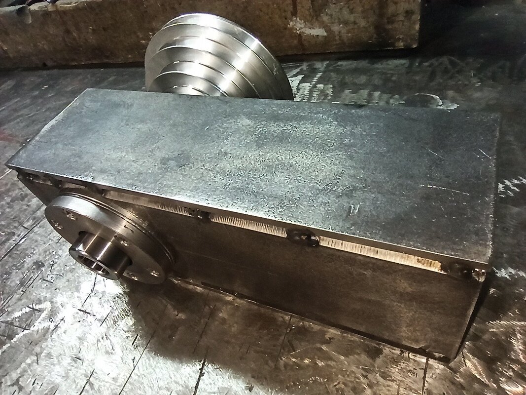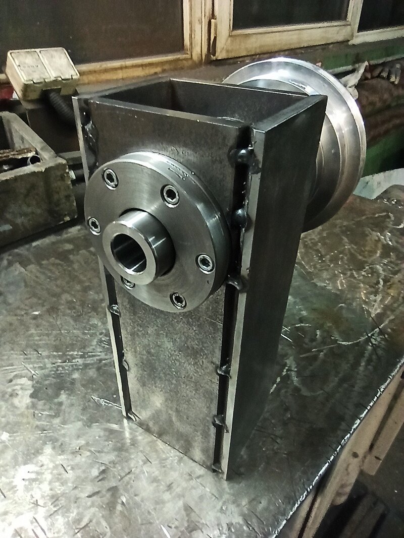 Delikatnie do przodu. Płaskowniki ramienia zostały ,,poszczepiane,, i przewiercone do końca otwory pod wrzeciono. Oczywiście nie mogłem się oprzeć aby tak na szybko nie skonfigurować tego układu. Tak swoją drogą, to coraz bardziej dojrzewa we mnie myśl aby wrzeciono jednak przyspawać do ramienia. Wiem że przykręcane wrzeciono dałoby mi większą uniwersalność ale jest to w końcu maszyna amatorska. Teraz czeka mnie spawanie na gotowo, delikatne splanowanie wszystkich powierzchni, wspawanie wrzeciona i dorobienie z przodu przykręcanego dekielka-zamknięcia. Tak się zastanawiałem, czy w domowych warunkach możnaby wykonać odpuszczanie naprężeń. Czy dałoby coś to, gdybym to podgrzał i pozostawił w tym środowisku do powolnego stygnięcia? A tak to na dziś wygląda:
