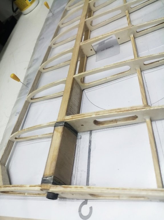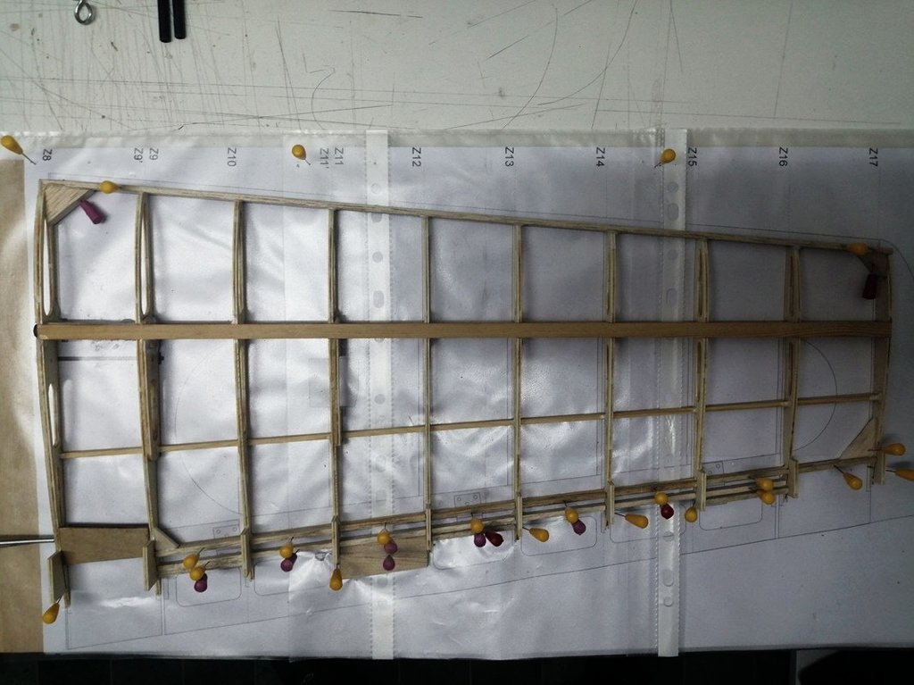 WITAM W temacie powolutku do przodu. Wklejone wszystkie wzmocnienia. Końcówki centropłata w miejscach mocowania bagnetów wzmocnione cieniutkim drucikiem stalowym (może to trochę staroświeckie? . Teraz po wyschnięciu kleju szlifowanie naddatków i oklejanie poszycia balsą 1,5mm.