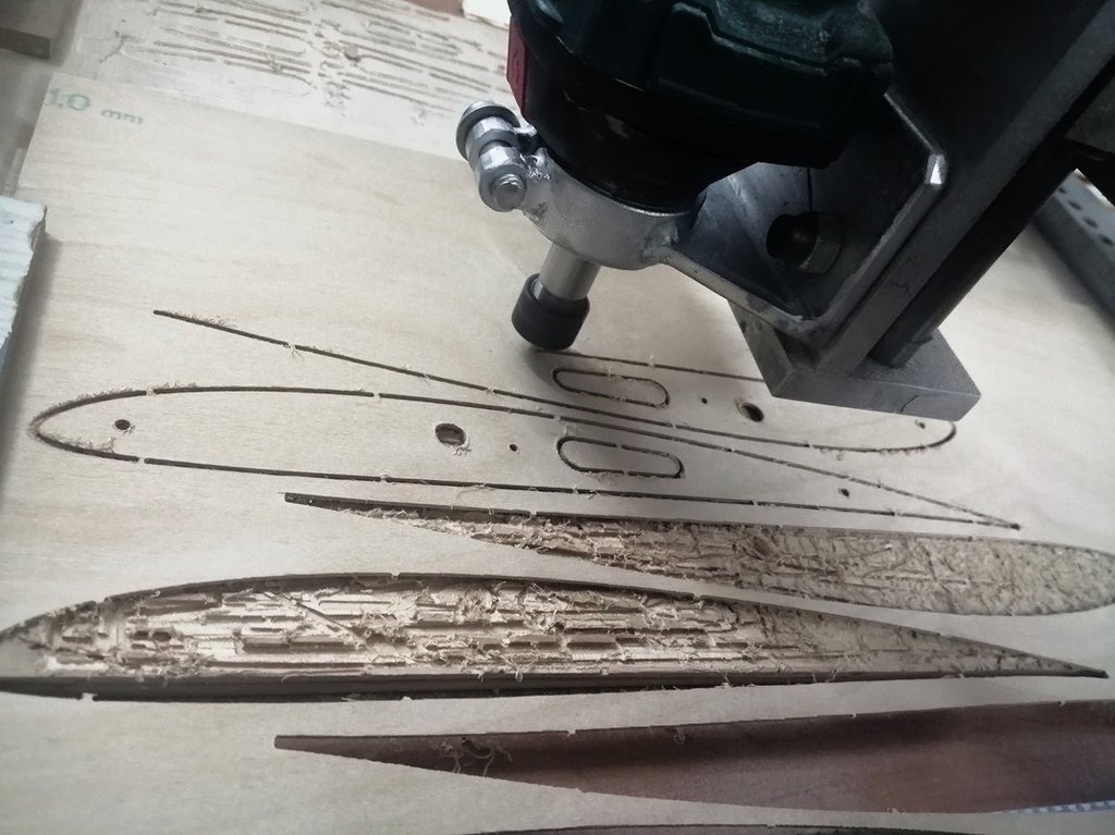 Rysunki uszu sklejone. Żeberka wyfrezowane. Teraz wyciąć żeberka z całości, przeszlifować miejsca po mostkach i można montować.