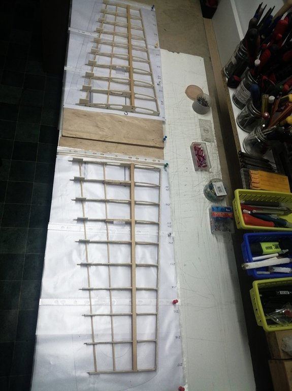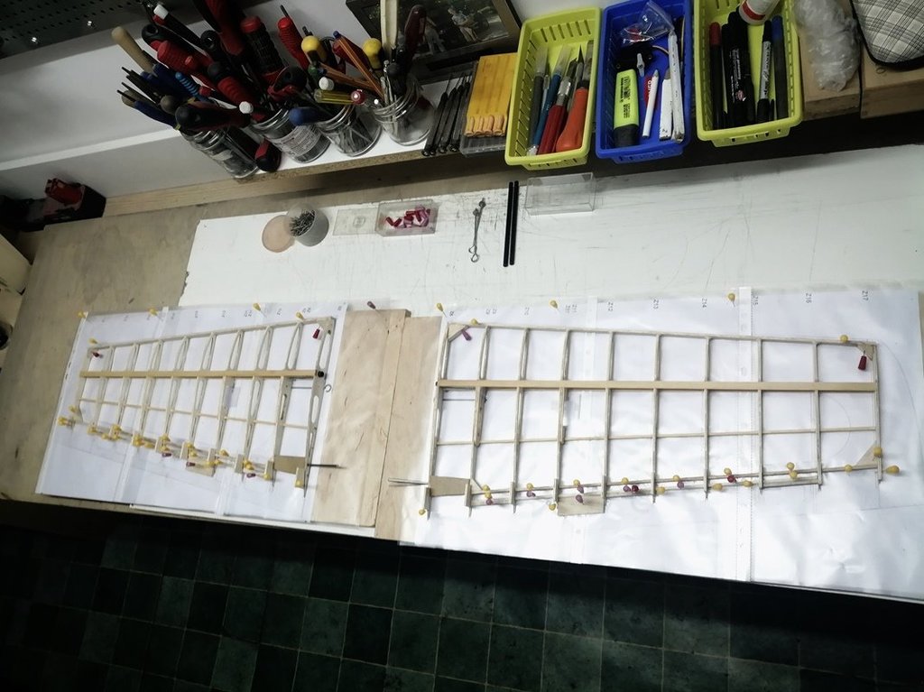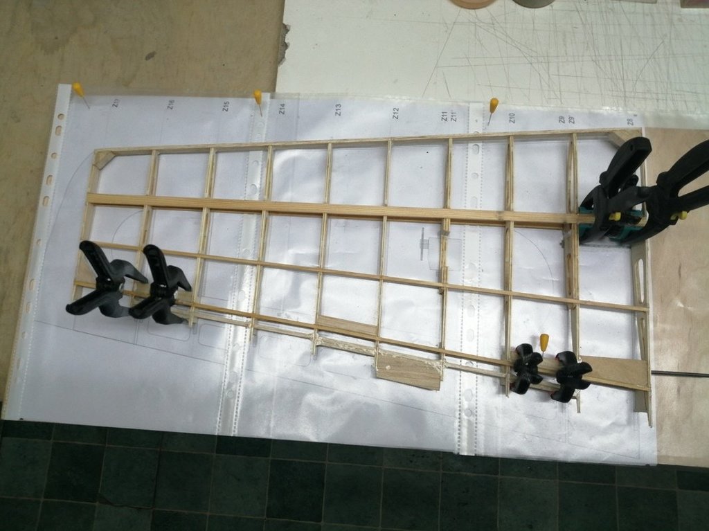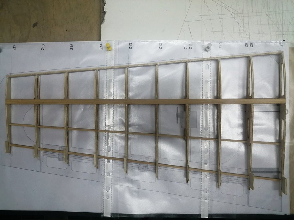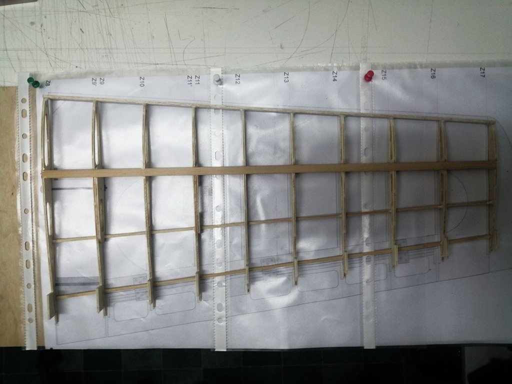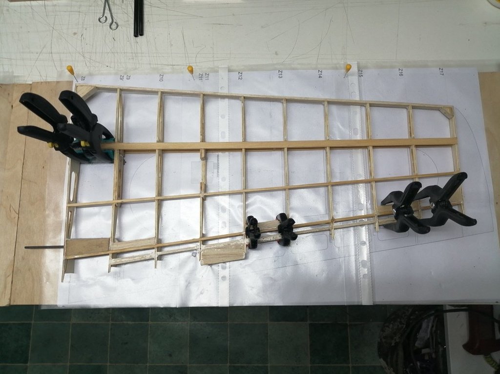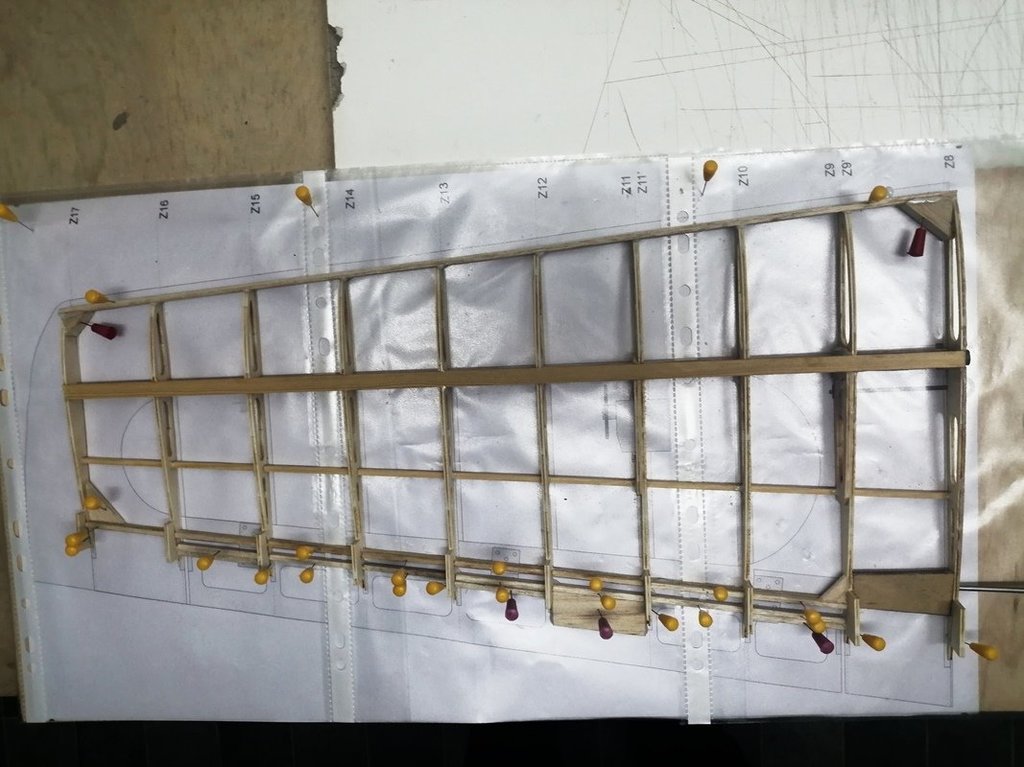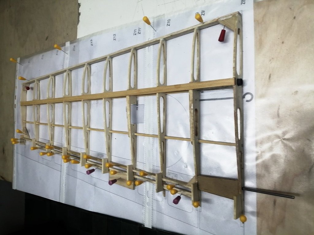 Górne poszycie oraz nakładki na żeberka wklejone. Spasowano końcowe żeberka zamykające ze sklejki 1mm. Całość wstępnie przeszlifowana. Trzeba jeszcze przygotować lipową krawędź natarcia. Chyba jednak zrezygnuję z krawędzi natarcia balsowej z wklejonym prętem węglowym.