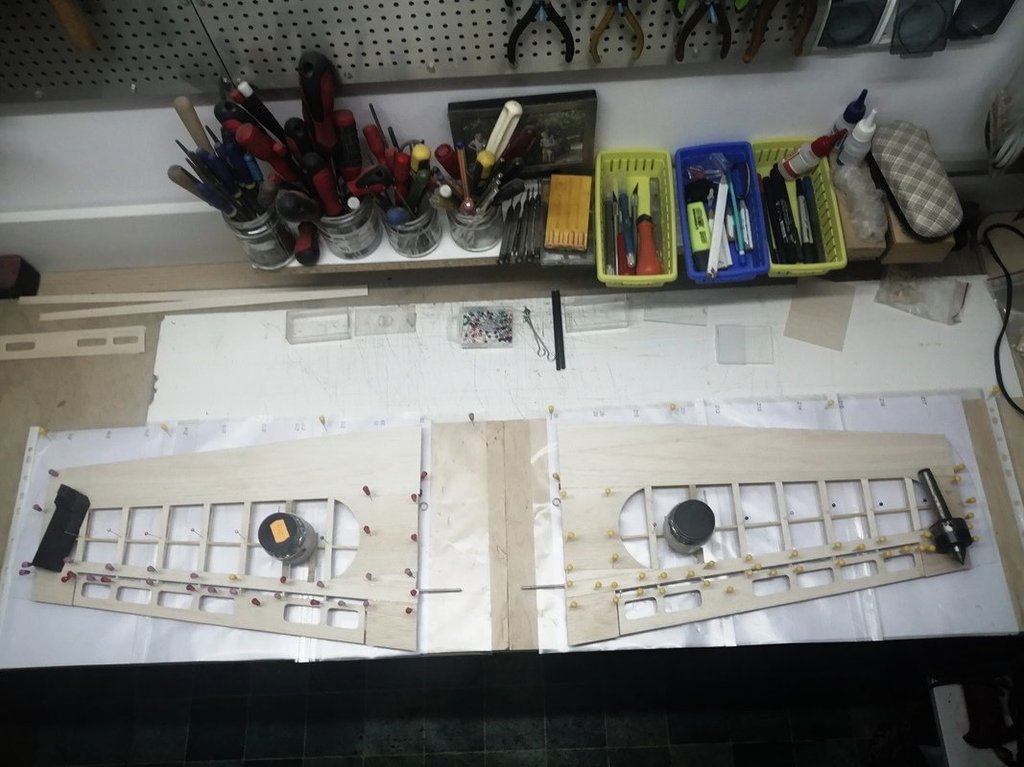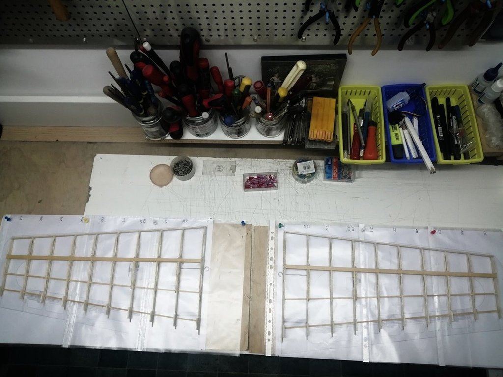 Początek montażu uszu oraz przygotowane elementy łączników uszu z centropłatem (haczyki z drutu fi 2mm do ewentualnego spinania uszu z centropłatem przy pomocy gum, pręty stalowe fi 3mm oraz jako bagnety główne - rurki węglowe fi 6mm).