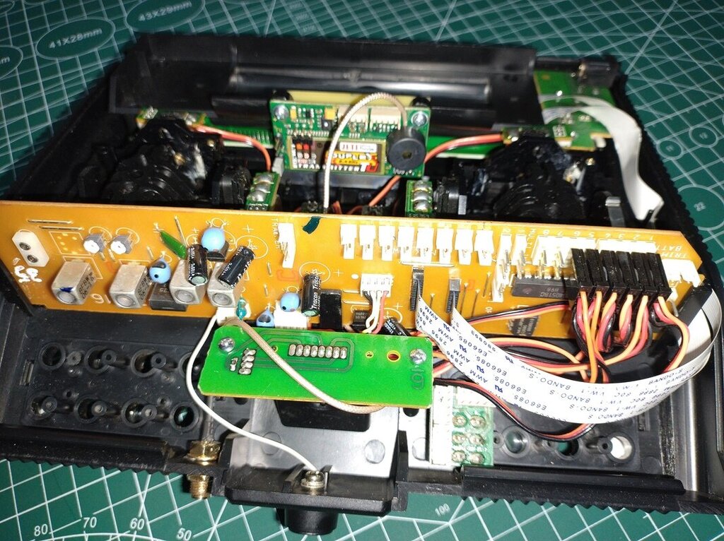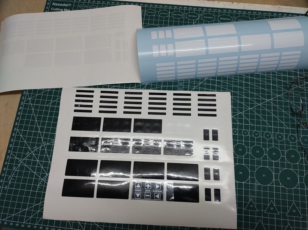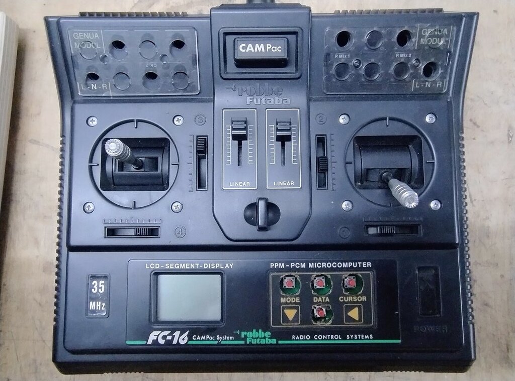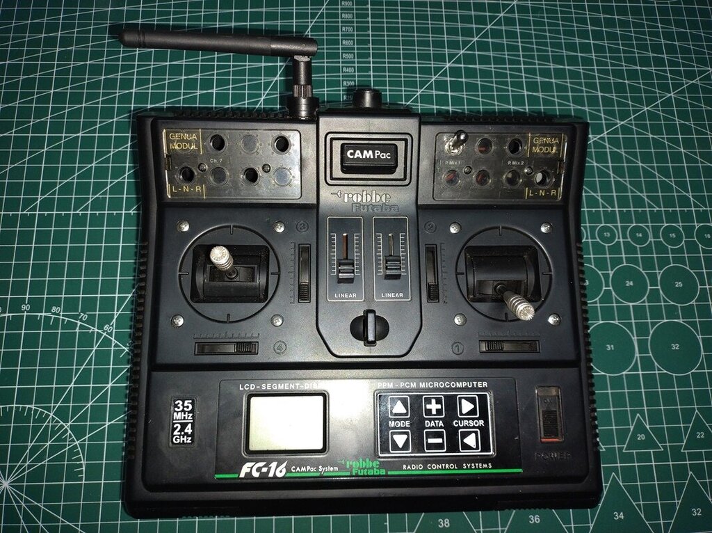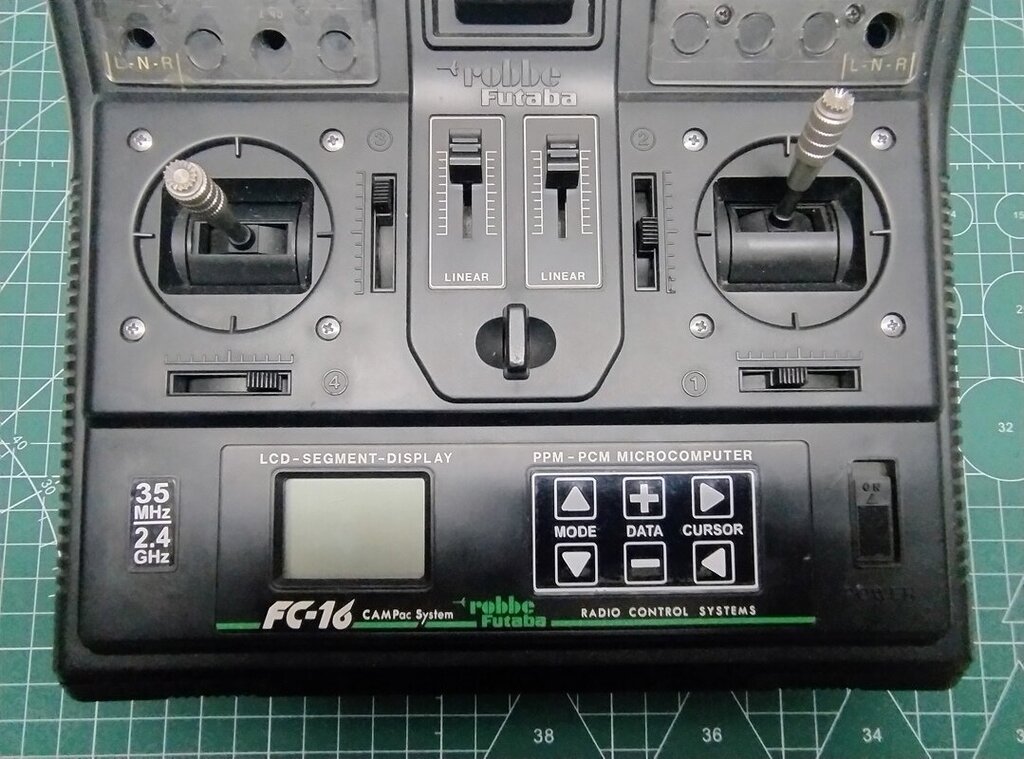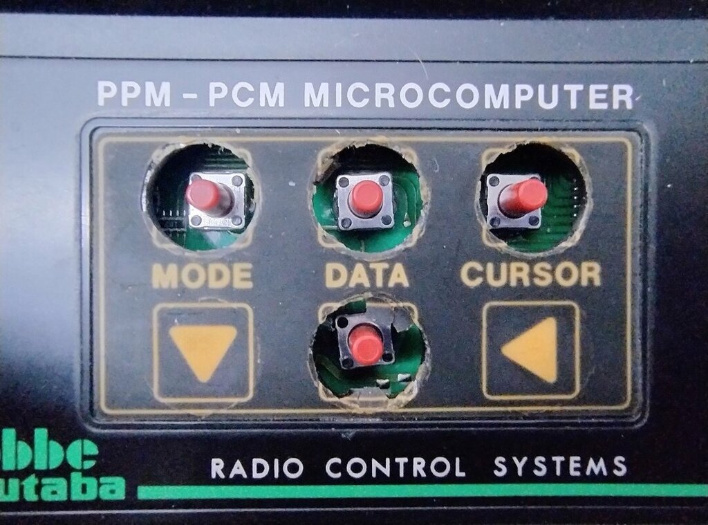 WITAM po przerwie. Moduł Jeti ostatecznie dało się zamontować w FC-16. Sprawdzone z odbiornikiem Jeti - działa prawidłowo. Przełącznik 35MHz/2,4GHz również się sprawdza. Tak że nadajnik pracuje zarówno w systemie 35MHz jak również w 2,4GHz. Jako że wszystko się starzeje - sprzęt również, to musiałem też wykonać nową membramę programatora nadajnika. Nadajnik oczywiście ,,ten drugi,, - rezerwowy. A tak to wyszło: Manipulator programatora nadajnika przed i po wymianie. Membrama powstała z kilku warstw ploterowej folii samoprzylepnej. Elementy membramy programatora jeszcze podczas składania. -