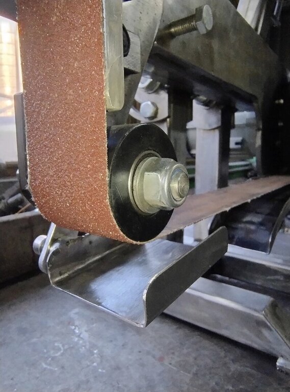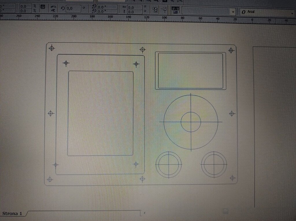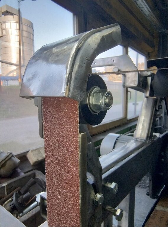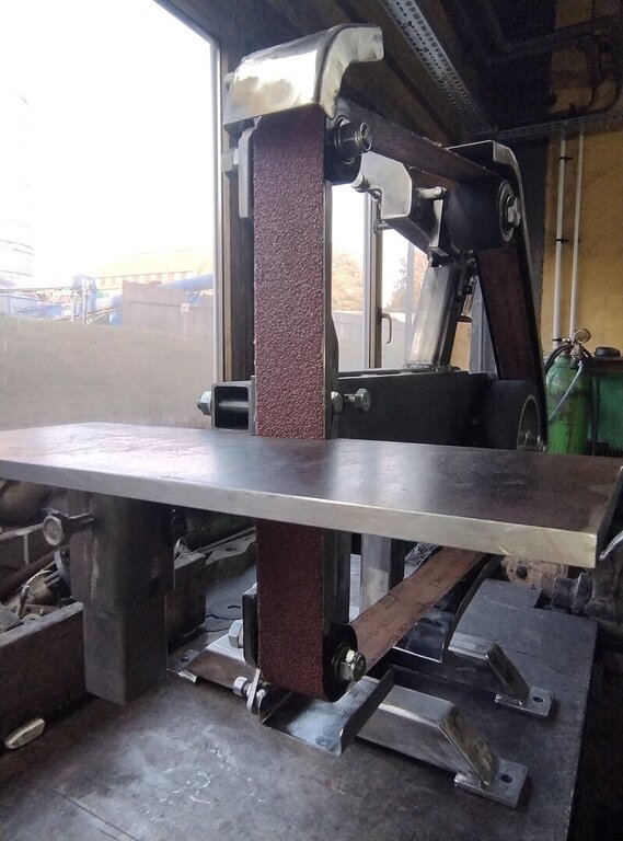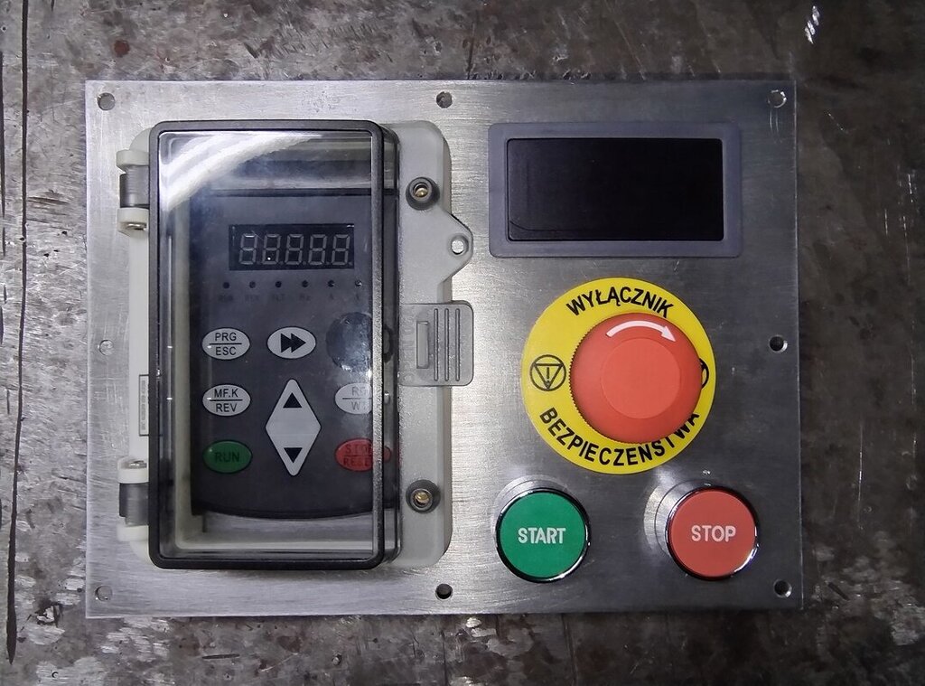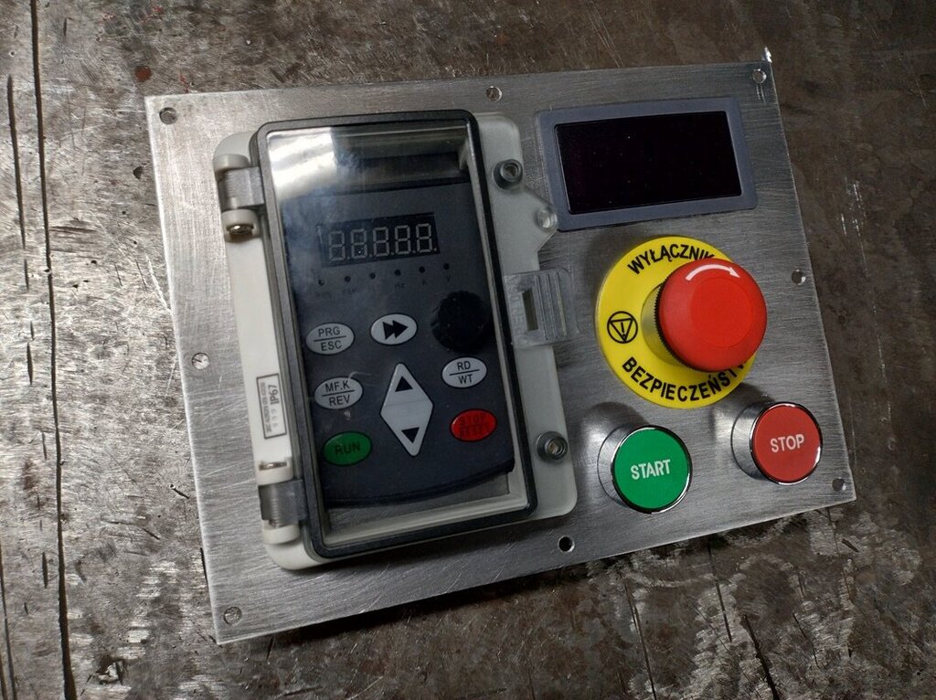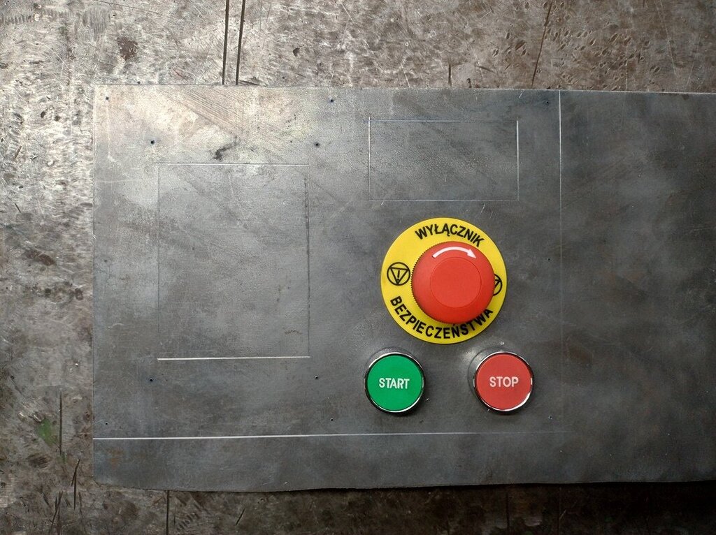 WITAM po przerwie. Aby nie było, że w temacie szlifierki nic się nie działo. Zdjęcia pokażą co i jak. Tak więc szlifierka otrzymała obiecane osłony przed iskrzeniem. Na ukończeniu jest też stolik pod szlifierkę. Stolik docelowo może stać na wkręcanych (regulowanych) stopach. Do przestawiania można opuszczać kółka za pomocą lewarków samochodowych i przestawić stolik, lub też tak pracować - koła są z hamulcami. Pozostało w zasadzie jeszcze wykonać oblachowanie szafki, uzupełnienie spawów, Wykonanie drzwiczek z przodu stolika, szlifowanie (oczyszczenie) i malowanie. Zakupiona na punkcie skupu złomu skrzynka elektryczna została trochę rozciągnięta (wspawane paski blachy). Ciężko było dopasować skrzynkę z odpowiednią głębokością i jednocześnie aby mieściła się w stoliku szlifierki. Skrzynka będzie wysuwana na zewnątrz na zwykłych szufladowych prowadnicach kulkowych. Sterowanie będzie z osobnego zewnętrznego panelu sterującego. Wykonałem też płytę czołową zewnętrznego panelu sterowania. W panelu z lewej strony w dodatkowej, zamykanej osłonie hermetycznej znajduje się dodatkowy, zewnętrzny manipulator sterowania falownikiem a nad przyciskiem wyłącznika bezpieczeństwa wyświetlacz indukcyjnego wskaźnika obrotów silnika napędowego. Panel będzie zamontowany na regulowanych ramionach tak, aby dowolnie do własnych potrzeb można byłoby ustawiać położenie panelu. No i oczywiście wstępne projekty naklejek. Niebieska naklejka będzie umieszczona na górnej osłonie z przodu szlifierki. Cdn.