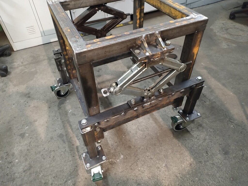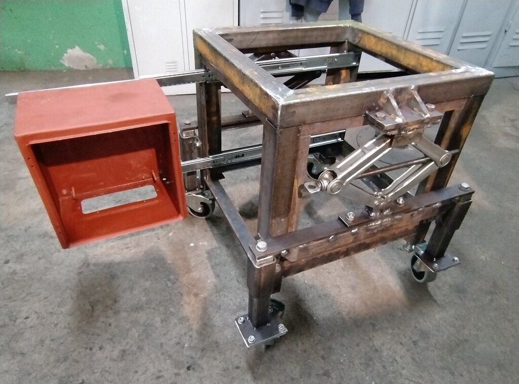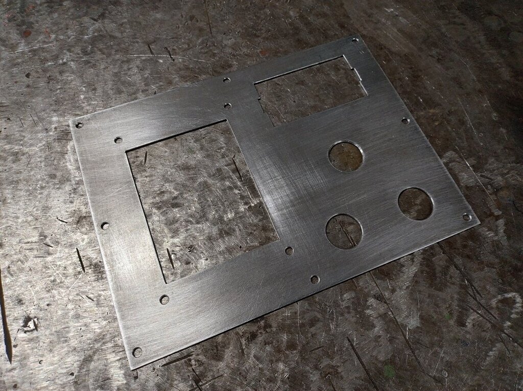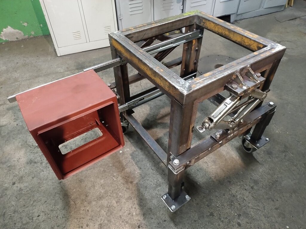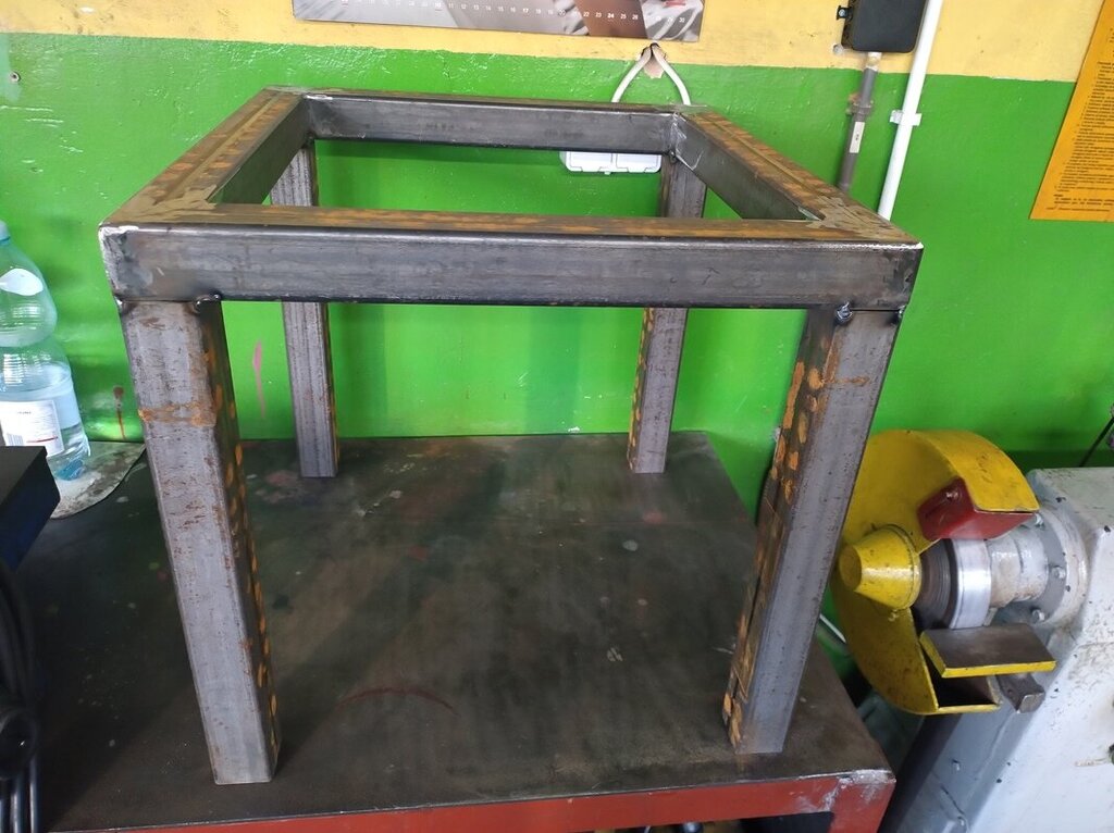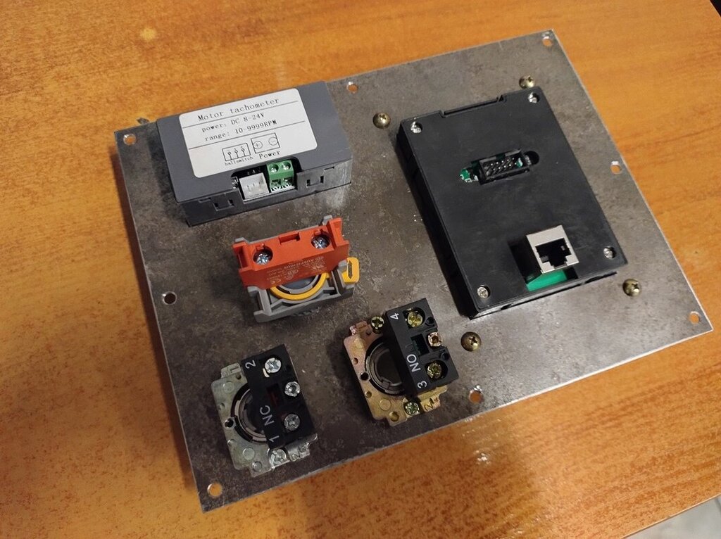 WITAM po przerwie. Aby nie było, że w temacie szlifierki nic się nie działo. Zdjęcia pokażą co i jak. Tak więc szlifierka otrzymała obiecane osłony przed iskrzeniem. Na ukończeniu jest też stolik pod szlifierkę. Stolik docelowo może stać na wkręcanych (regulowanych) stopach. Do przestawiania można opuszczać kółka za pomocą lewarków samochodowych i przestawić stolik, lub też tak pracować - koła są z hamulcami. Pozostało w zasadzie jeszcze wykonać oblachowanie szafki, uzupełnienie spawów, Wykonanie drzwiczek z przodu stolika, szlifowanie (oczyszczenie) i malowanie. Zakupiona na punkcie skupu złomu skrzynka elektryczna została trochę rozciągnięta (wspawane paski blachy). Ciężko było dopasować skrzynkę z odpowiednią głębokością i jednocześnie aby mieściła się w stoliku szlifierki. Skrzynka będzie wysuwana na zewnątrz na zwykłych szufladowych prowadnicach kulkowych. Sterowanie będzie z osobnego zewnętrznego panelu sterującego. Wykonałem też płytę czołową zewnętrznego panelu sterowania. W panelu z lewej strony w dodatkowej, zamykanej osłonie hermetycznej znajduje się dodatkowy, zewnętrzny manipulator sterowania falownikiem a nad przyciskiem wyłącznika bezpieczeństwa wyświetlacz indukcyjnego wskaźnika obrotów silnika napędowego. Panel będzie zamontowany na regulowanych ramionach tak, aby dowolnie do własnych potrzeb można byłoby ustawiać położenie panelu. No i oczywiście wstępne projekty naklejek. Niebieska naklejka będzie umieszczona na górnej osłonie z przodu szlifierki. Cdn.
