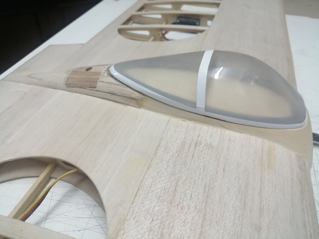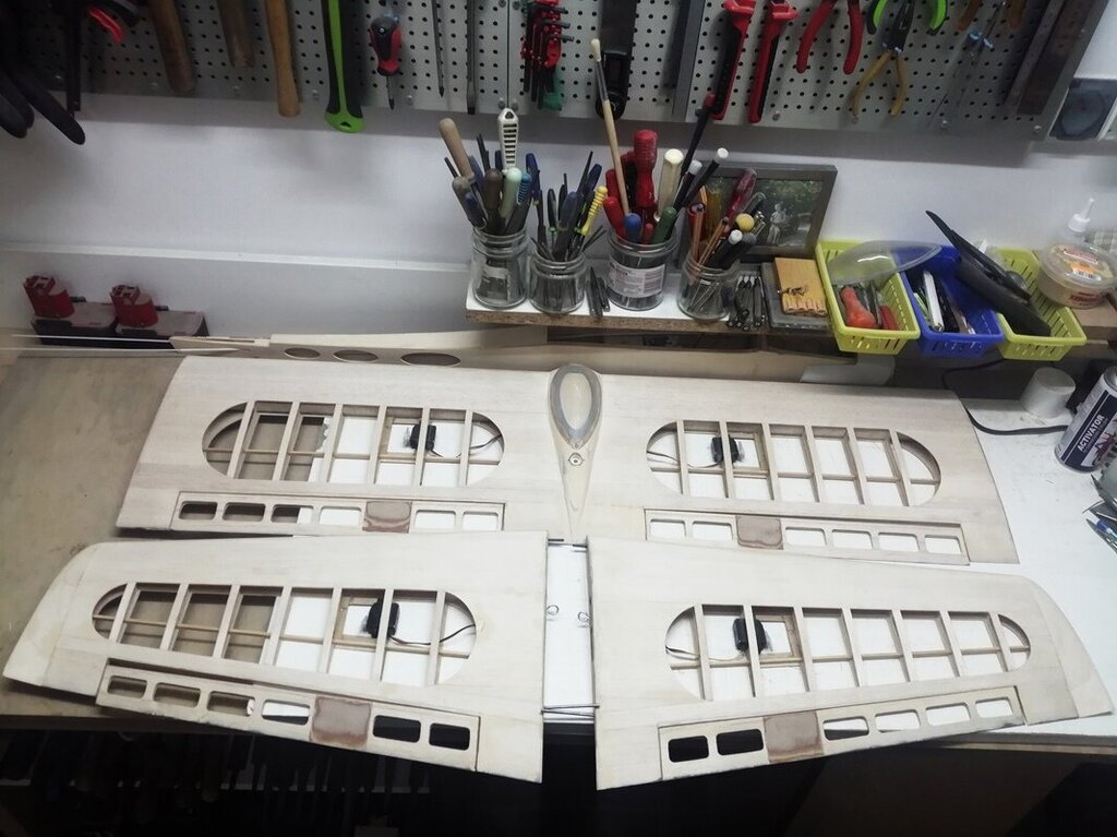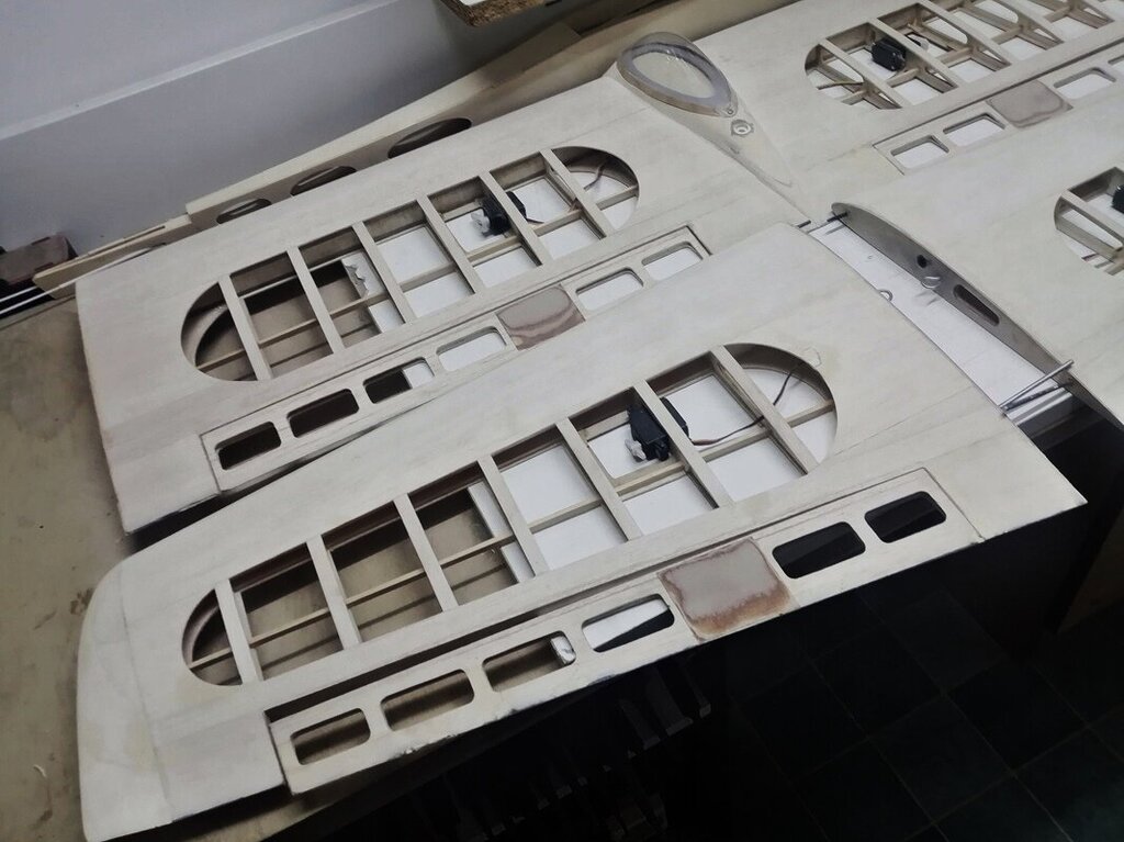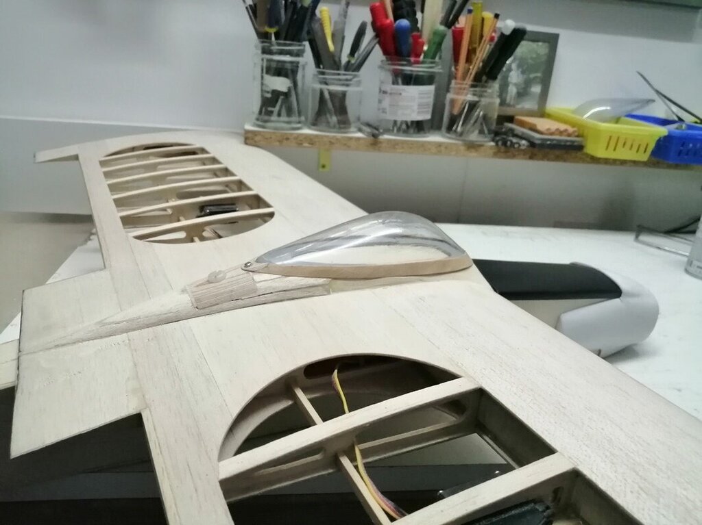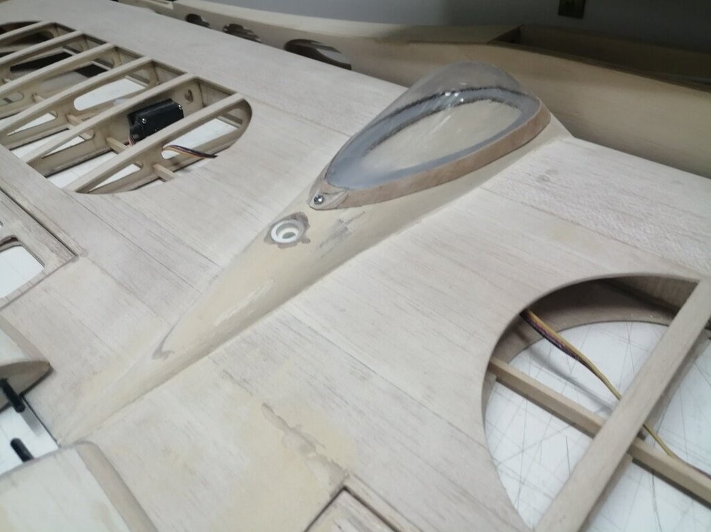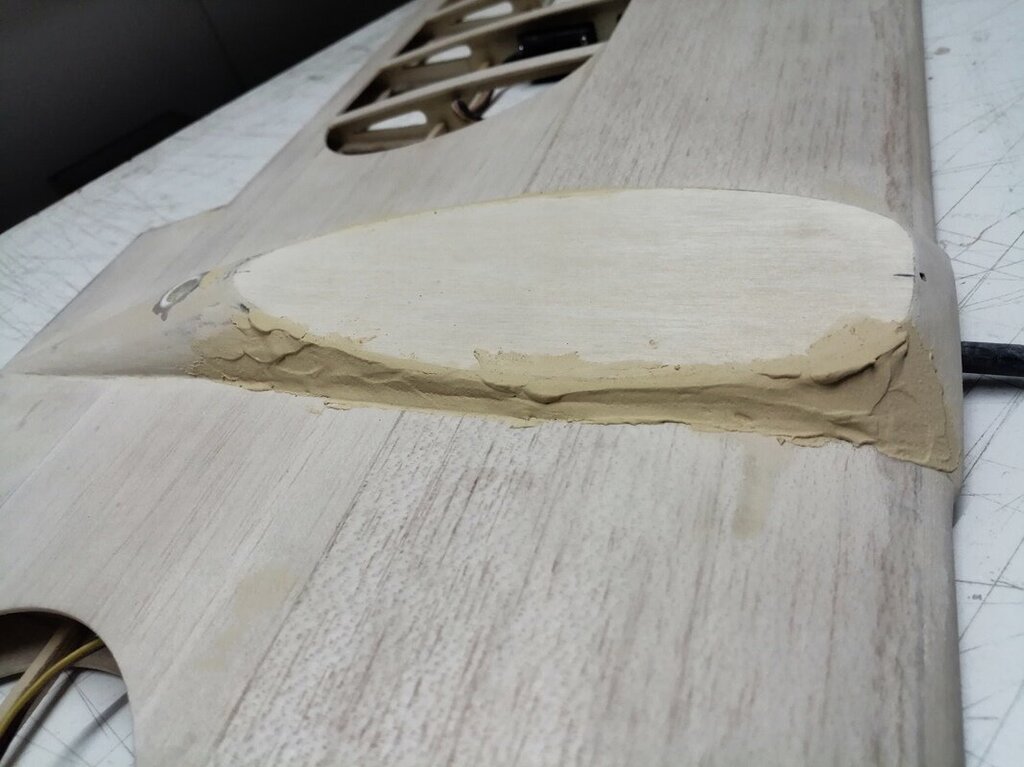No to wracamy do tematu SZYBOLOTA. Podstawa kabinki przeszpachlowana, przeszlifowana i spasowana z pseudo kabinką. Pokusiłem się też o samodzielne wykonanie zamka przedniej części góry kadłuba - czarna na zdjęciach. Zamontowane zostały serwa klap i lotek i zostały do nich dorobione przedłużacze. Klapy będą wpięte na jednym kanale poprzez V-kabel. Jedna z klap musi przez to pracować z wpiętym rewersem serwa - muszę jeszcze uporządkować przewody. Przeszlifowałem też natarcia lotek i klap - za radą kolegów z forum zamiast tradycyjnych zawiasków zastosuję zawiasy na taśmie. Miejsca mocowania dźwigni klap i kotek wzmocniłem sklejką 0,4mm. W zasadzie skrzydło można będzie oklejać. A tak to wygląda: