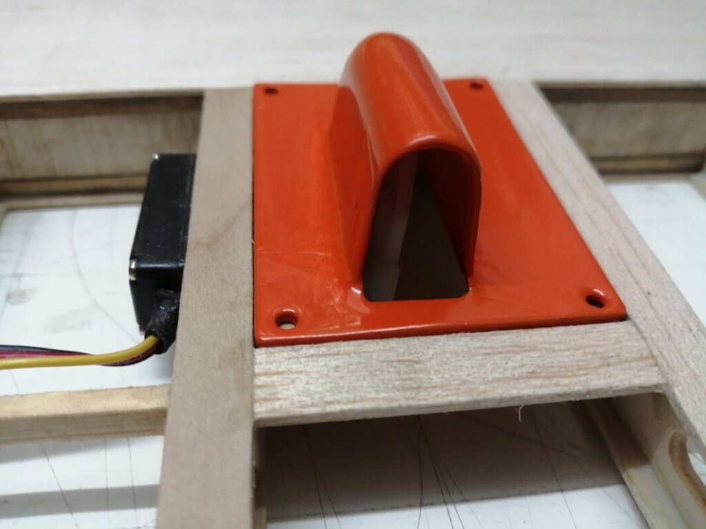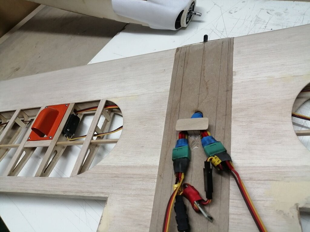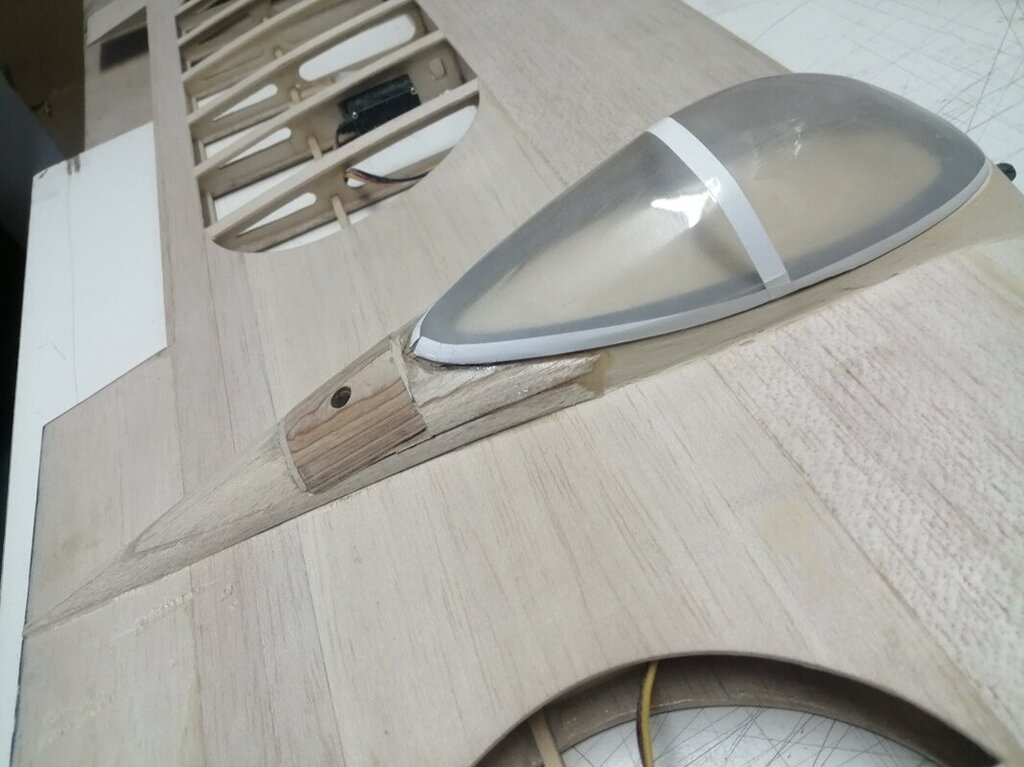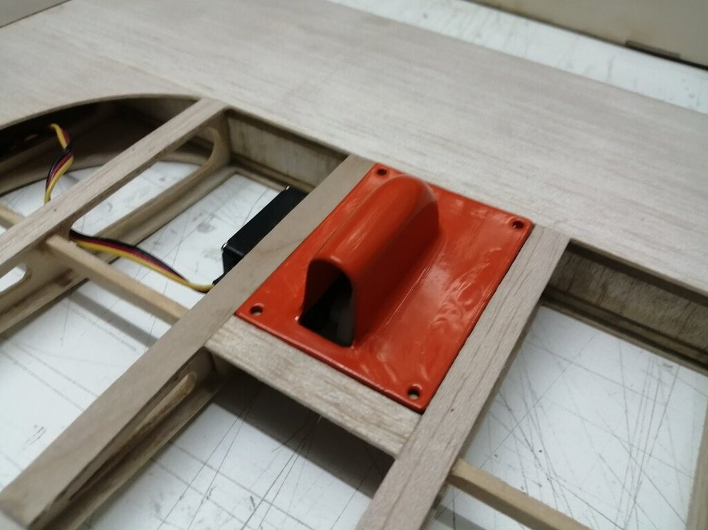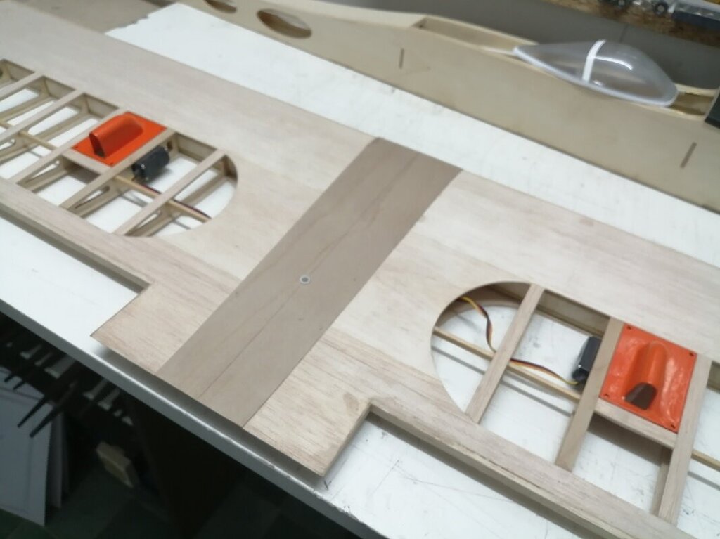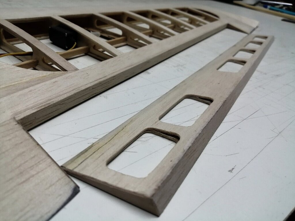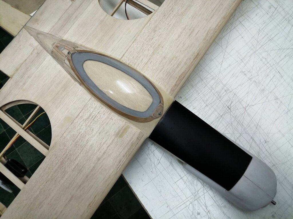 No to wracamy do tematu SZYBOLOTA. Podstawa kabinki przeszpachlowana, przeszlifowana i spasowana z pseudo kabinką. Pokusiłem się też o samodzielne wykonanie zamka przedniej części góry kadłuba - czarna na zdjęciach. Zamontowane zostały serwa klap i lotek i zostały do nich dorobione przedłużacze. Klapy będą wpięte na jednym kanale poprzez V-kabel. Jedna z klap musi przez to pracować z wpiętym rewersem serwa - muszę jeszcze uporządkować przewody. Przeszlifowałem też natarcia lotek i klap - za radą kolegów z forum zamiast tradycyjnych zawiasków zastosuję zawiasy na taśmie. Miejsca mocowania dźwigni klap i kotek wzmocniłem sklejką 0,4mm. W zasadzie skrzydło można będzie oklejać. A tak to wygląda:
