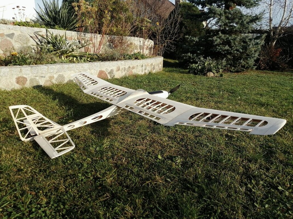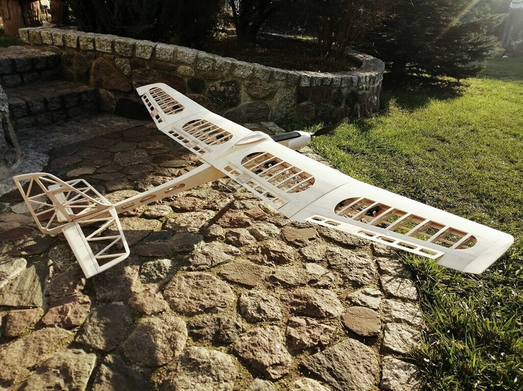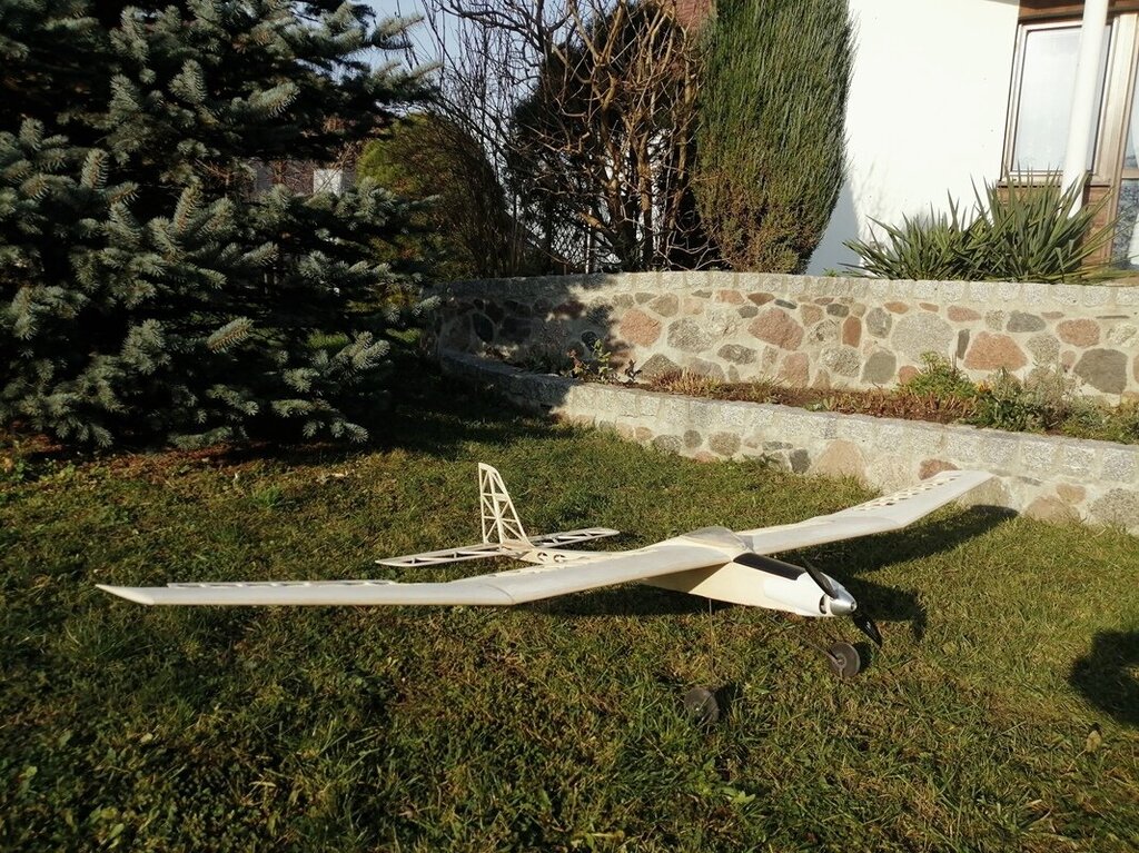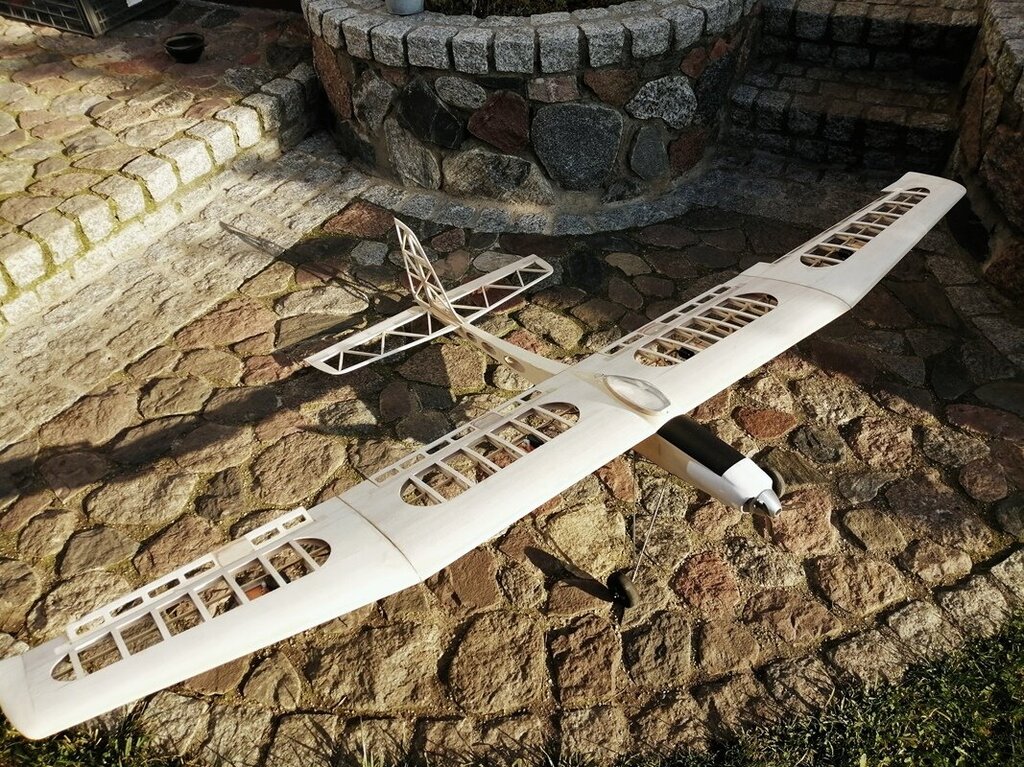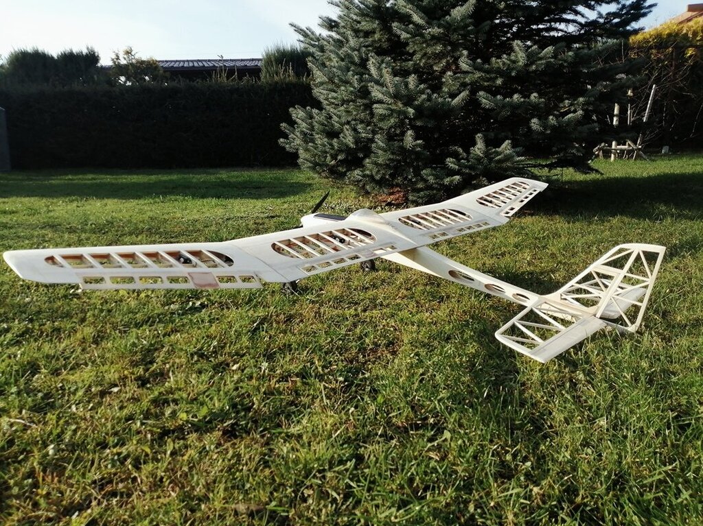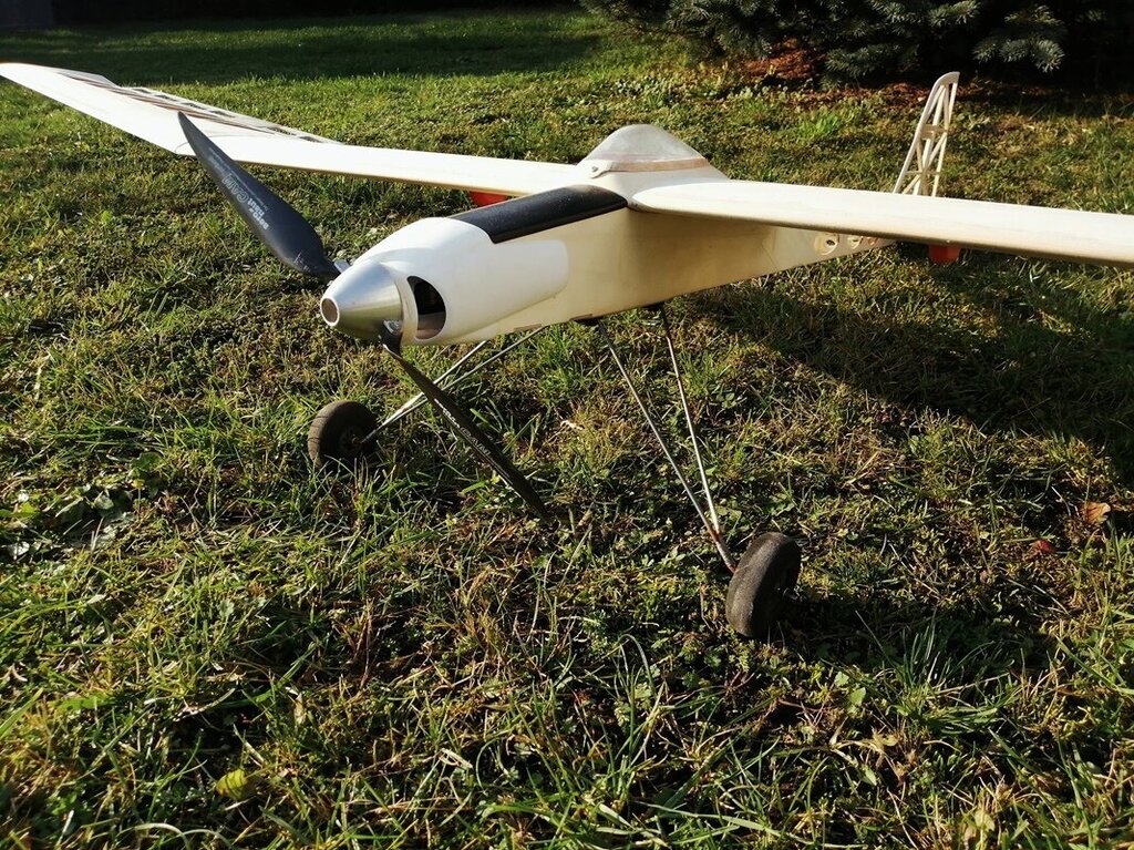 To co widać plus całe wyposażenie wychodzi 2100g. dojdą jeszcze jakeś cięgna klap i lotek, dźwignie, snapy, folia. Do lotów motoszybowcowych mam zamiar zdejmować podwozie, lub wykonać inne, lżejsze - tak, jak pisałem wcześniej z jednym kołem, co powinno zdjąć nieco wagi. To obecne samolotowe waży ok 100g. Powierzchnię nośną ma 50dm2.