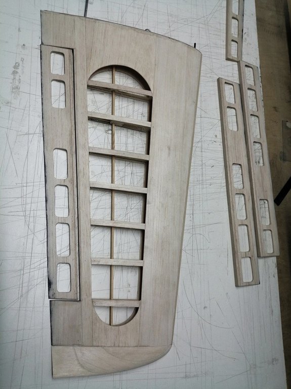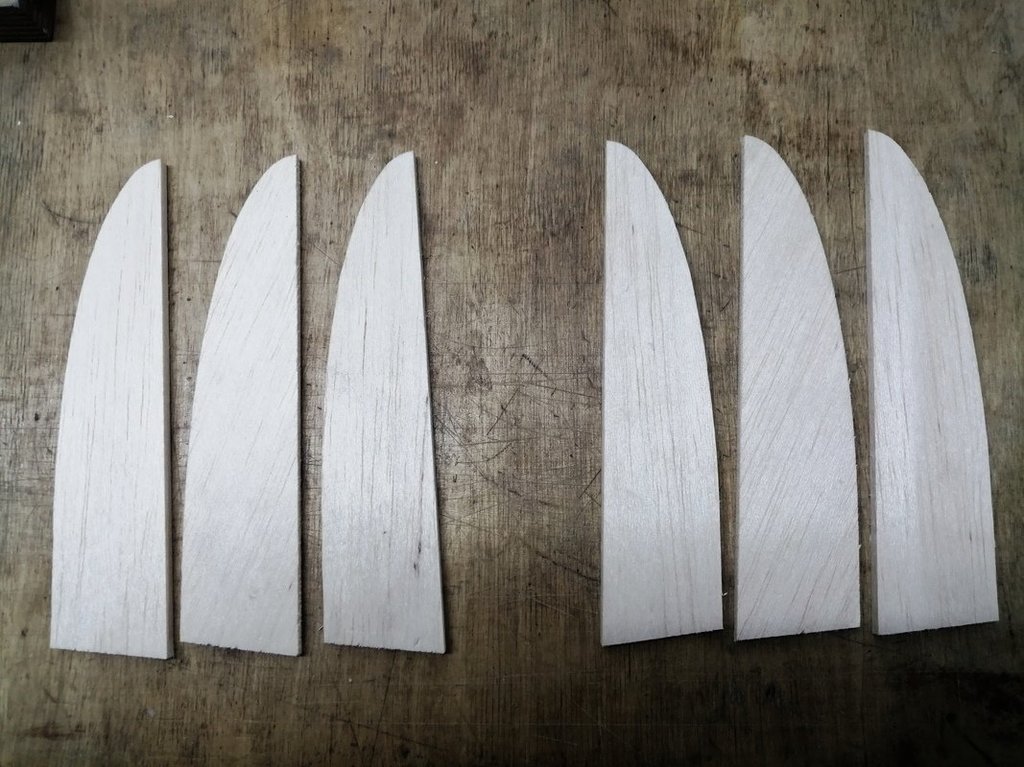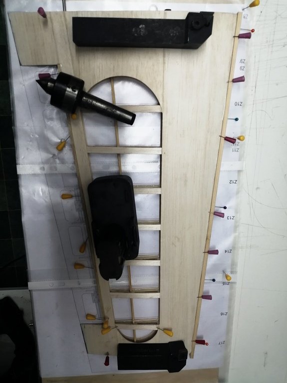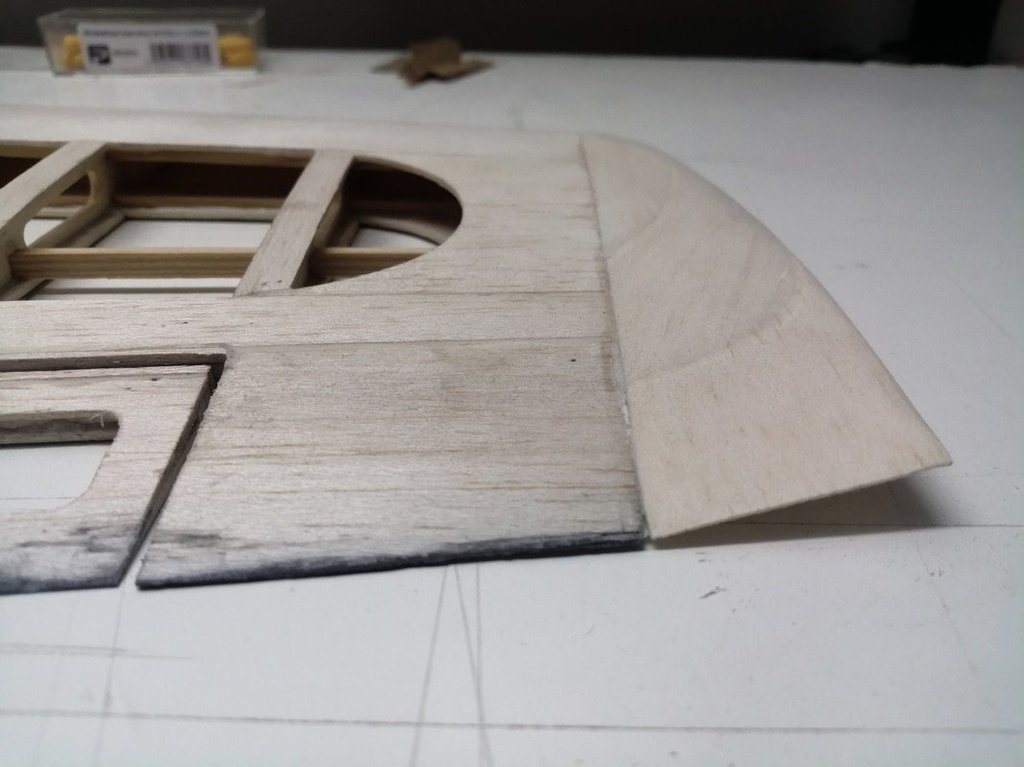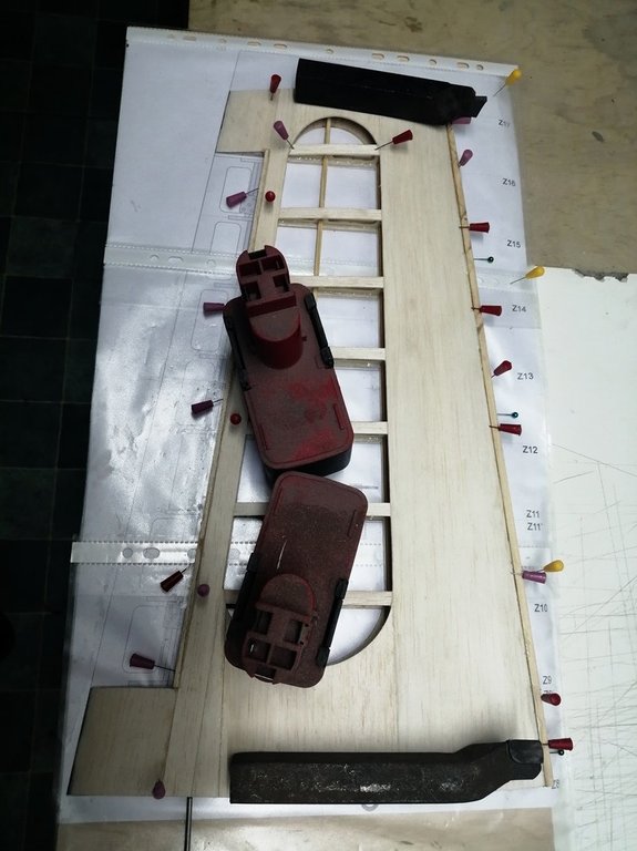 Prace trwają. Obróbka uszu - przeszlifowane listwy (lipowe krawędzie natarcia, balsowe listwy mocowania lotek oraz listwy lotek). Wklejone przy pomocy ,,drobnego,, przyrządu ustalającego dokładny kąt i powierzchnię przyłożenia końcowe - zamykające, sklejkowe żebra ucha. Wstępnie przygotowane balsowe końcówki uszu.