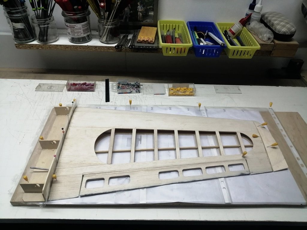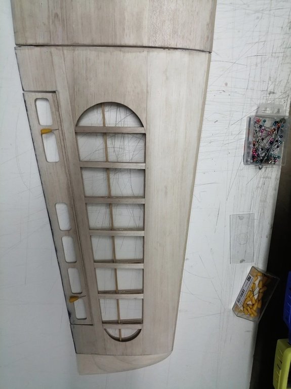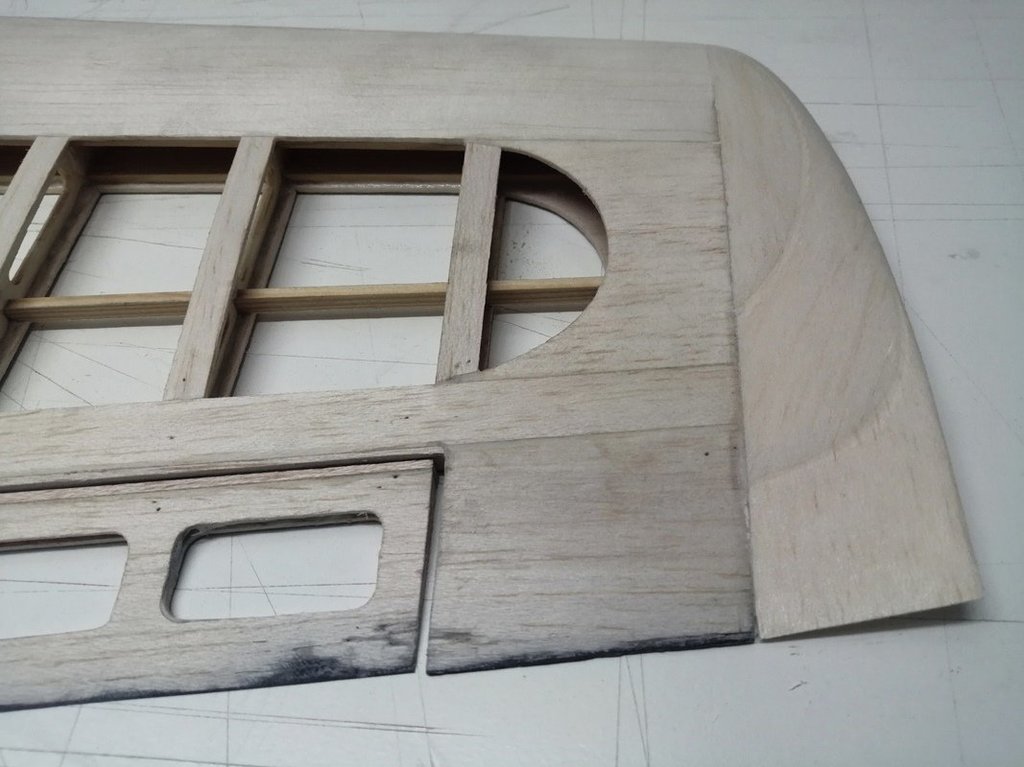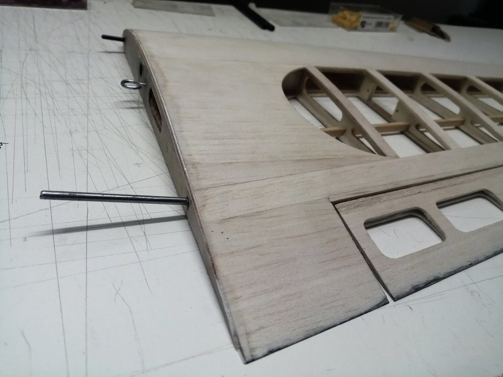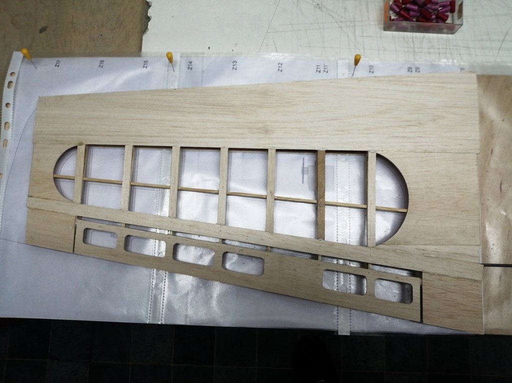 Prace trwają. Obróbka uszu - przeszlifowane listwy (lipowe krawędzie natarcia, balsowe listwy mocowania lotek oraz listwy lotek). Wklejone przy pomocy ,,drobnego,, przyrządu ustalającego dokładny kąt i powierzchnię przyłożenia końcowe - zamykające, sklejkowe żebra ucha. Wstępnie przygotowane balsowe końcówki uszu.