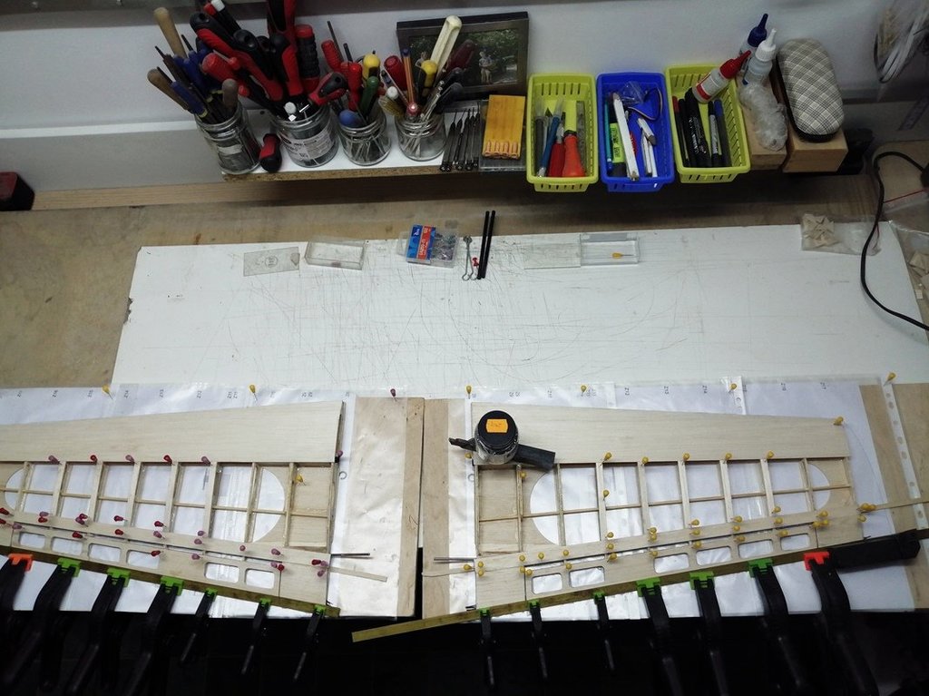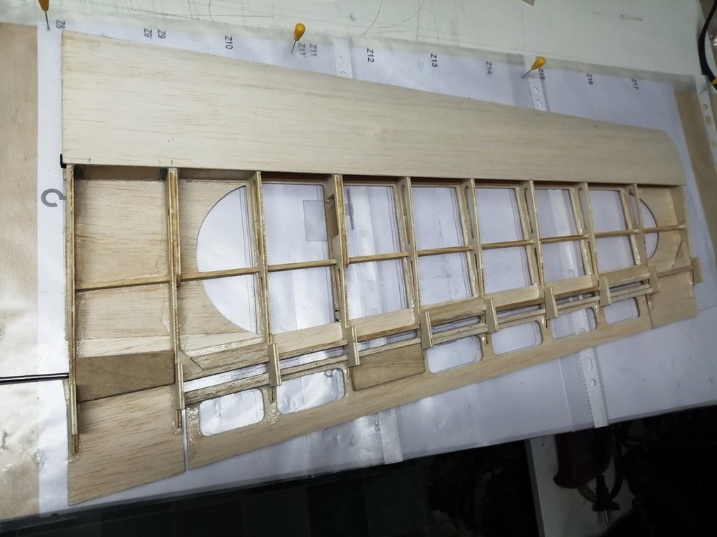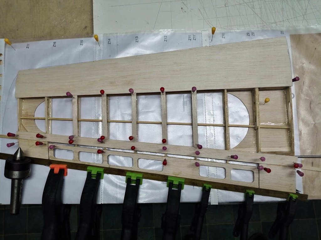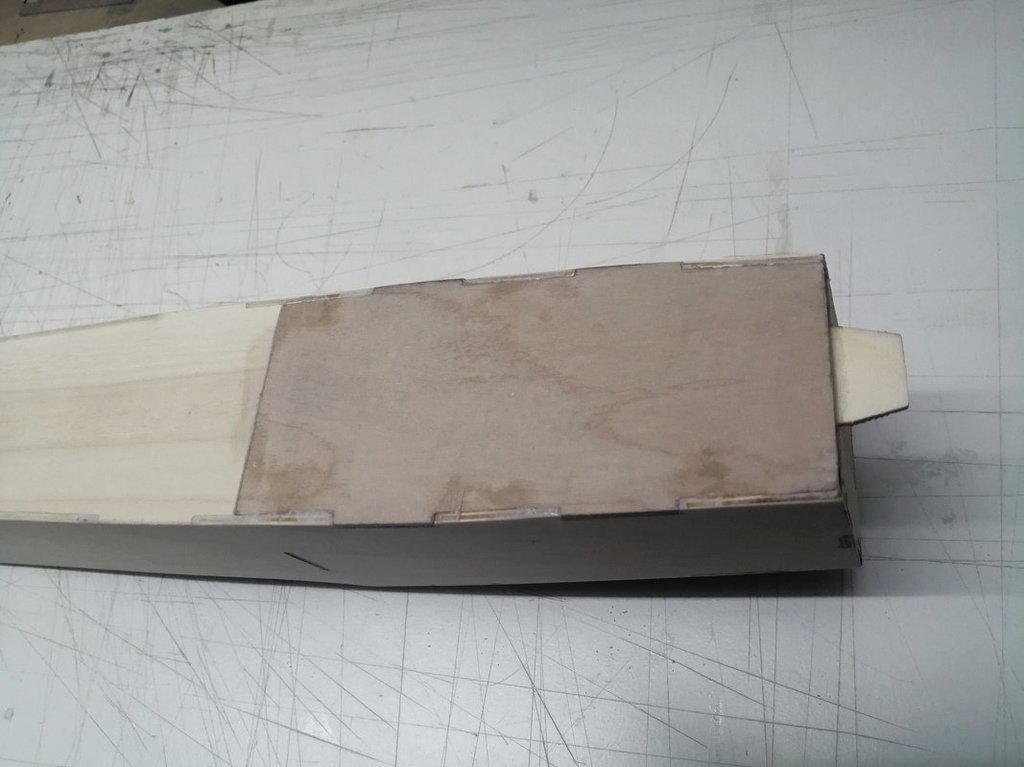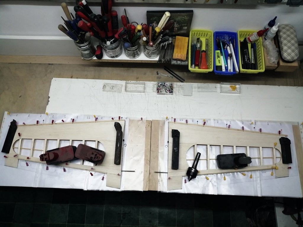 Dzięki za słowa wsparcia. Poszycie dolne uszu wklejone. Po usunięciu dystansów ustalających żeberek i oszlifowaniu górnych części przyszła kolej na przyklejenie poszycia górnego. Oczywiście w krawędzi spływu dla wzmocnienia wklejony został rowing węglowy a końcówki żeberek wzmocnione paseczkami tkaniny szklanej przechodzącymi na rowing. Pozostały jeszcze do wklejenia fragmenty balsy z łukami. A tak to wygląda: