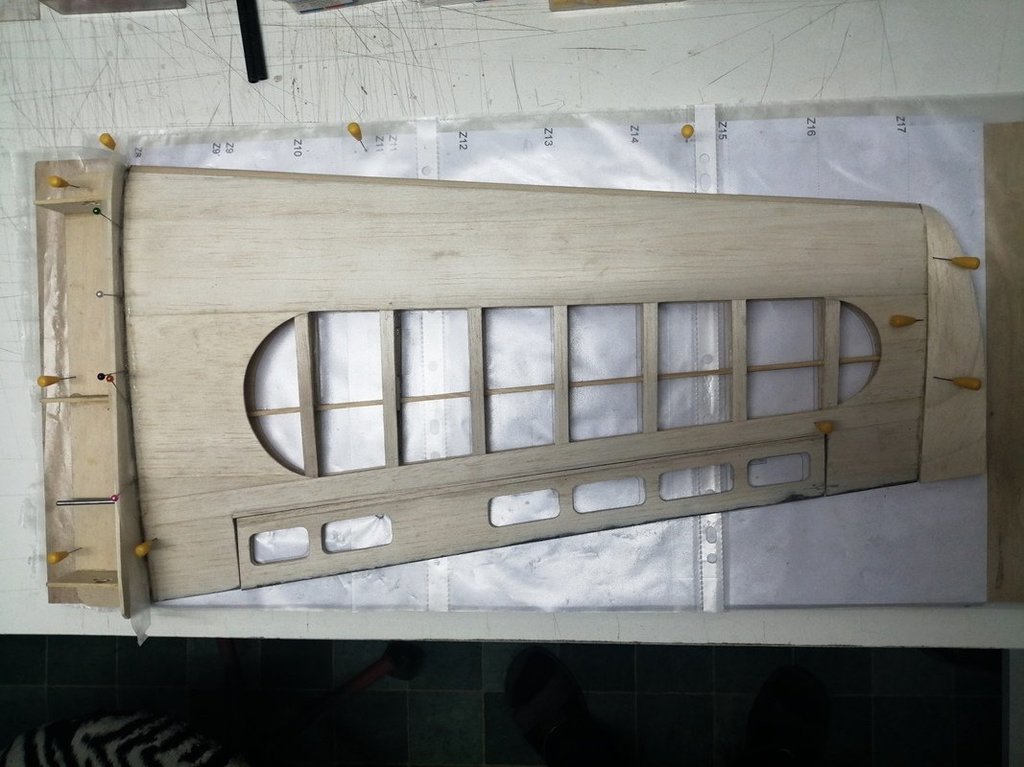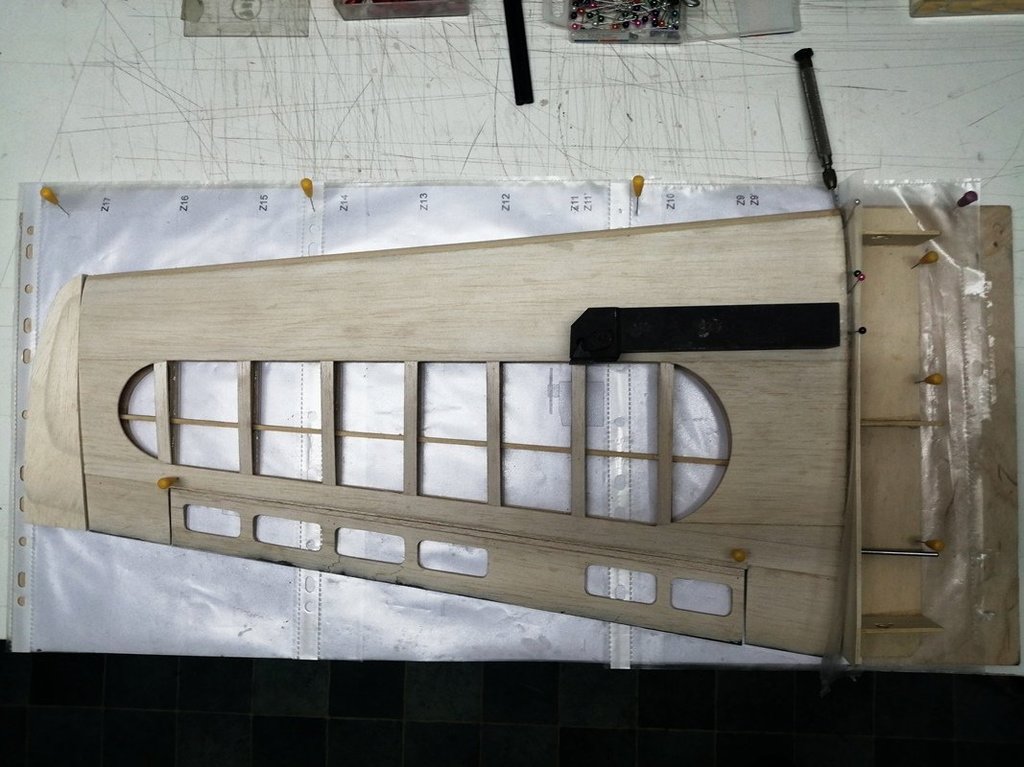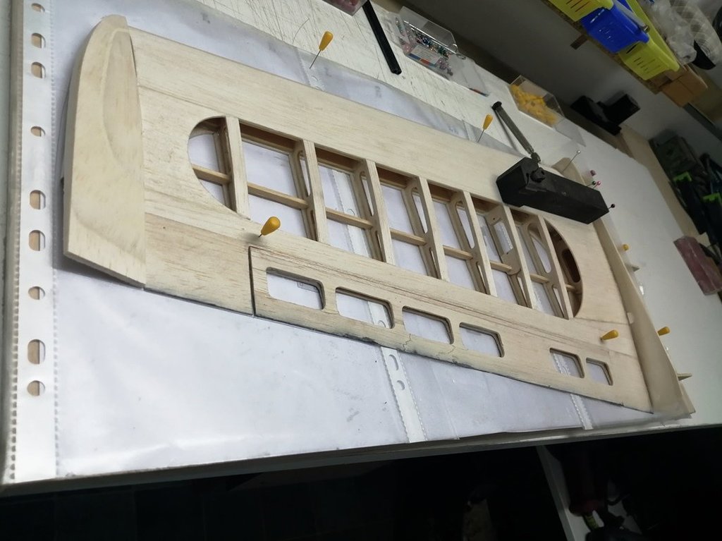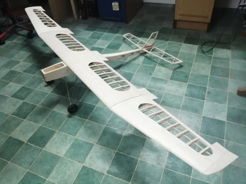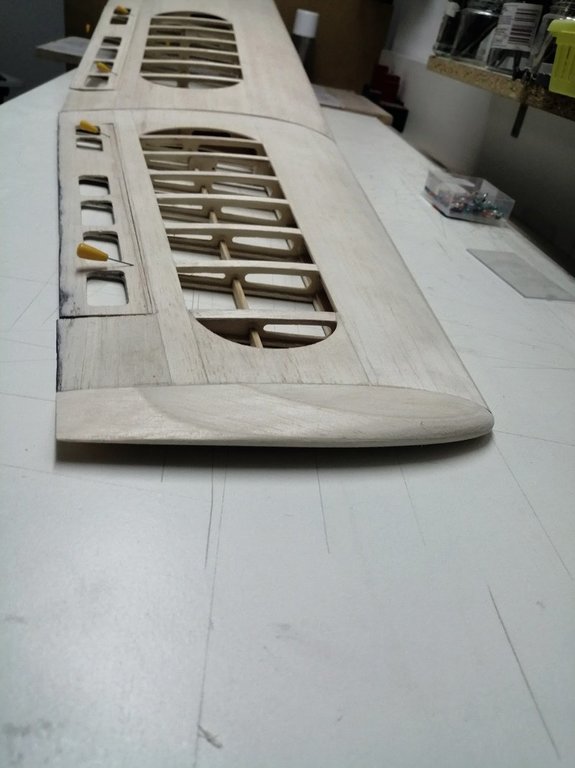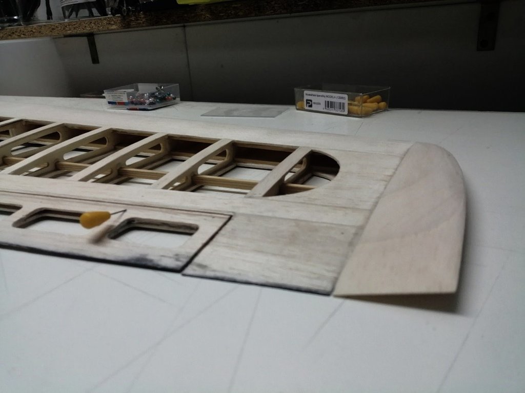 Dzięki za słowa wsparcia. Poszycie dolne uszu wklejone. Po usunięciu dystansów ustalających żeberek i oszlifowaniu górnych części przyszła kolej na przyklejenie poszycia górnego. Oczywiście w krawędzi spływu dla wzmocnienia wklejony został rowing węglowy a końcówki żeberek wzmocnione paseczkami tkaniny szklanej przechodzącymi na rowing. Pozostały jeszcze do wklejenia fragmenty balsy z łukami. A tak to wygląda: