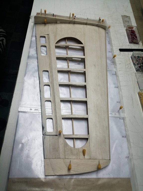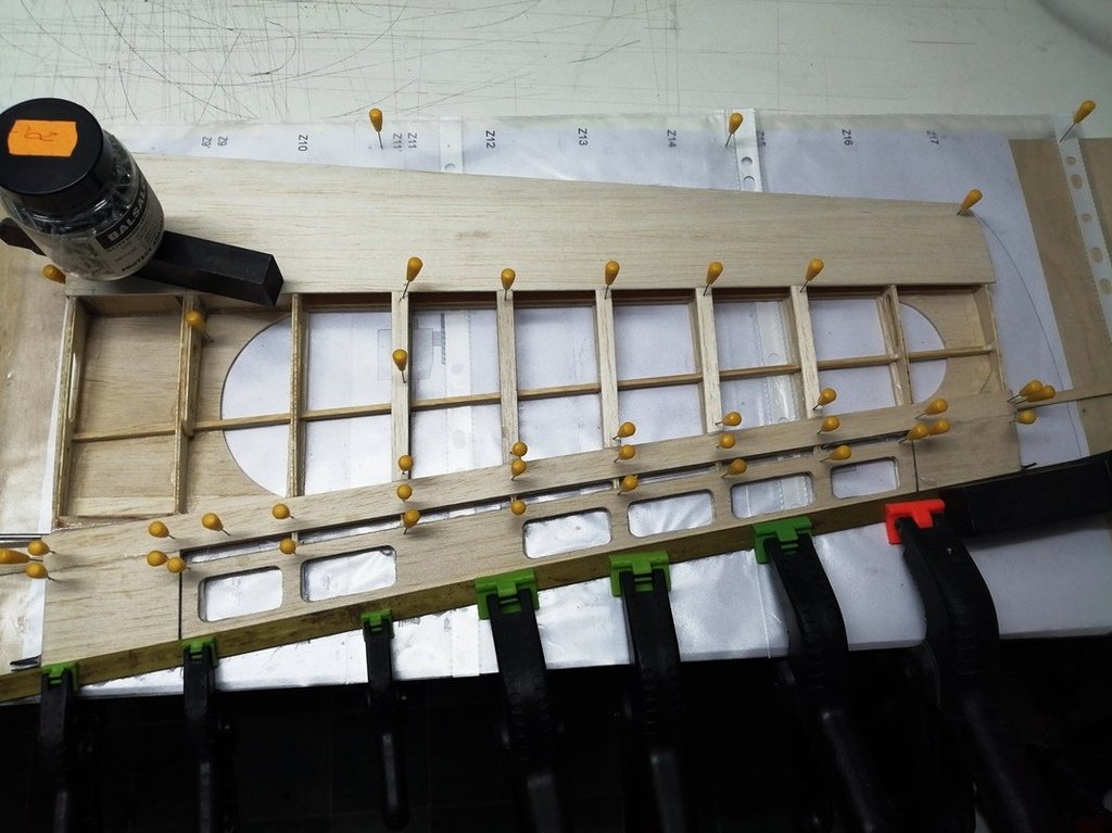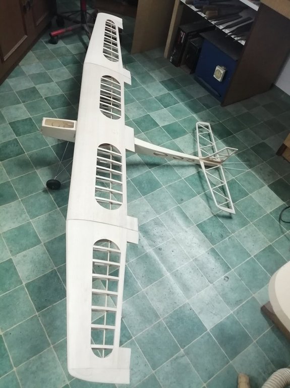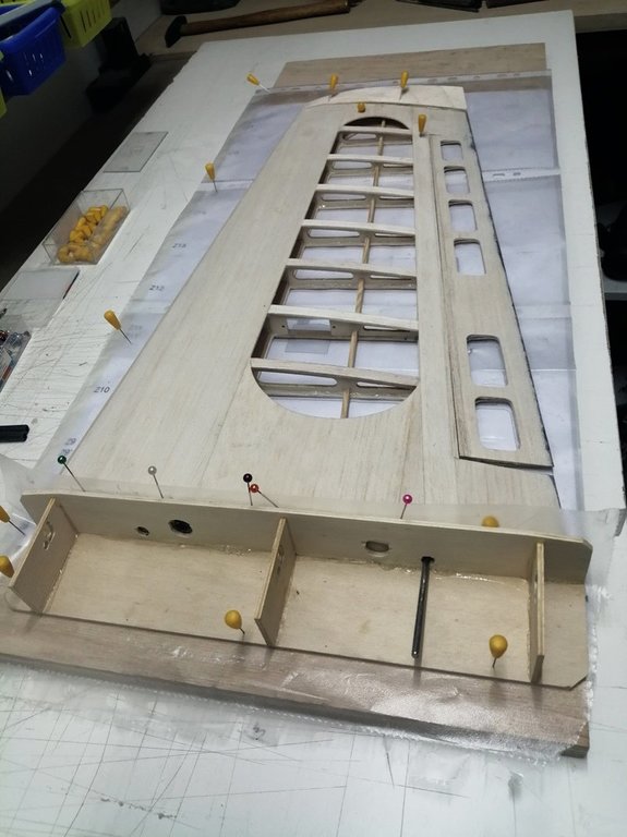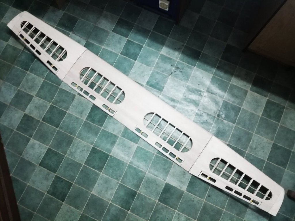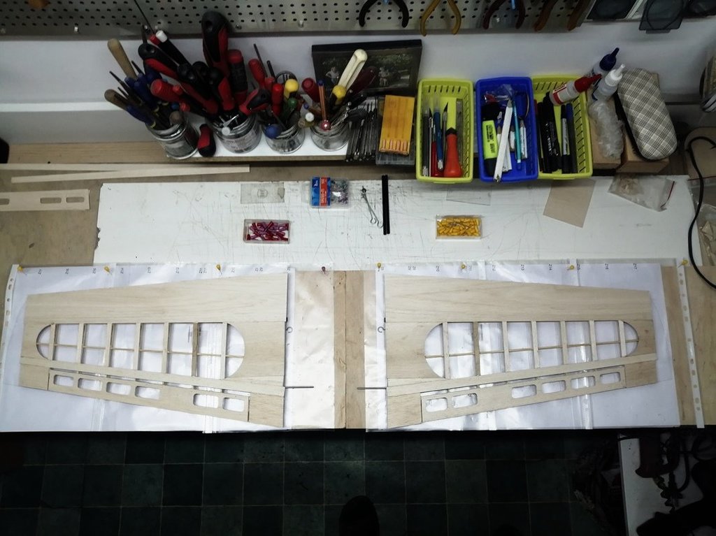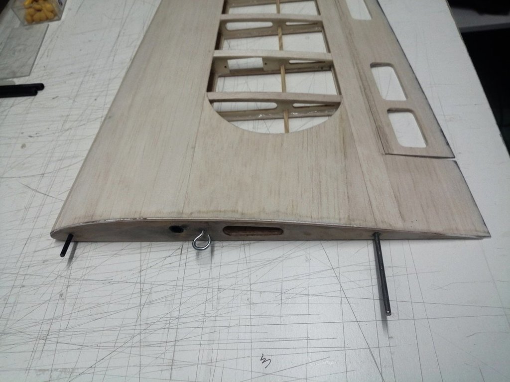 Dzięki za słowa wsparcia. Poszycie dolne uszu wklejone. Po usunięciu dystansów ustalających żeberek i oszlifowaniu górnych części przyszła kolej na przyklejenie poszycia górnego. Oczywiście w krawędzi spływu dla wzmocnienia wklejony został rowing węglowy a końcówki żeberek wzmocnione paseczkami tkaniny szklanej przechodzącymi na rowing. Pozostały jeszcze do wklejenia fragmenty balsy z łukami. A tak to wygląda: