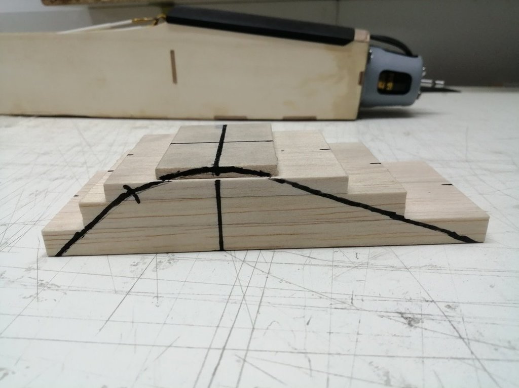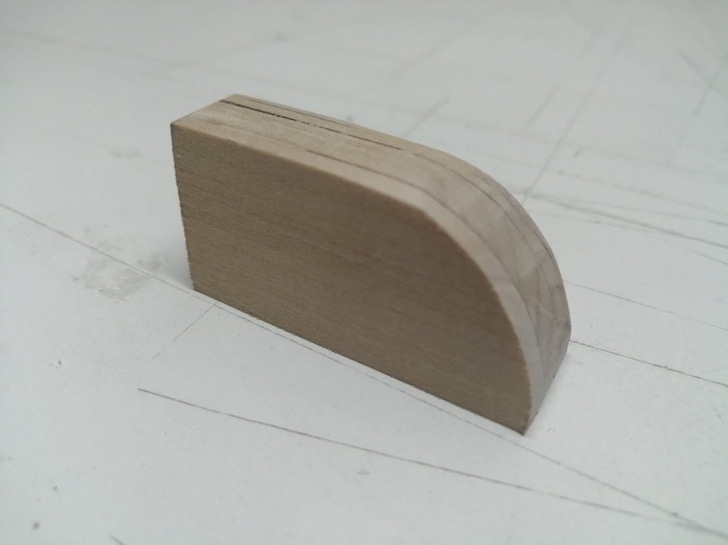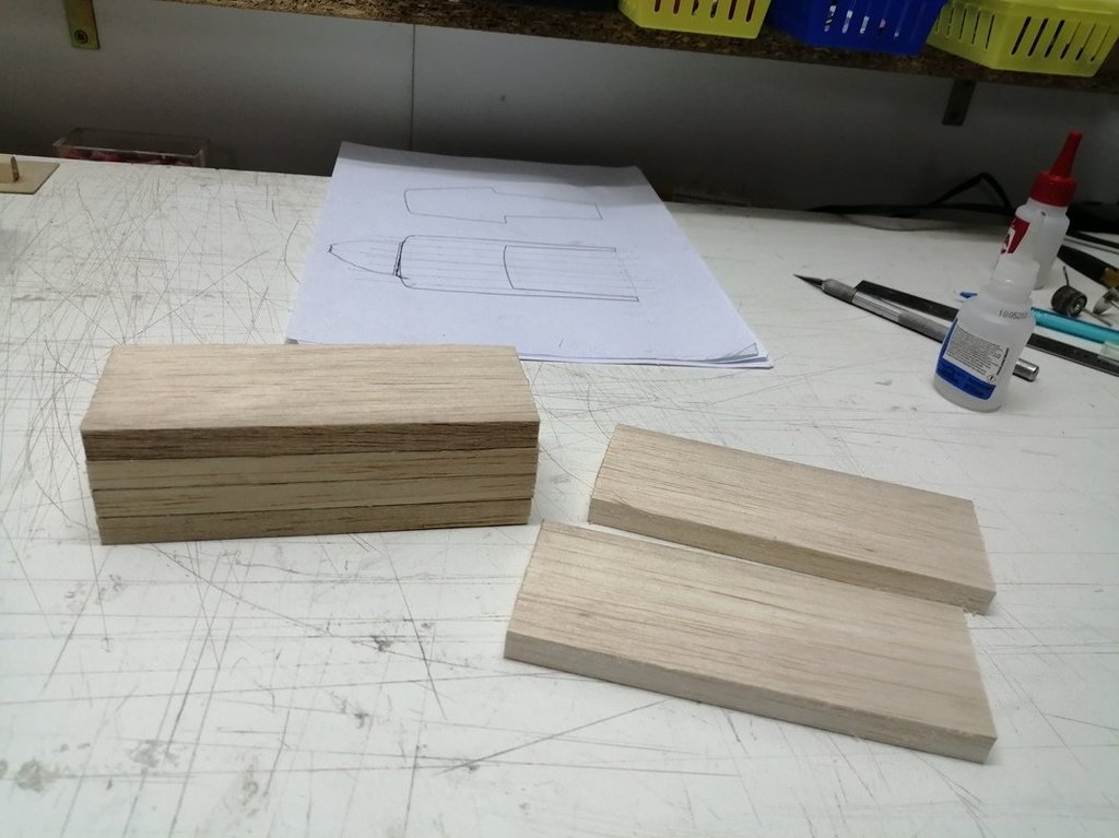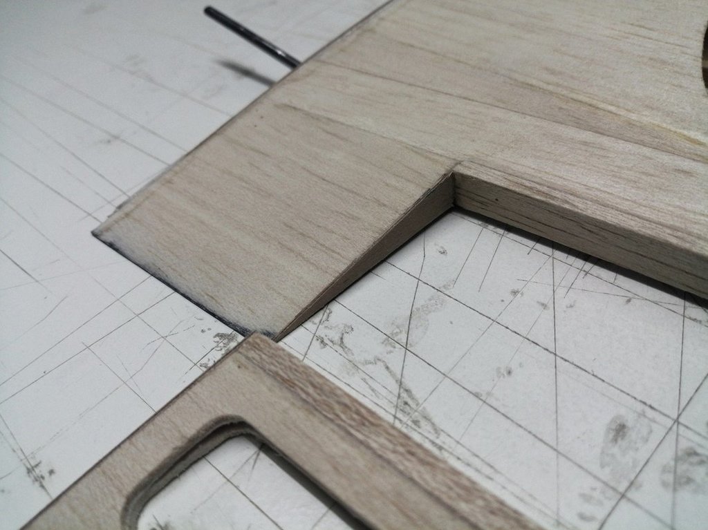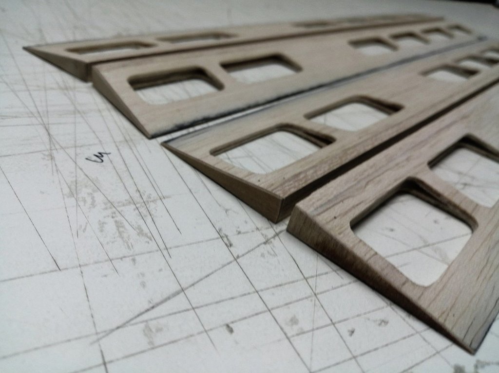 Dalsze prace. Dzisiaj może niewiele. Wyfrezowane i sklejone z trzech warstw balsy 5 mm końcówki uszu SZYBOLOTA. Przygotowałem też prosty przyrząd do ostatecznego dokładnego wklejenia pod kątem 5stopni końcowych zamykających sklejkowych żeber. Zdjęcia może nie są najlepszej jakości - robione na szybko komórką.