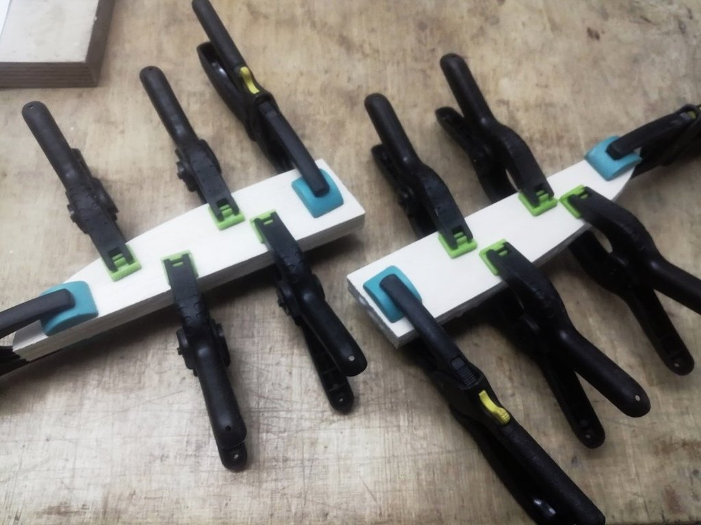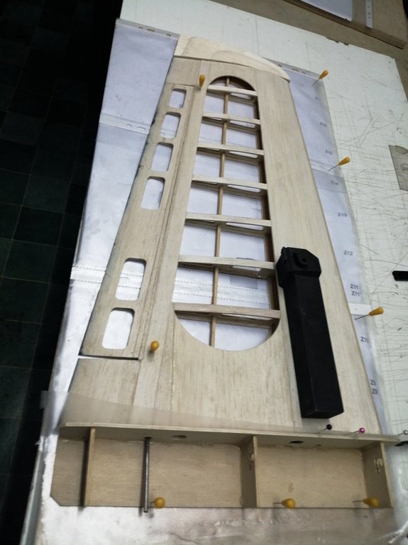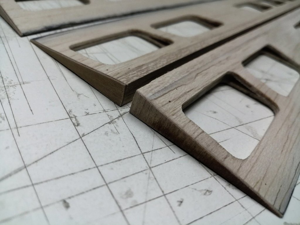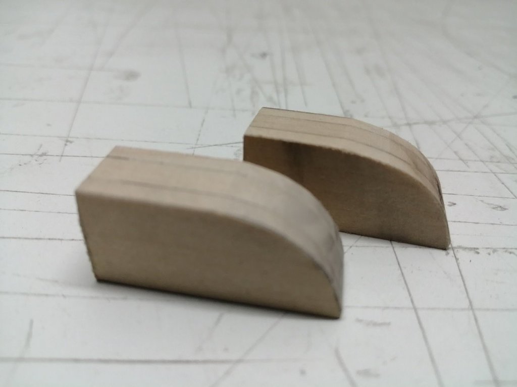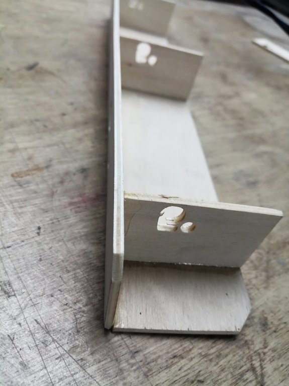 Dalsze prace. Dzisiaj może niewiele. Wyfrezowane i sklejone z trzech warstw balsy 5 mm końcówki uszu SZYBOLOTA. Przygotowałem też prosty przyrząd do ostatecznego dokładnego wklejenia pod kątem 5stopni końcowych zamykających sklejkowych żeber. Zdjęcia może nie są najlepszej jakości - robione na szybko komórką.