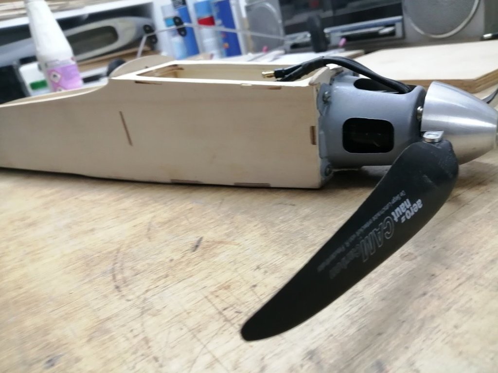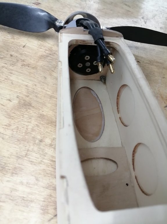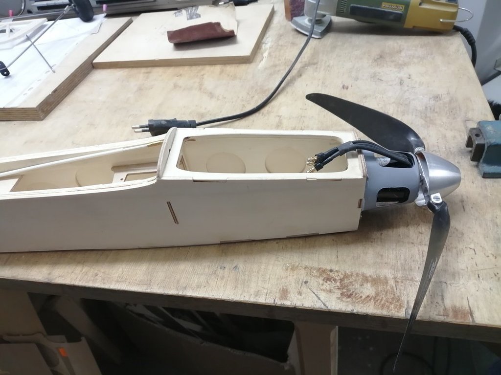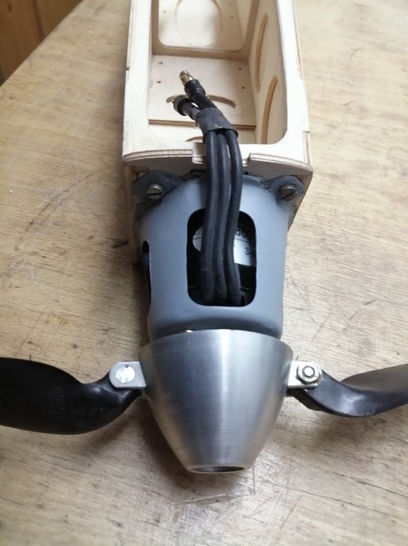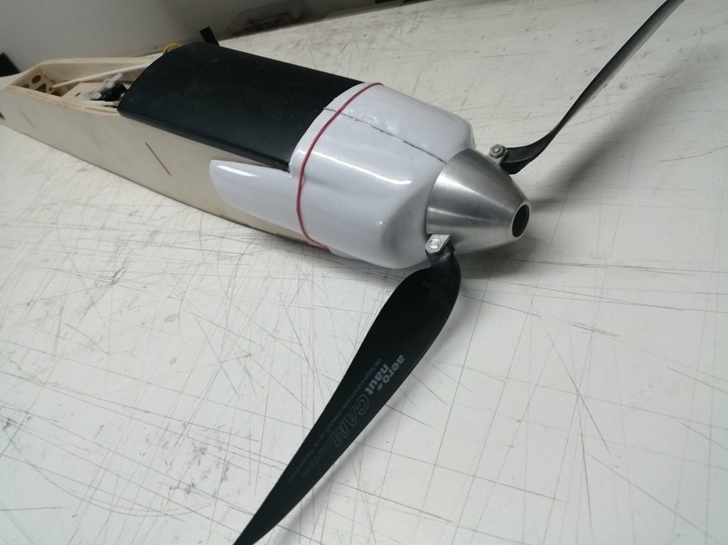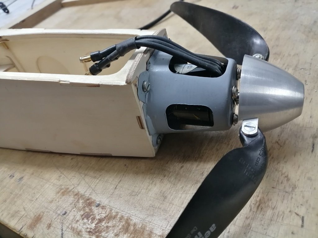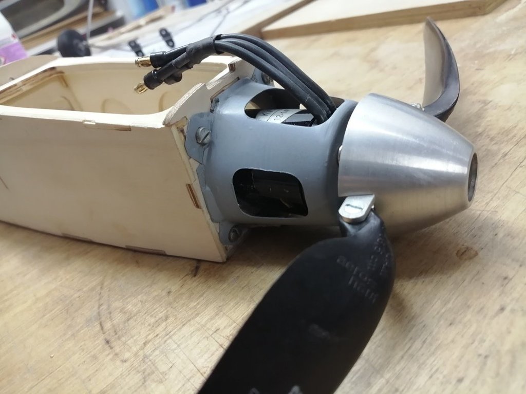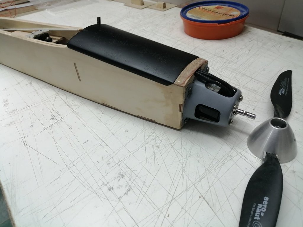 Tak, nawet przymierzałem się do takiego zamocowania silnika, ale w tym układzie musiałbym zamontować przykręcaną piastę z większym fi wału piasty - raczej dla stałego śmigła - wszystkie kołpaki dla składanych śmigieł, które posiadam są pod fi wału 5mm a nie chcę nadto nadwyrężać budżetu na kolejne kołpaki - zwłaszcza, że kolejny model planuję nieco inny. Mogłem również zamontować silnik po wewnętrznej stronie wręgi, ale wtedy wał 5mm stawał się trochę przykrótki oraz tak, jak już wcześniej pisałem kolizyjna by była dla śmigła składanego kwadratura przodu kadłuba. Ryzyka przytarcia przewodów nie ma - jest jeszcze spory zapas luzu, co przy umocowaniu przewodów nie stanowi problemu. Za to w kabince kadłuba zyskuję dodatkową przestrzeń do ew. umieszczenia regulatora - tak wiem, że są to dodatkowe gramy wagi przed środkiem ciężkości, ale zobaczymy - zawsze regulator mogę wycofać bardziej do tyłu. Tak, jak piszesz może projekt jest trochę szalony, ale już sama budowa sprawia mi sporo satysfakcji - jak to mówią nasi zachodni sąsiedzi ,,halb und halb,, w stosunku do latania i osiągów modelu. Mam świadomość tego, że coś zyskuję i coś tracę - ot taki sobie lokalny experyment. A tak swoją drogą, to dzięki za opinie.