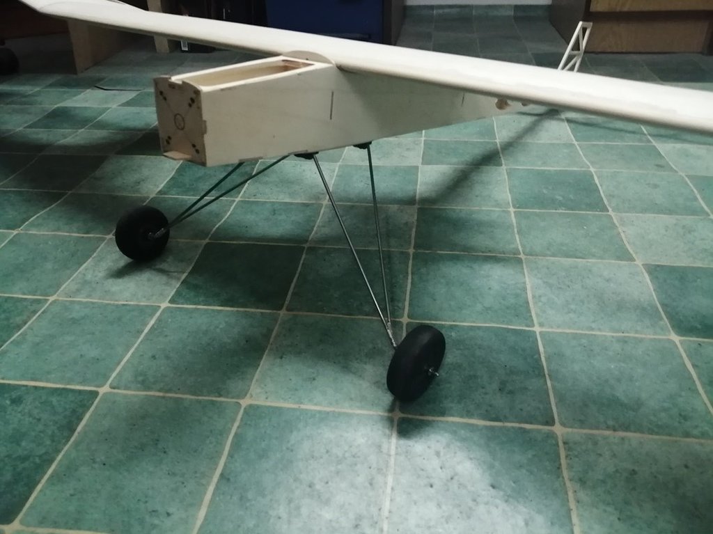 No to powoli dalej do przodu. Zmieniła się koncepcja goleni podwozia. Planowany był płaskownik duraluminiowy, jednak zdecydowałem się na wykonanie goleni podwozia z drutu stalowego fi 3mm, co zaowocowało zmianą przodu dolnej części kadłuba - wklejone dwie szt. sklejki - 1,5mm oraz 1mm. Wykonałem też sklejkowe zakończenia lotek, klap oraz wykończenia brzegów lotek i klap w centropłacie i uszach. Następnie pierwsze przymiarki położenia akumulatora.
