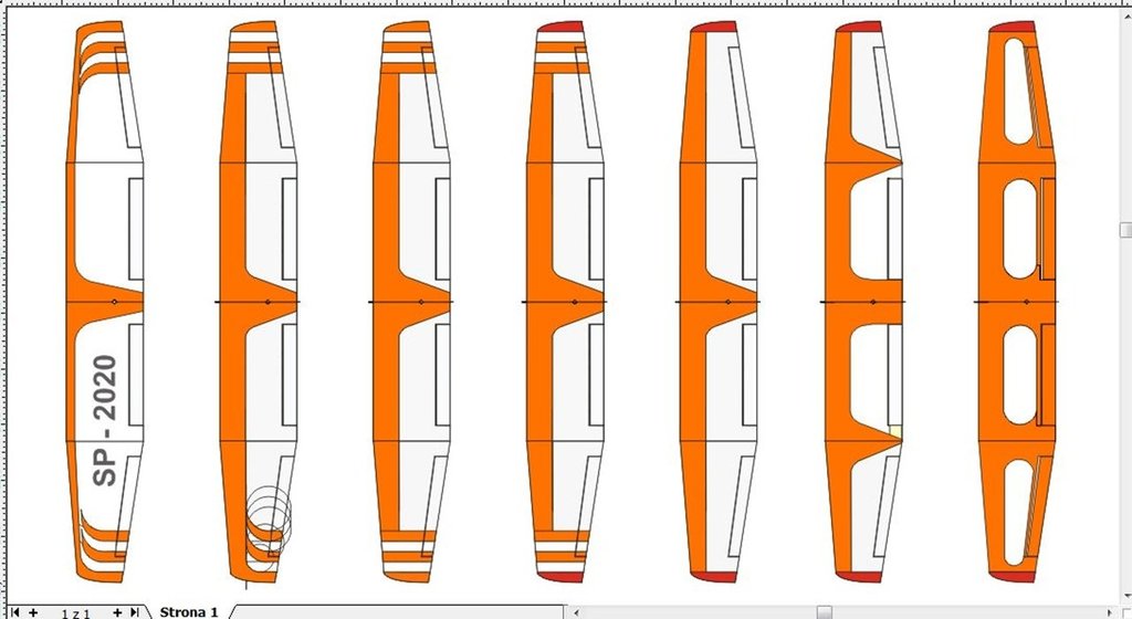 No to dalej ,,lekko,, do przodu. Podwozie wstępnie spasowane - koła fi 65mm. No i nie mogłem się oprzeć aby tak na szybko nie złożyć całości (co prawda całość jeszcze w powijakach no, ale....). Dzisiaj też wstępnie zamocowałem silnik EMAX 2826/05 (mam jeszcze chiński silnik C3542 o ciągu 2kg i chociaż jest o 35g lżejszy to wydaje mi się, że EMAX będzie lepszy ( model zapewne wyjdzie w granicach 1700 - 1800g). Po rozmieszczeniu regulatora oraz odbiornika myślę, że tak jak sugerował kolega powyżej da się model wyważyć położeniem akumulatora - 3S 3300mAh, ale to już po oklejeniu i zmontowaniu całości. Tylko serwa będę musiał przesunąć lekko do tyłu. Pracuję też nad kolorami SZYBOLOTA. Na całości ma przeważać kolor pomarańczowy. Poniżej kilka wzorów skrzydła w widoku z góry - myślę, że wybiorę pierwszy od lewej. Spód skrzydła cały pomarańczowy z czarnymi paskami na końcach uszu - góra jak na rysunku biały z pomarańczowymi dodatkami. A tak to wygląda: