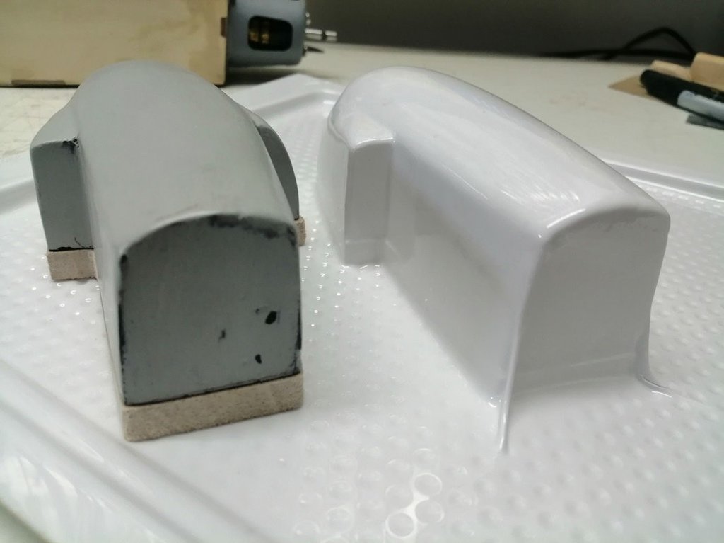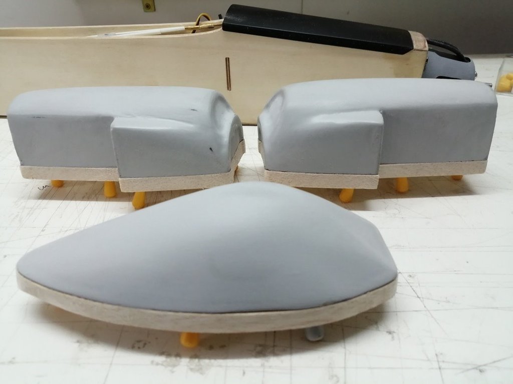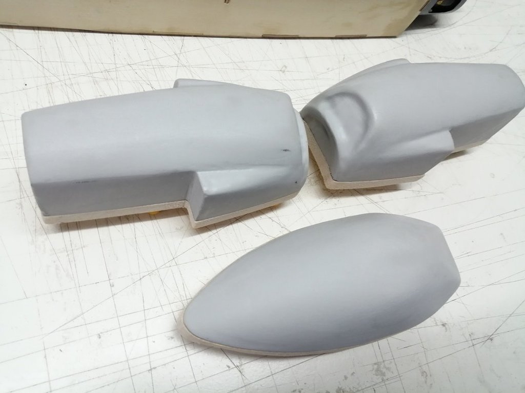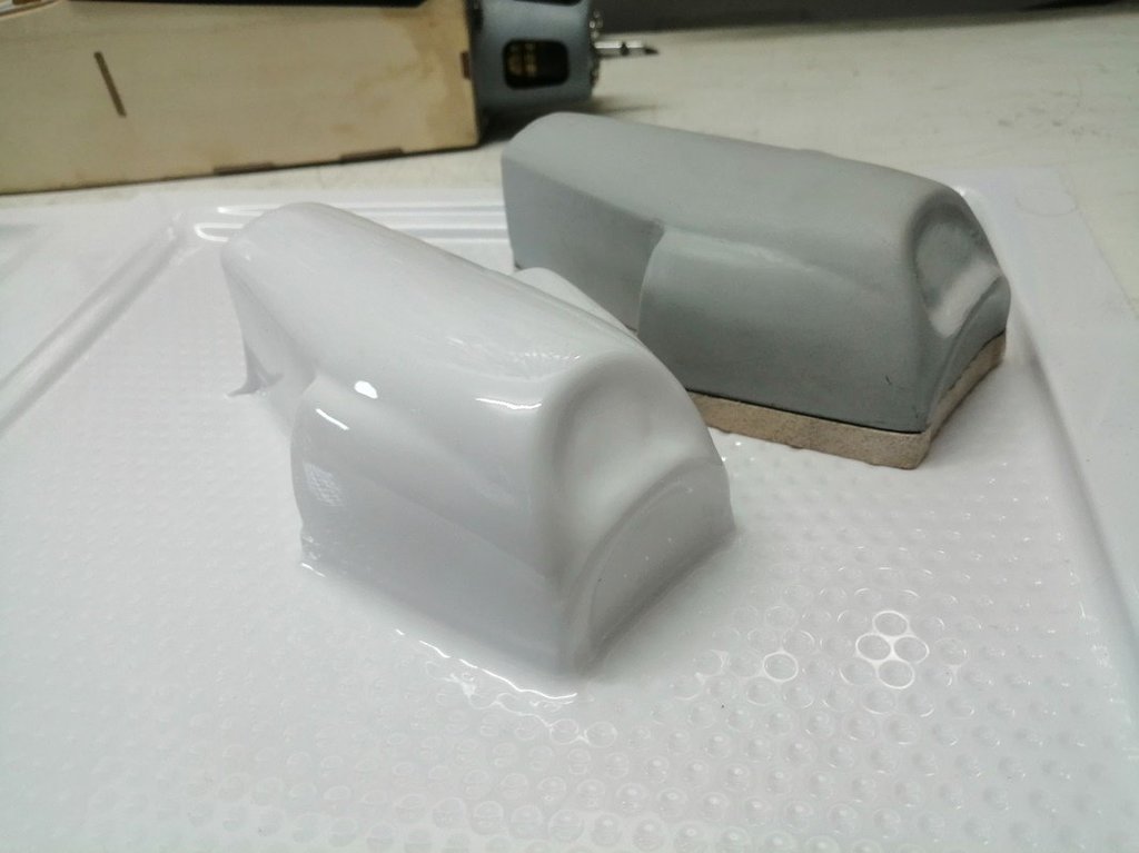 Działamy dalej - co prawda bardzo małymi kroczkami?. Kopyto maski silnika po przeszlifowaniu pryśnięte szpachlówką w sprayu. W międzyczasie wykonałem też kopyto do wytłoczenia osłony kabinki. I maskę silnika i kopyto kabinki trzeba będzie jeszcze przeszlifować na mokro.