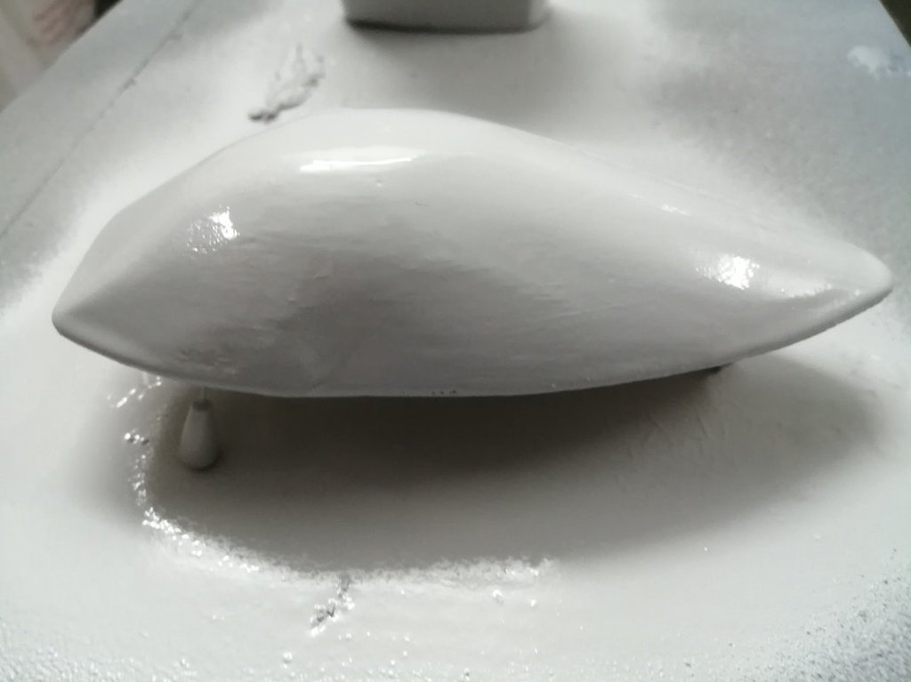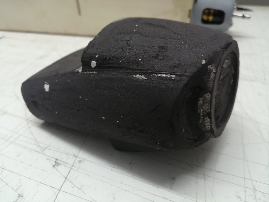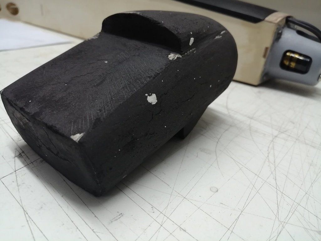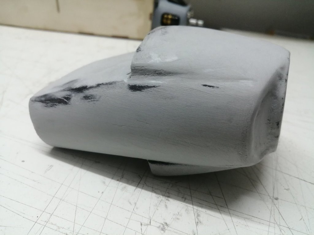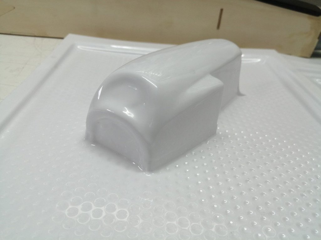 Działamy dalej - co prawda bardzo małymi kroczkami?. Kopyto maski silnika po przeszlifowaniu pryśnięte szpachlówką w sprayu. W międzyczasie wykonałem też kopyto do wytłoczenia osłony kabinki. I maskę silnika i kopyto kabinki trzeba będzie jeszcze przeszlifować na mokro.