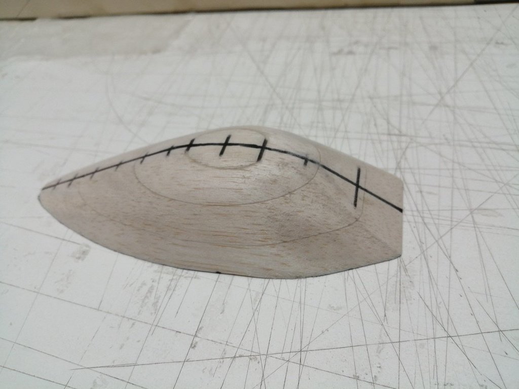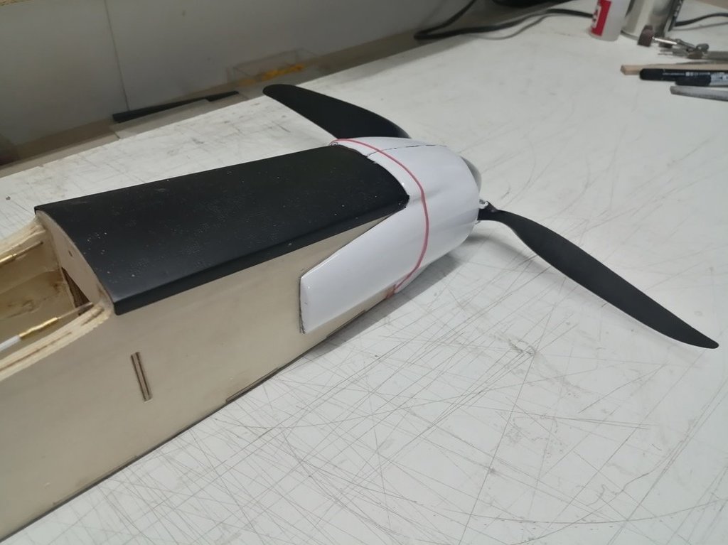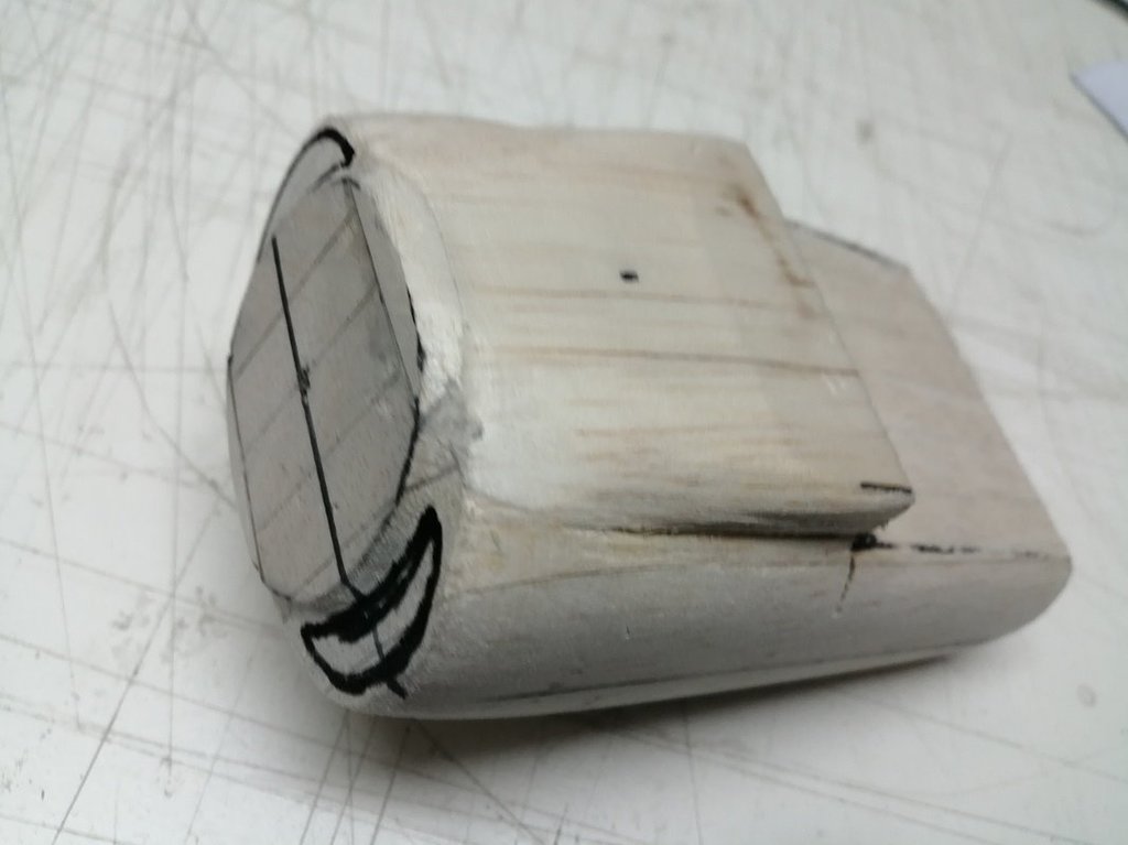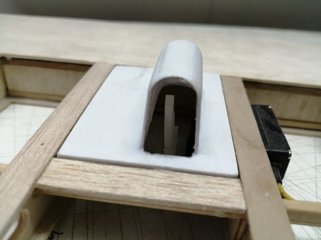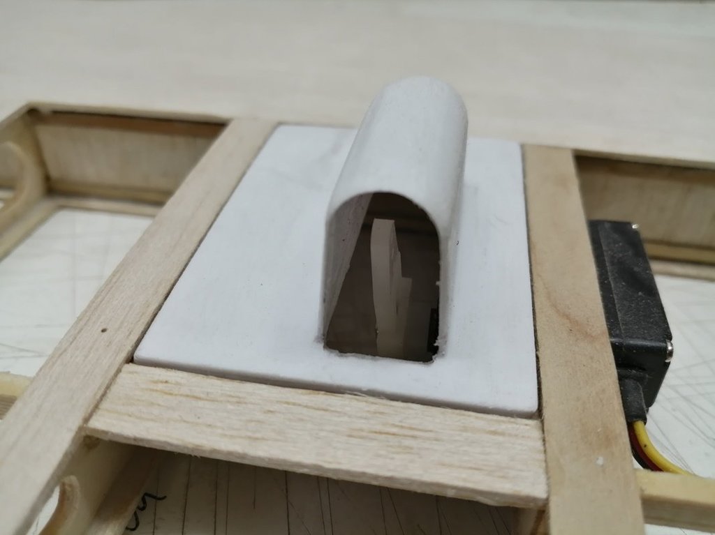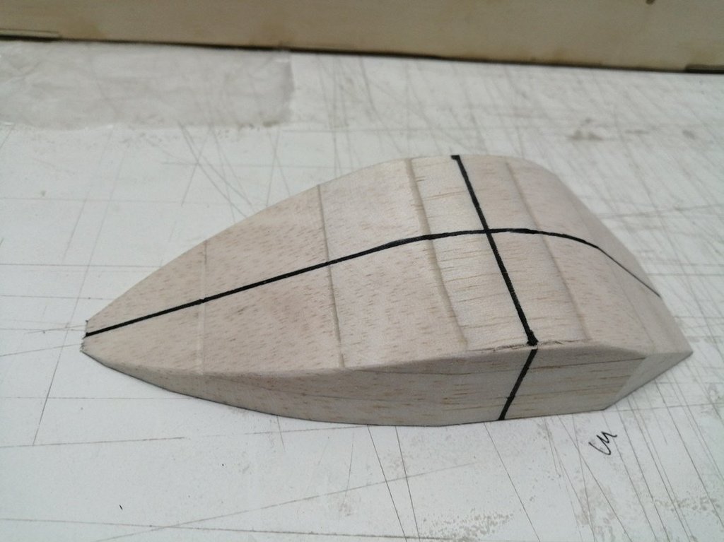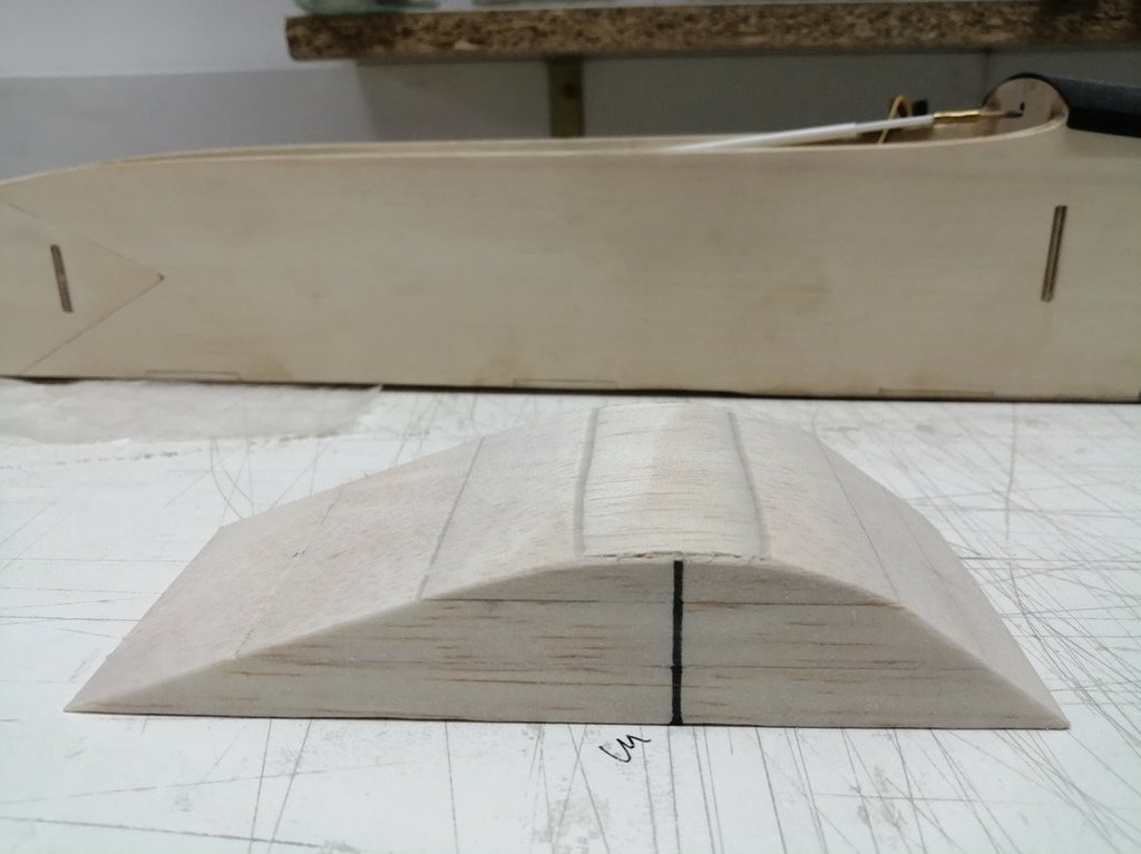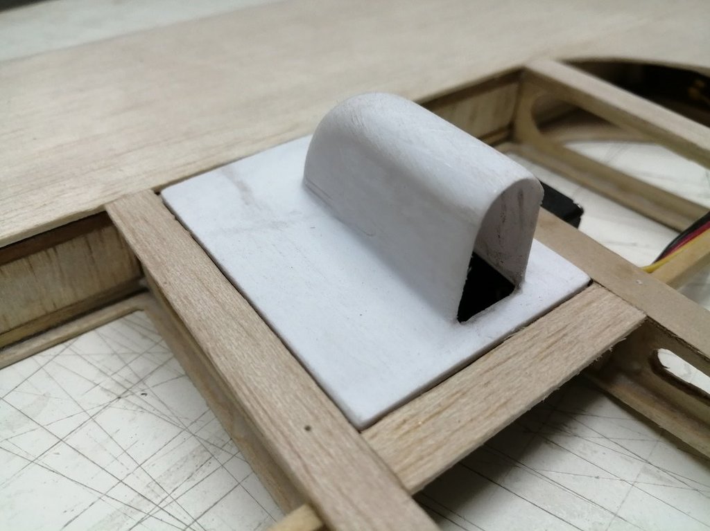Witam po przerwie. No niestety z wolnym czasem bywa różnie, ale najważniejsze, że projekt jest dalej realizowany. Dzisiaj udało mi się wykonać z balsy i sklejki osłonę góry przodu kadłuba - będzie jeszcze zalaminowa tkaniną szklaną. Muszę jeszcze dorobić zapięcie. Pierwsze zdjęcie nawiązuje do poprzedniego wątku - do kopyt serw wykonałem otwory ssące do powietrza dla vacu.