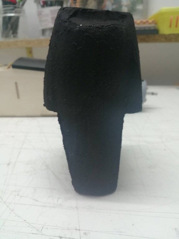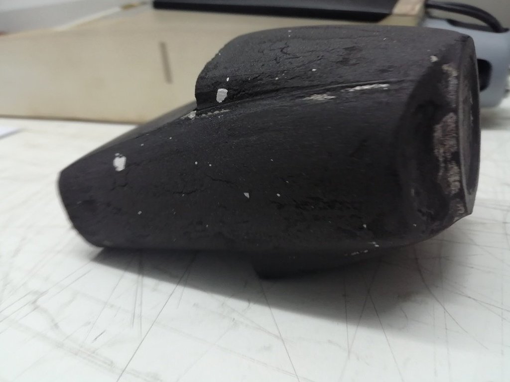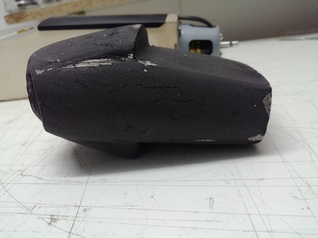 WITAM po przerwie. Chociaż powoli, to jednak prace przy SZYBOLOCIE posuwają się dalej do przodu. Klapka góry przodu kadłuba oraz przednia wręga mocująca silnik zostały zalaminowane tkaniną szklaną. Klapka pryśnięta podkładem oraz wstępnie czarną farbą. Przesunąłem też bardziej do tyłu mocowanie serw - lepiej do wyważenia oraz bezproblemowe mocowanie akumulatora. Akumulator co prawda musi być wsuwany z przodu z góry kadłuba. Wstępnie wykonałem też kopyto maski silnika - maska będzie tłoczona metodą vacu. W swoich zasobach znalazłem dość dawno temu kupioną czarną akrylową szpachlówkę do drewna - o dziwo dalej zdatna do użycia. Kopyto wyszpachlowane - wymaga jeszcze trochę szlifowania, pryśnięcia szpachlówką natryskową itp. oraz przecięcia na dwie połowy. A tak to wygląda: