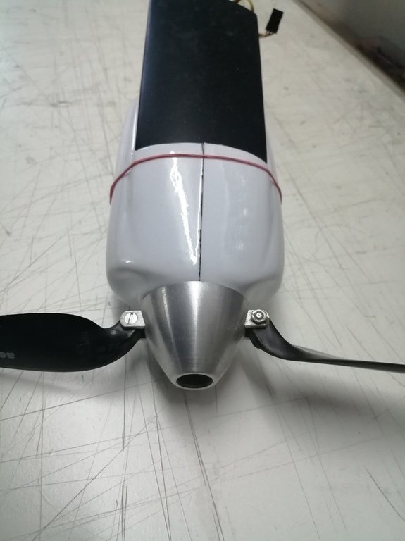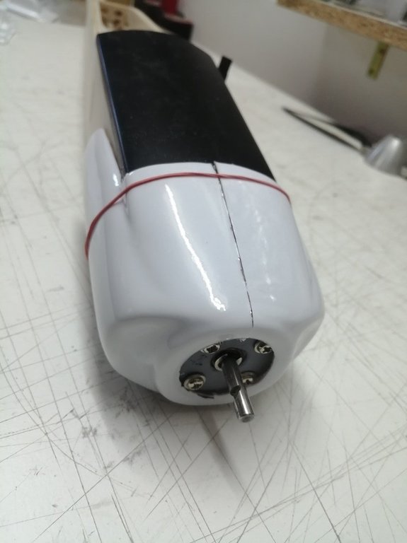 WITAM po przerwie. Jak ten czas szybko leci........ W międzyczasie SZYBOLOT otrzymał wytłoczoną i wstępnie spasowaną osłonę silnika oraz wytłoczone osłonki serw lotek i klap. Oczywiście wymagają jeszcze dopieszczenia. Powietrze wpadające poprzez wloty osłony silnika zamierzam skierować poprzez otwory z boków kadłuba do środka kadłuba w celu chłodzenia regulatora i akumulatora. A tak to wygląda: