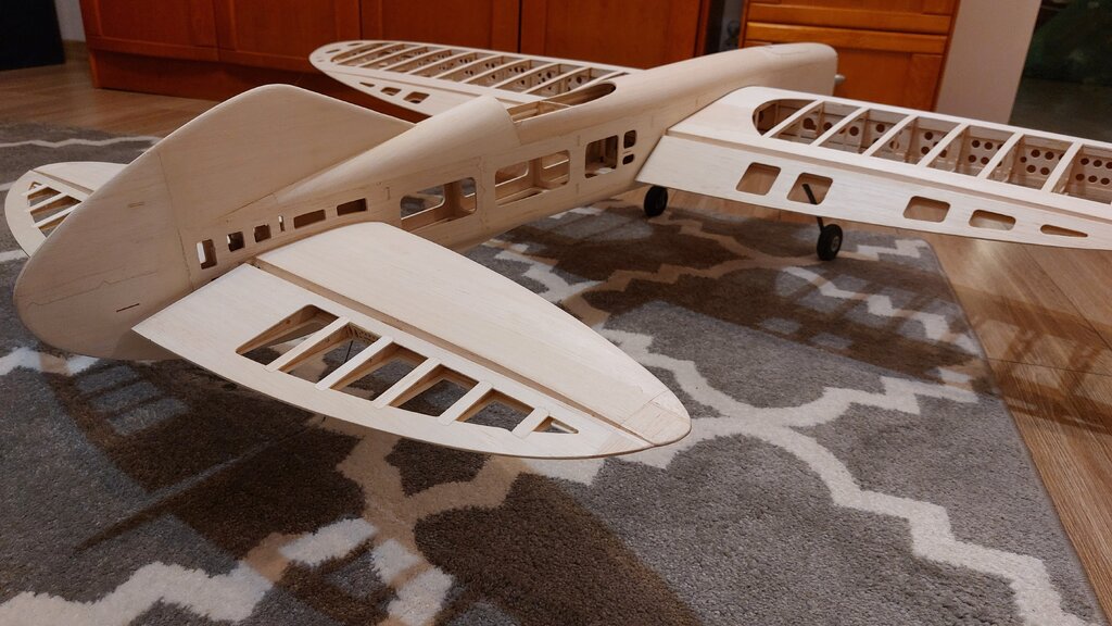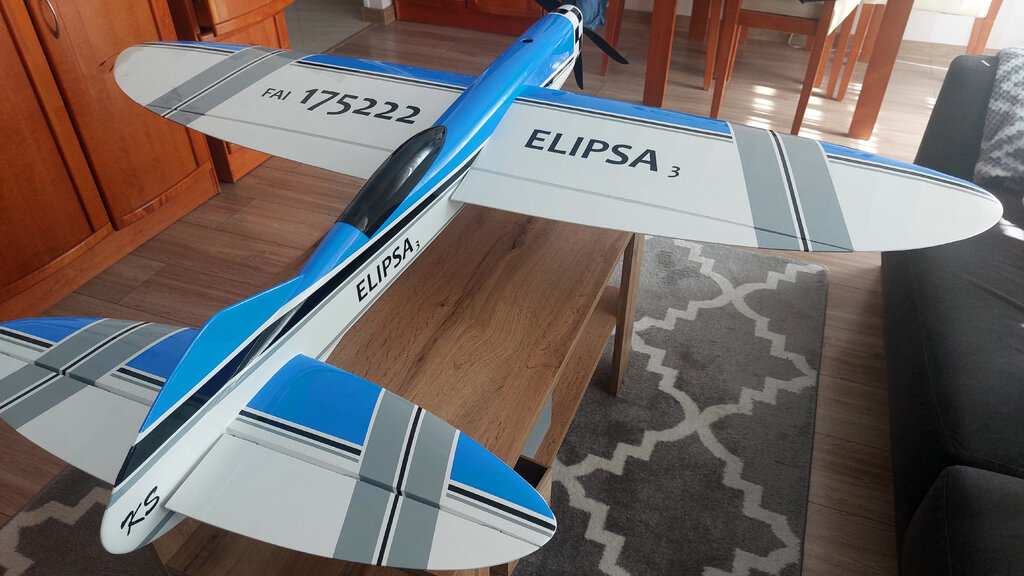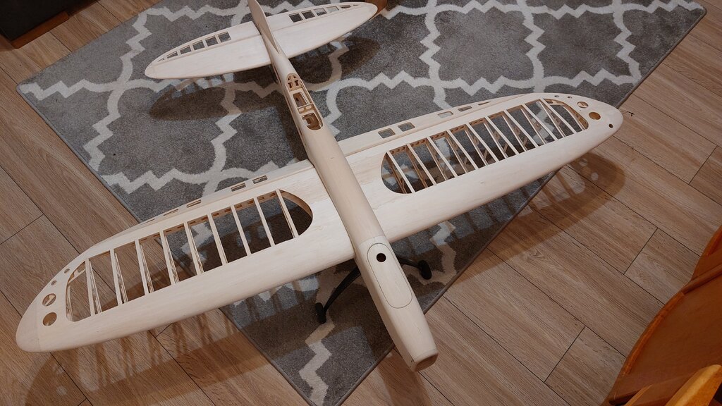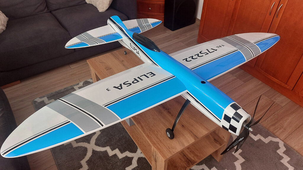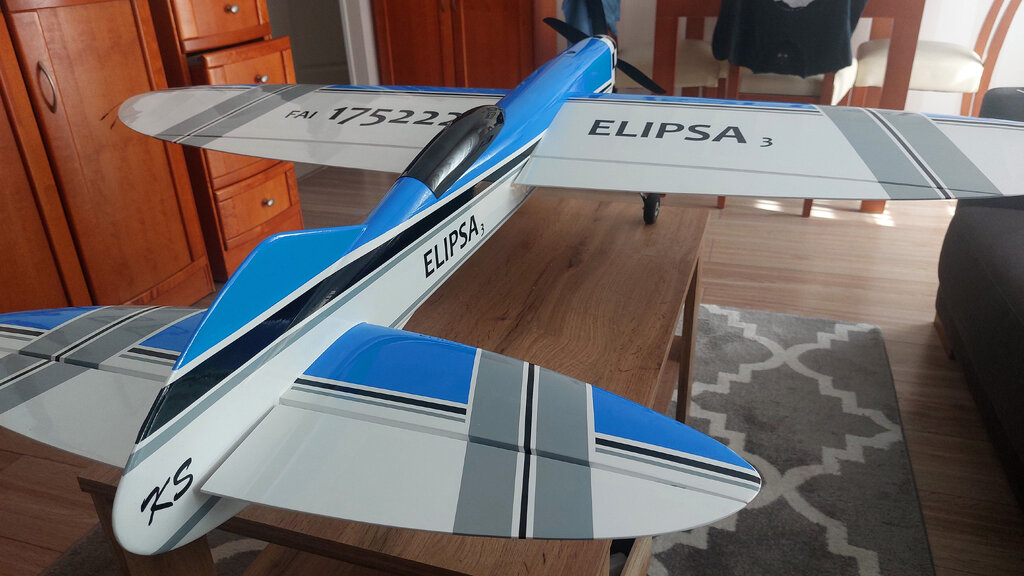 Nowa Elipsa ze stajni KS rwie się do lotu. Ale bez obklejenia zdaje się, że nie poleci. Więc pozostało obkleić włożyć silniczek i w górę dziada. 😁 Zmieniłem trochę koncepcję kadłuba. Skrzydło i statecznik pozostały prawie bez zmian. Statecznik pionowy jest bardziej symetryczny (góra i dół). Bateria wkładana od góry - niby to żaden problem od dołu ale okazało się, że jak jest upał i człowiek zmęczony to wymiana baterii jest upierdliwa. Pionowy CG też będzie bardziej wyrównany. Statecznik dostał też lekkie wychylenie. Oczywiście wszystko w osi. Czyli silnik, skrzydło, statecznik. Tak się prezentuje przed oklejaniem. Ale jakie malowanie dać to jak zawsze najtrudniejsze pytanie. Ech...