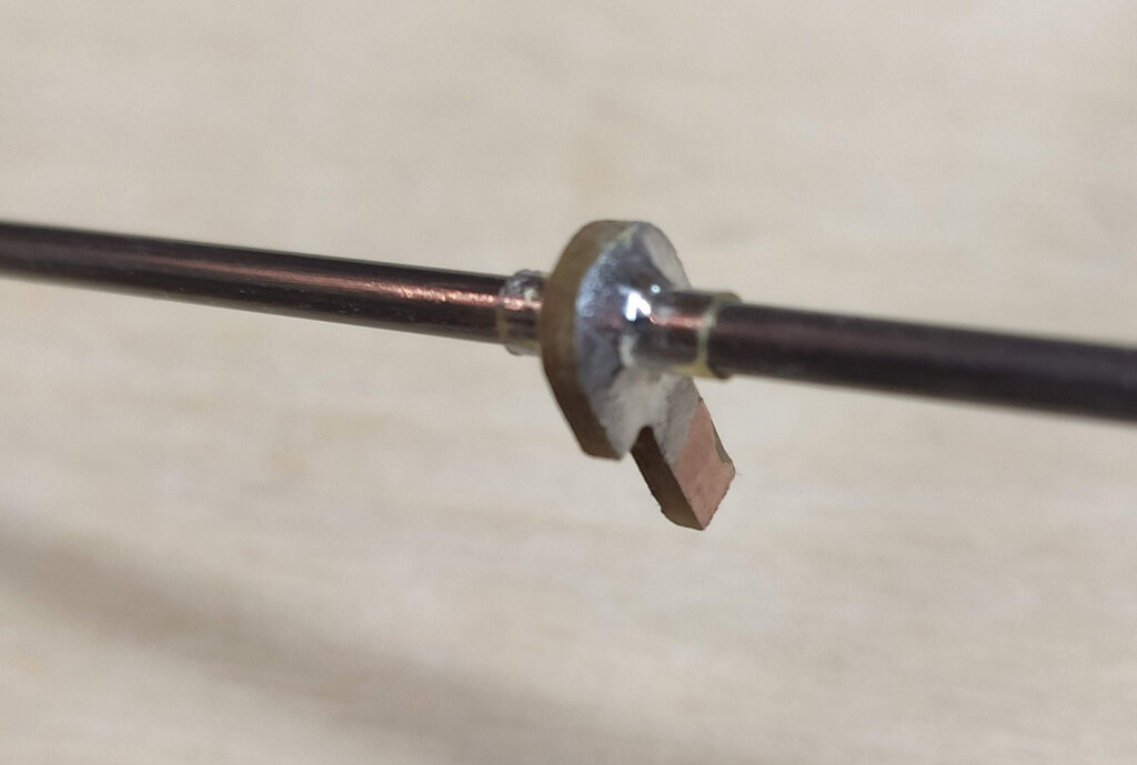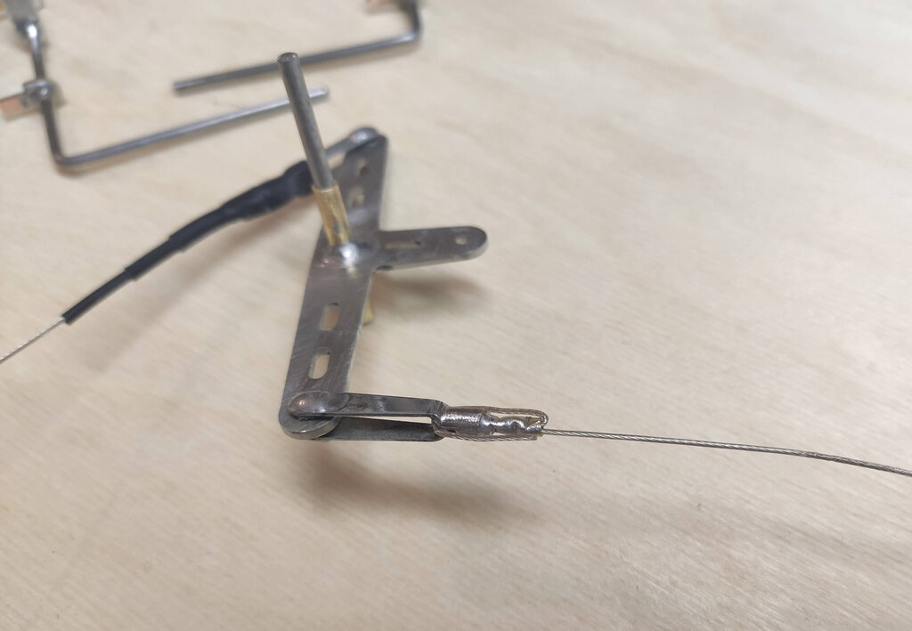 Chcesz i masz A tak na poważnie to będzie wszystko krok po kroku ze zdjęciami. Budowę rozpoczynamy od skrzydła. To ważne. Nie zaczynać od kadłuba !!! A tak naprawdę od rzeczy której najbardziej nie lubię robić czyli orczyk i dźwignie. W zestawie będą takie lizaczki z dwustronnego laminatu. Będzie ich cztery sztuki. W otwór wkładamy rurki o średnicy wewnętrznej 2,5 mm o długości około 8 mm. I lutujemy tak jak na zdjęciu poniżej. Jak ktoś stwierdzi, że 2,5 mm druty do klap i sterów wysokości będą za cienkie to trzeba wlutować rurki 3 mm. Potem przygotowujemy dźwignie. Są wykonane z dziwnego żelaza. Na kalafonię nie da się przylutować. Ale na kwas spokojnie się lutuje. W tych dźwigniach widać na zdjęciu poniżej takie małe wycięcie w otworze na drut około 0,5 mm średnicy. 10 mm takiego drutu wkładamy w ten otworek i dopiero wtedy lutujemy dźwignię. Ten drucik ma być w stronę ogona modelu. A tak powinno wyglądać po lutowaniu: Wysokość i szerokość drutu do klap i wysokości na rysunku poniżej: Teraz czas na orczyk i linki do orczyka. Tutaj na formum widziałem wiele różnych rozwiązań. Pewnie każdy zrobi po swojemu. Ja zrobiłem tak, że w orczyk wlutowałem mosiężną rurkę o średnicy 5 mm i wewnętrznej 3 mm. Będzie taki z wycinanką całą. Natomiast zakończenie linek to mój pomysł i działa fajnie. Z "fabrycznych" snapów usuwam ośki. W orczyku otwory na ośki linek zaciskam (nie wiem jak to się nazywa, pożyczyłem od kolegi) nity, nitownica. W każdym razie po zaciśnięciu pozostaje taki mały grzybek z góry i z dołu z otworem 1,5 mm. W ten otwór wkładam drut i lutuję z góry i z dołu do snapa.. Na linkę zakładam cienką i grubszą termokurczkę, rurkę i składam razem jak poniżej. No a finalnie całe żelastwo wygląda tak: Na powyższych zdjęciach jest błąd. Linka nie powinna przechodzić na zewnątrz rurki, którą się zaciska. Linki w tę i z powrotem i znowu w tę powinna przechodzić przez tę rurkę. Ale niestety była za cienka a nie miałem innej i zrobiłem tak właśnie. To jest bardzo częsty błąd który obserwuję na lotniskach w np. pull-pullach. W dalszej części jak przyjdzie czas na obróbkę linek to jeszcze to opiszę. CDN...