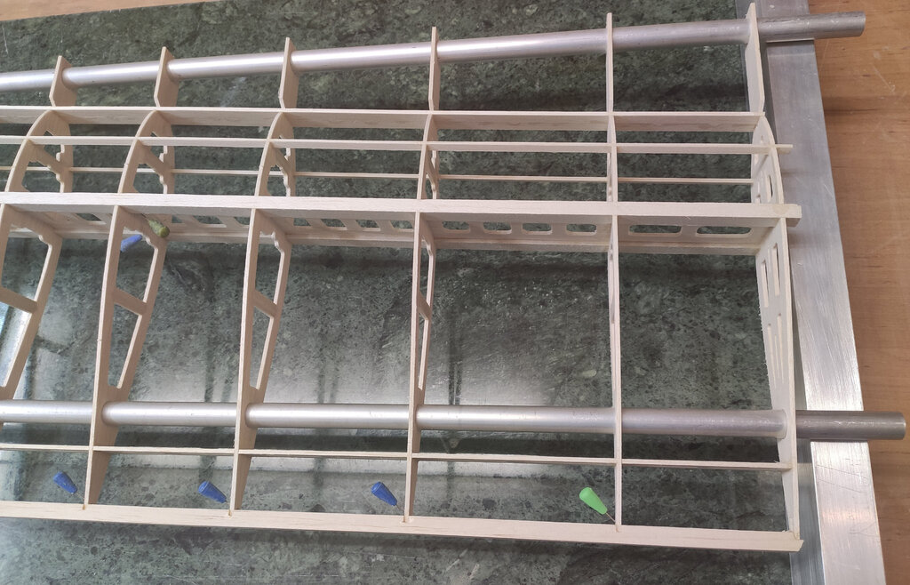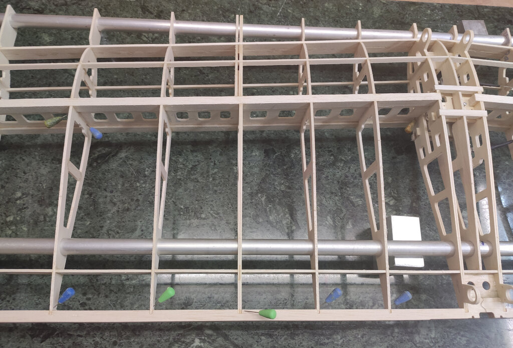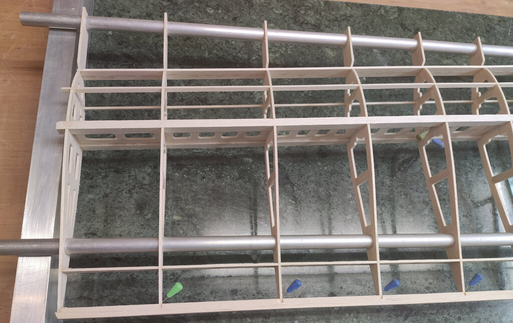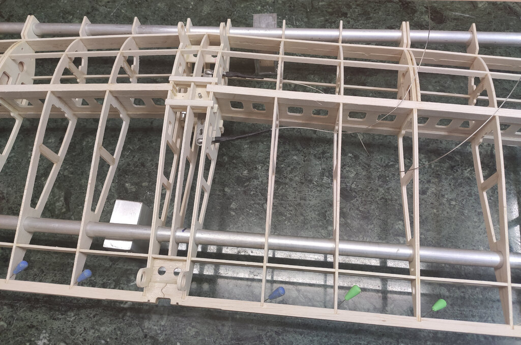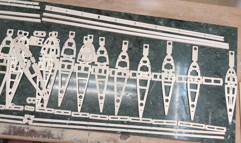 CD... Czas na skrzydła. Na początek wycinamy żebra z formatek. Ale tu WAŻNE !! Wycinamy po jednym i po kolei je obrabiamy. W innym przypadku będzie potem kłopot. Tak mniej więcej wyglądają żebra w formatkach: Poniżej widać, że w każdym żeberku wewnątrz są rozpórki, które należy wyciąć i natychmiast wkleić. Jak się to pomiesza pomiędzy innymi żeberkami to może być kłopot. No i żeberko z wklejonymi rozpórkami: Następnie usunąć te wąsiki które mocowały żebro do deski no i ogólnie obrobić aby to wyglądało jakoś. Teraz można powycinać pozostałe części do skrzydeł i przygotować listwy balsowe na dźwigary 10x8x690 dwa. I 10x8x710 też dwa. Dodatkowo cztery listwy balsowe o tej samej długości x5x2. Listwy spływu sklejamy po dwie ale to lepiej zrobić żywicą albo Soudalem 66A a nie cyjakiem. Uwaga, różnica długości listw wynika z tego, że lewe skrzydło jest dłuższe niż prawe. To w dalszej kolejności będzie stwarzać trochę problemów ale przygotowałem części tak aby nie pomylić. Tak to mniej więcej wygląda po rozłożeniu na stole montażowym. Lewa strona skrzydła ma być taka. To rozwiązanie wynika z tego, że mocowanie linek na końcówce skrzydła będzie regulowane i linki będą przechodzić pomiędzy dźwigarami. Natomiast prawa taka: W dalszym etapie części skrzydła, które są różne dla prawego i lewego oznaczone są małym otworem. Z otworem idą na prawo. Widać to powyżej. Nie zapomnieć o "kanapce" w którą potem wejdzie podwozie w kolejności miękka sklejka, twarda sklejka, balsa: No i można zaczynać składać na sucho. Nadziewamy żeberka na rury. Ja zastosowałem rury o średnicy 13 mm. Ale widzę, że jest kłopot z ich zdobyciem i pewnie przerobię na 14 mm. Dla tych co nie spotkali się z tą technologią informuję, że te rury po pokryciu kesonem trzeba będzie wyjąć W środkowej części jeszcze takie kołeczki jak poniżej. Można już montować dźwignię. Ja tę środkową część skleiłem na żywicę. Pozostałe części na cyjaka. Nigdy nie kleiłem wszystkiego na cyjaka. Mam nadzieję, że to nie będzie błąd. Ale wszystko jest z balsy więc nie powinno być problemu. Ze względu na to że skrzydło jest dość długie to w środkowej część również je podpieram na rurkach takimi metalowymi klockami jak na końcach. W międzyczasie można też dokleić takie dystanse ze sklejki przekładając to rurką o średnicy 10 mm. Rurkę po zaklejeniu wyciągamy. W dalszym etapie zobaczycie po co to. I jeszcze wskazówka. Przed zamontowaniem dźwigni posmarować oś czymś tłustym. Ja zapomniałem i teraz to skrzypi strasznie. Muszę to poprawić. Ech życie CDN...