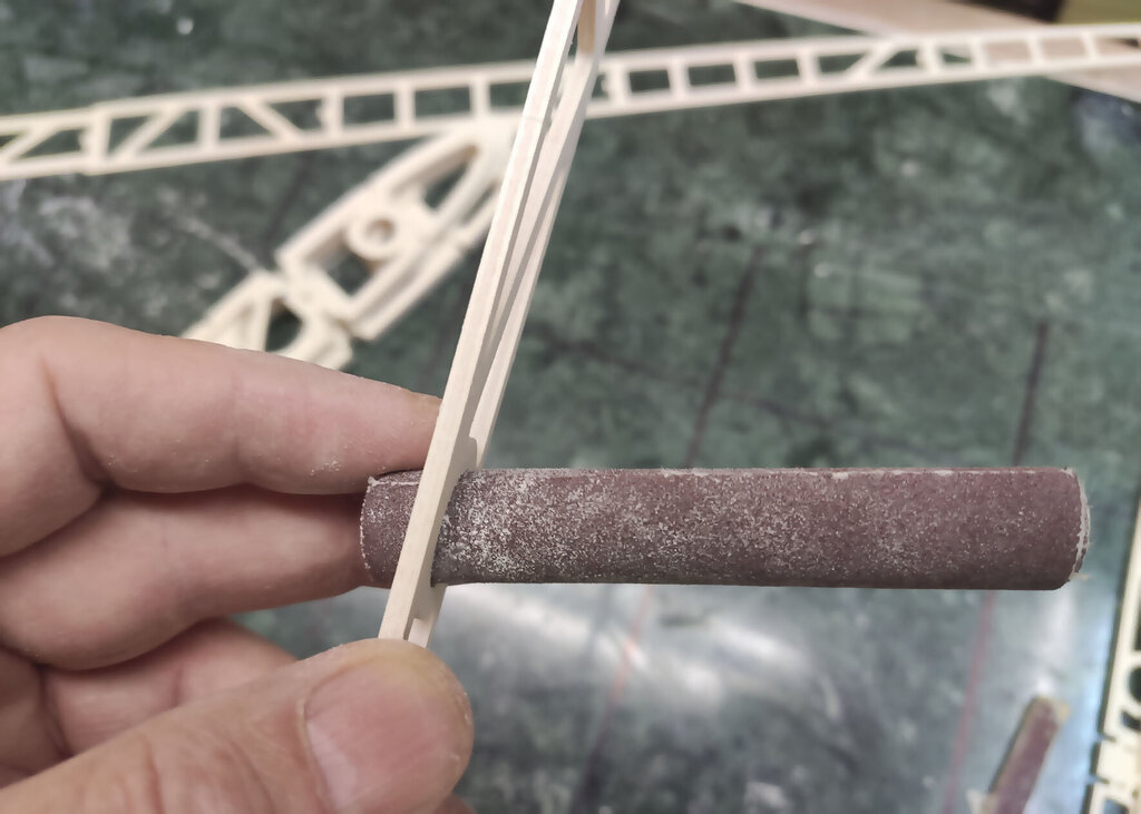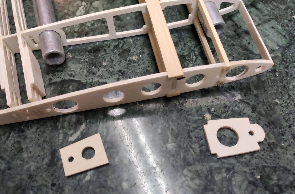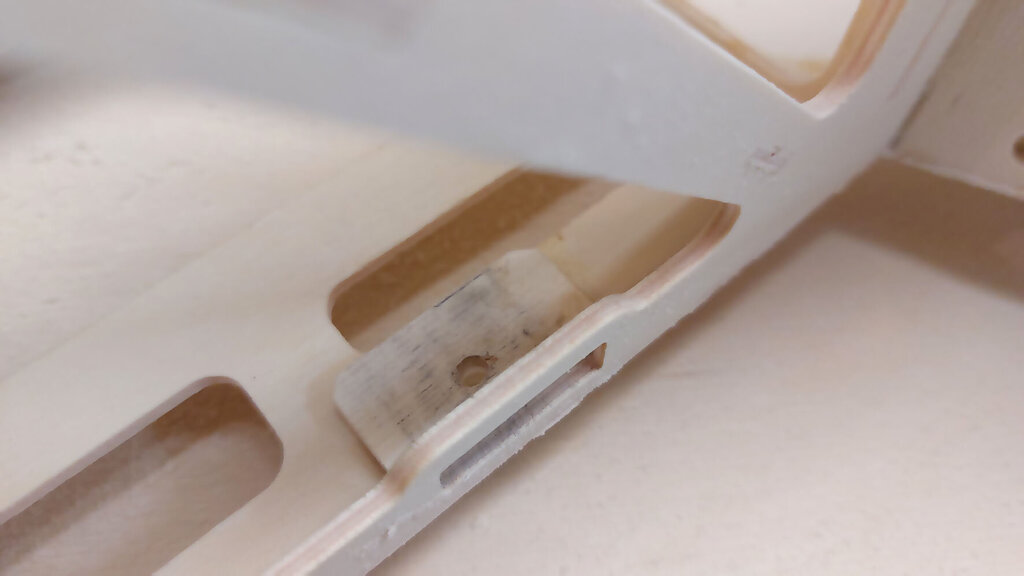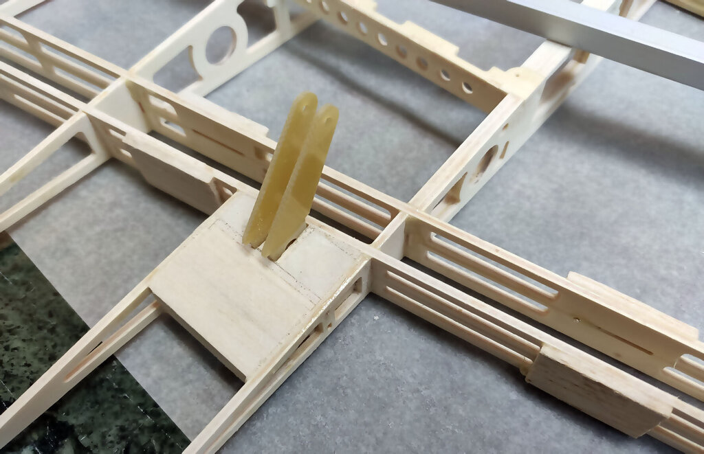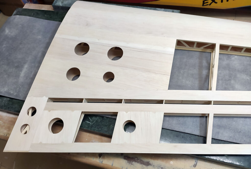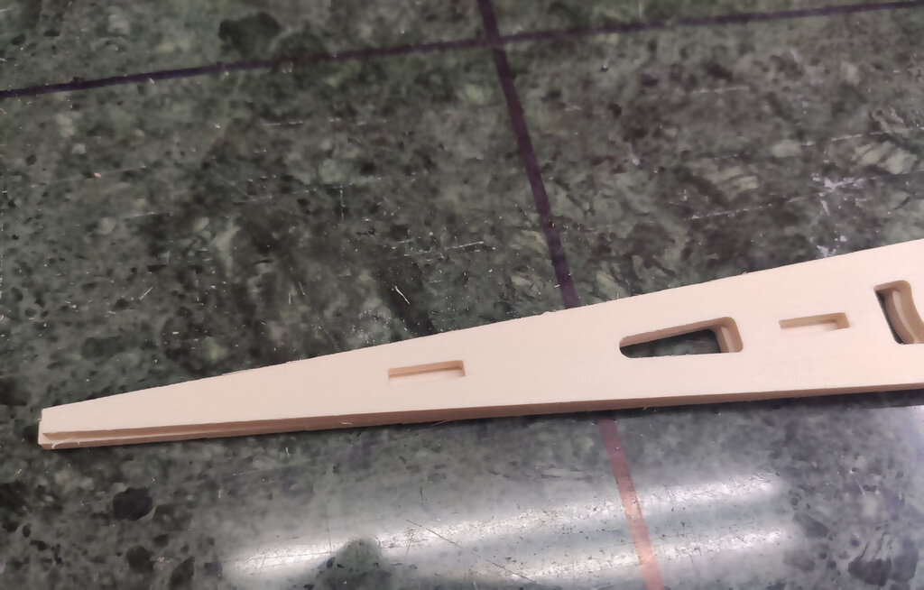 Trochę trwał ten jeden dzień. Prawie 3 tygodnie. Ale za to dzisiaj już skończę tę relację. CD... Przed pokryciem skrzydła balsą jeszcze kilka czynności. W lotce trzeba wzmocnić miejsce mocowania dźwigni. Wklejamy też kieszeń na rurę. Oczywiście na żywicę. NIestety nie mam zdjęć ale potem przy pokrywaniu skrzydeł można to jeszcze zobaczyć chyba. Aby rura się nie przesuwała to przygotowane macie takie paski prostokątne. Jeden ze sklejki miękkiej drugi z twardej. Trzeba je razem skleić i wsunąć w prostokątne otworki pomiędzy dźwigarami sklejkowymi tam gdzie się kończy kieszeń. Jeszcze raz przypomnę. Przy wklejaniu kieszeni na rurę, rura powinna być w kieszeni. Bo żywica zasychając obkurcza się i może być potem kłopot z włożeniem rury. Gdyby jej nie było podczas wiązania żywicy. Rurę dokładnie zabezpieczyć aby się nie przykleiła do kieszeni. Teraz trzeba przygotować pokrycie z balsy. Trochę podszlifować bo teraz łatwiej niż po przyklejeniu. Pamiętać trzeba, że góra i dół różnią się. W dolnym poszyciu jest otwór na mocowanie serwa. No ale to chyba oczywiste. Poniżej seria zdjęć z przyklejania poszycia. No i po zaschnięciu szlif. Jeżeli ktoś zechce w przyszłości stosować tak zwane winglety to przed obklejaniem folią trzeba jeszcze wkleić takie wzmocnienia. No i skrzydło prawie gotowe. Teraz pozostaje jeszcze odciąć lotki i przykleić listwy trójkątne lub listwy sposobem jak opisałem podczas montażu sterów i stateczników. Ale tutaj ważna sprawa. W sterach i statecznikach te listwy przy kadłubie są zeszlifowane do krawędzi. Natomiast na skraju jest tak jak poniżej. Po to są te trójkąty aby pomóc to rozkminić i doszlifować. NATOMIAST W SKRZYDŁACH zrobiłem inaczej. Listwy na całej długości szlifujemy do kantu skrzydła. Też są przygotowane do tego trójkąciki więc trudno o pomyłkę. Jeszcze pozostają zaślepki do zakrywania serw. Tutaj łatwo się pomylić więc wstawiam zdjęcia. Podczas projektowania wydawało mi się, że te klapki będą na tyle giętkie że da się je włożyć tak aby wystające zabezpieczenia z pasków balsowych trzymały je na miejscu. Niestety to nie zdało egzaminu bo klapka okazałą się zbyt sztywna. Ale to naprawdę nie jest problem. Do klapek przyklejamy wzmocnienia z pasków. Są przygotowane otworki, które pomogą idealnie je zpozycjonować (jest takie słowo?). Po przyklejeniu zeszlifować listwy balsowe. Ma to wyglądać tak: I po obklejeniu w skrzydłach będzie to wyglądać tak jak poniżej. Mocowanie na wkręty o średnicy 2 lub 2,5 mm. Teraz można już wkleić też bolce stabilizujące do skrzydła i stateczników. Ja zastosowałem zwykłą aluminiową rurkę z Mrówki o średnicy 10 mm. Co niektórzy wklejają węglowe. Ale to nie ma znaczenia. Aluminiowe tańsze dużo. Przygotować jeszcze otwory pod zawiasy i skrzydło odłożyć do późniejszego obklejania folią. Jeszcze kilka uwag do kadłuba. Tzw domek wzmacniam trójkątami basowymi. Tak jak poniżej. Od środka przy "fajerłolu" również. Nie wstawiałem jeszcze zdjęcia chyba z wklejenia podkładek sklejkowych w masce. Tu gdzie się mocuje śrubą od dołu. Pewnie się zatanawialiście nad takimi dziwnymi częściami jak poniżej. Mało kto doszedł po co to. Więc wyjaśniam. Różne silniki mają inne dojścia do dźwigni gazu. Przygotowałem otwór na serwo w dolnej części "domku". Ale gdyby tam nie pasowało to można serwo przymocować po lewej lub po prawej stronie. Zobaczcie te otwory: W te otworki mają wejść tak zmontowane kieszenie jak poniżej. Ale tylko wtedy gdy ten otwór na serwo nie będzie pasować. Następna sprawa. Jak ktoś będzie stosował zwykłe puszki to wystarczy zrobić otwory w masce na wydechy i po sprawie. A jak ktoś zechce stosować rurę to trzeba wkleić te części. To jest tak przygotowane, że wchodzi w wręgę na styk a druga część skleja to razem. Jak komuś nie pasuje średnica tego otworu na rurę to trzeba dać znać Marcinowi jaka średnica rury ma być i się doprojektuje i dotnie. Jeszcze należałoby wzmocnić kadłub w miejscu gdzie będzie mocowana maska na dwie śruby. Ja zastosowałem taki grzybek. Fajnie to działa bo nie trzeba stosować żadnych podkładek i śrubę można docisnąć solidnie. No i teraz jeszcze muszę przyznać się do błędów paru. Większość nawet nie jest warta wzmianki bo tego nie zauważycie. Ale dwa są warte wspomnieć. Oczywiście w następnych wycinankach Marcin to poprawi. W skrzydłach tak gdzie jest otwór na serwa są dwa paski z balsy które idą wzdłuż żeberek. Są za krótkie o 1,5 mm. To nie problem bo łatwo to wydłużyć ale błąd to błąd. No i ważniejsza sprawa. Otwory w kadłubie, te gdzie wchodzą wpusty mocowania kabinki w przedniej części trzeba podciąć około 3 do 4 mm. Od strony tylnej. Bo po przykręceniu maski na śruby nie włożycie kabinki Miałem to inaczej rozwiązać podczas projektowania ale zapomniałem poprawić i tak zostało. Po oszlifowaniu wszystkiego model gotowy do obklejania. Prezentuje się tak: No i teraz obklejanie. Ten samolot robię dla kolegi Grzegorza. I Grzegorz stwierdził, że sam go sobie pokoloruje a ja mam obkleić na biało. Dawno nic mnie tak nie ucieszyło bo to 1/4 roboty przy obklejaniu. Ni finalnie tak to wygląda. Samolot oddałem Grzegorzowi i już chyba do mnie nie wróci. Pozostało więc jeszcze po pokolorowaniu wkleić zawiasy i dźwignie. Uwaga ważna jeszcze. Szczelina pomiędzy krawędzią lotki a tylną częścią skrzydłą musi być co najmniej 2 mm. Jak będzie mniej to nie uzyskacie maksymalnego wychylenia lotek bo będzie się blokować. Dźwignie i podwozie oczywiście są w zestawie. Przykręcić silnik. GP 61 do tego potrzebuje tuleje dystansowe 25 mm. Trzeba też dociąć wręgę bo ociera dźwignia ssania i wężyk paliwa. No i montaż wyposażenia. Do montażu serw w skrzydłach koniecznie dokupić wkręty 