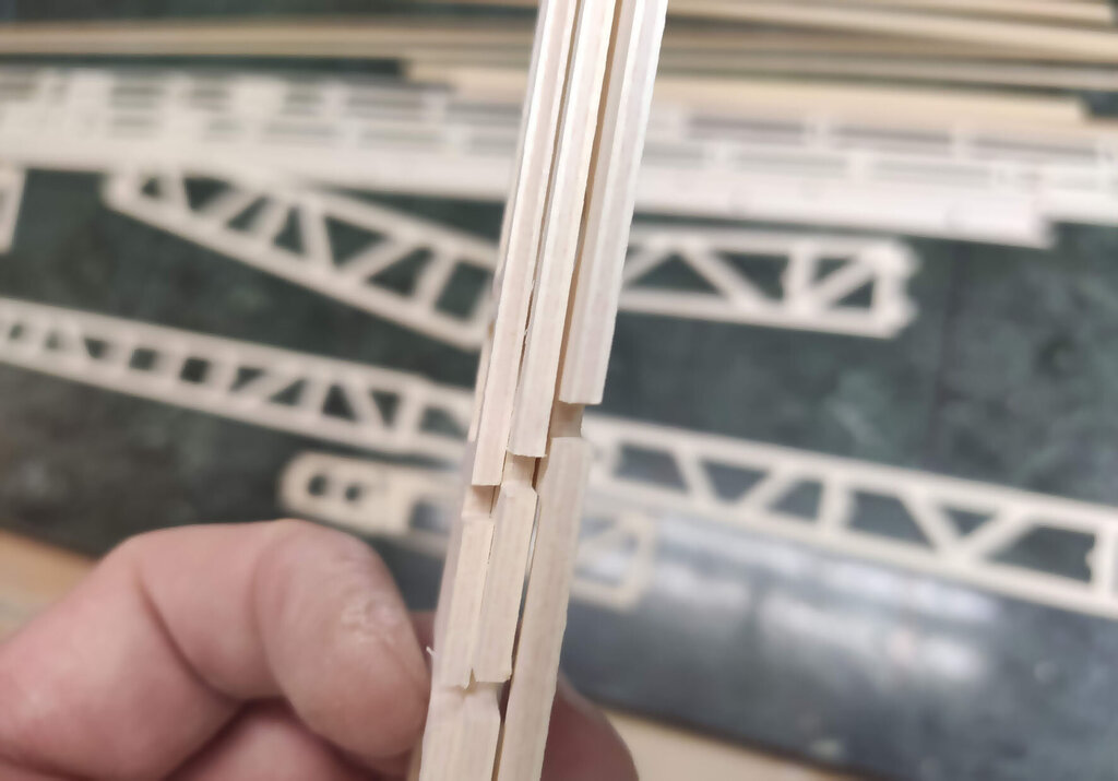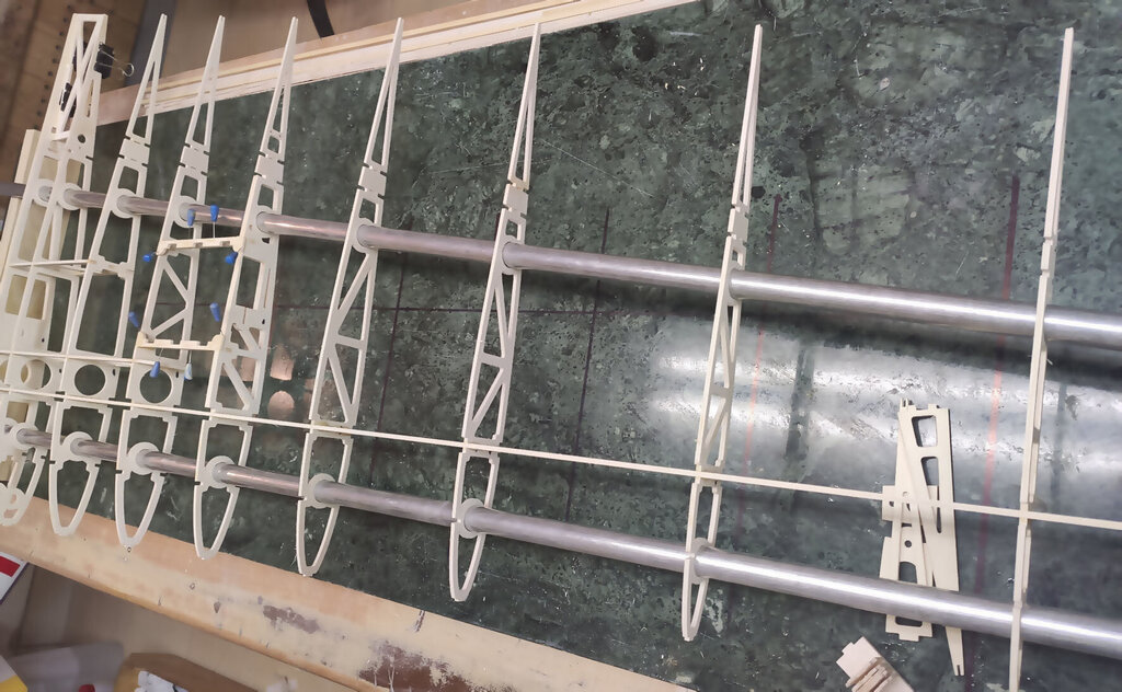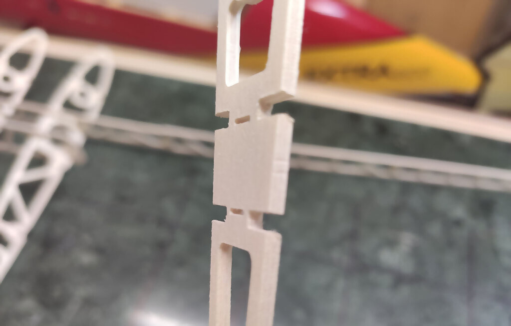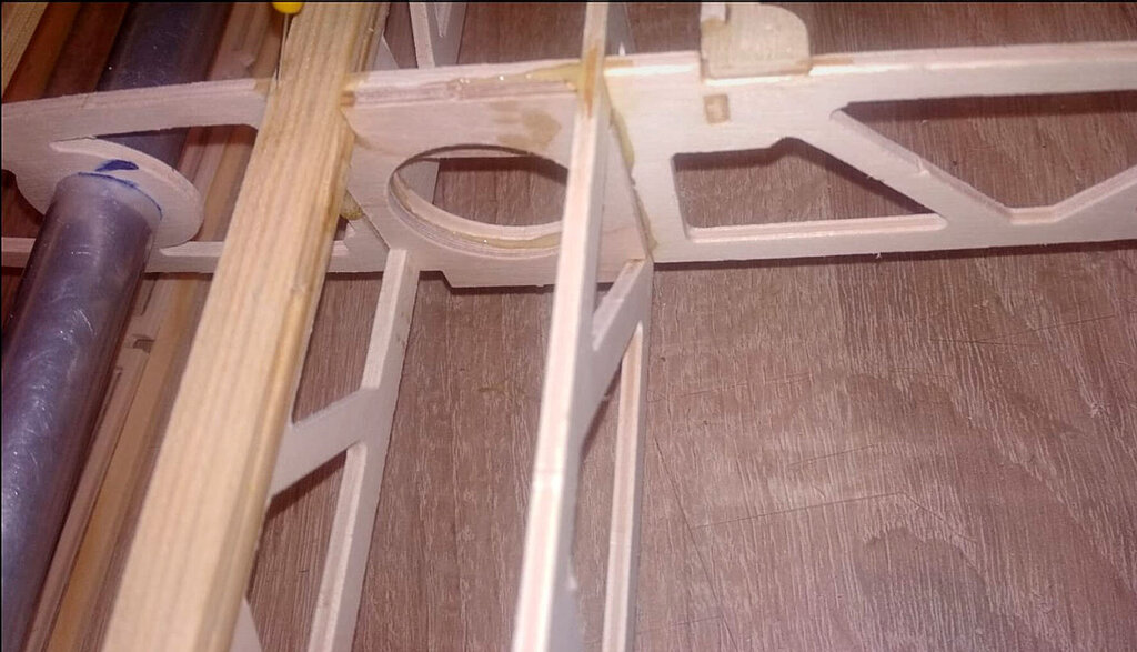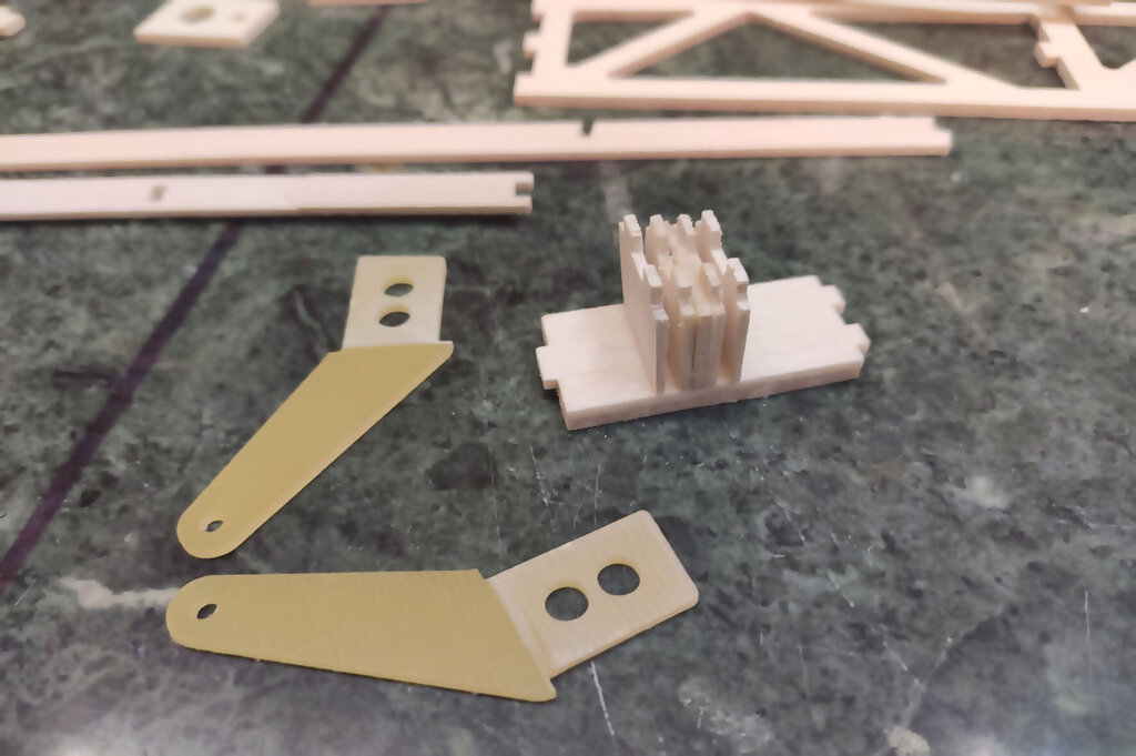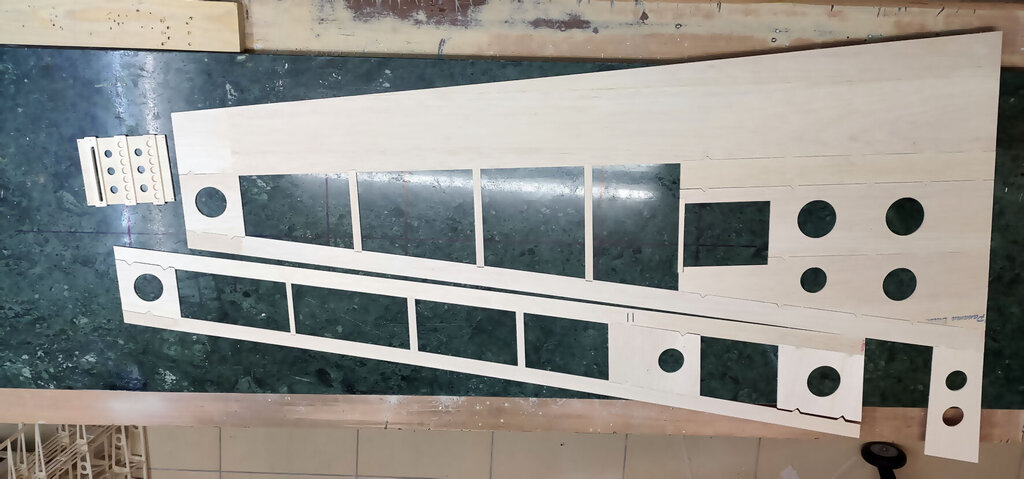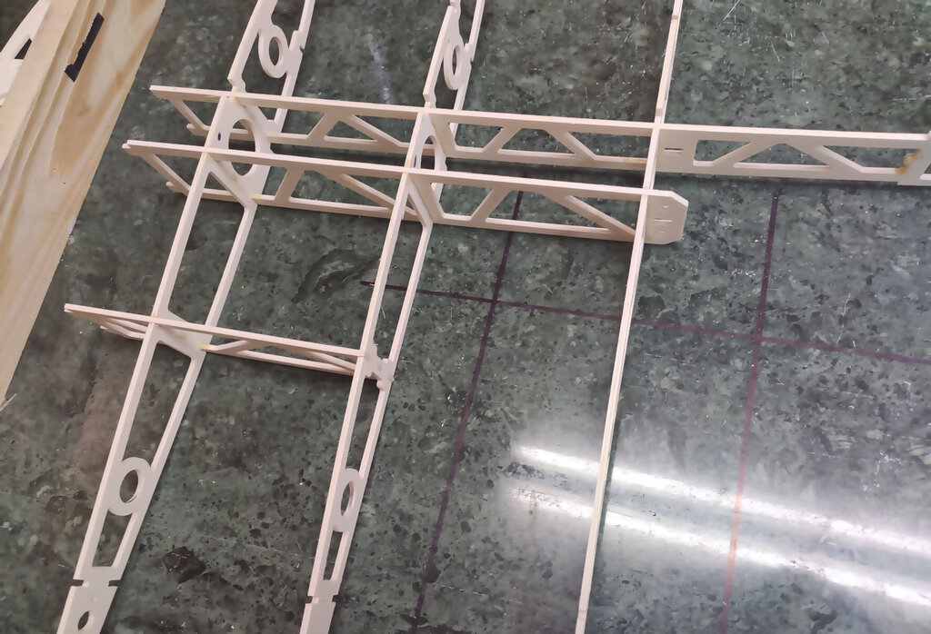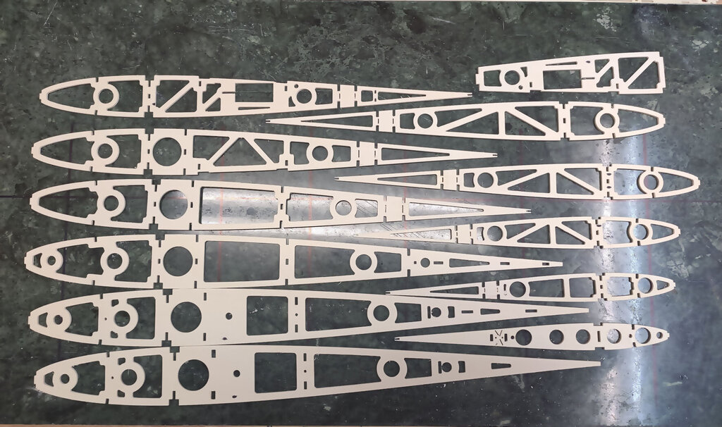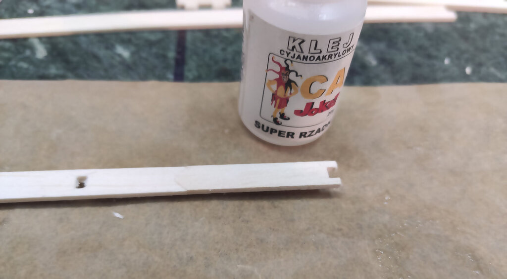 Witajcie, Darek - darkall, który właśnie składa ten zestaw dzwoni od czasu do czasu i zgłasza uwagi do relacji. Nikt nie zgłaszał do tej pory więc sądziłem, że relacja jest w miarę jasna Nie wiem czemu inni nie dzwonią, nie piszą. Pozwoliłem sobie poprawić parę wpisów poprzednich. Wszystkie poprawki są oznaczone zieloną czcionką. CD... Skrzydła. Chyba najtrudniejszy etap budowy. Uwaga, w tym projekcie serwo lotek jest schowane w skrzydle. Trochę inaczej jak w większości konstrukcji, które obserwuje się na lotniskach. Skrzydło składamy razem z lotkami które potem będą odcinane. Zaczynamy od poszukania wszystkich elementów skrzydła. Pozwalam sobie wyedytować ten wpis. Darek Sobaszek, który składa z tej relacji krok po kroku zauważył że brakuje na powyższym zdjęciu kilku ważnych elementów. A mianowicie te poniżej. To elementy z sklejki 3 mm twardej. Ta deseczka najniżej powinna być podwójnie sklejona. Z sklejki miękkiej 3 mm i sklejki twardej 3 mm. Przygotowujemy listwy sosnowe. Muszą być trochę dłuższe niż sztandarowe ze sklepów 1000 mmm. Więc trzeba przygotować przedłużki. Potrzebujemy sosnowe na jedno skrzydło: 2 listwy 3x10x1000 2 listwy 3x5 2 listwy 3x10x400 No i ścinki kilkucentymetrowe do przedłużenia. Wszystkie elementy dokładnie czyścimy papierem ściernym. Listwy również. I TERAZ WAŻNA UWAGA!!! Wszystkie żeberka w miejscach gdzie listwy i tylna rura montażowa wchodzą pod kątem innym niż 90 stopni należy zrobić podcięcia. To naprawdę ważne. Podczas podcinania tych elementów pamiętać szczególnie o tych podwójnych. Czyli przykadłubowych i tych które będą trzymać serwa. Dokładnie to przemyśleć. Żeberko które wzmacnia żebro główne z wycięciem na serwo idą na zewnątrz skrzydła !!! Przednią listwę z balsy też przedłużamy tak: Przygotować już teraz warto wpusty na dźwignie. No i można składać. Ale w pierwszej kolejności na sucho. Bez kleju. Potem rozebrać i jeszcze raz złożyć na sucho. Tak aby nabrać wprawy coby potem podczas klejenia klej nie zasechł Zwrócić należy uwagę, że żeberka przykadłubowe te podwójne różnią się. Do ich pozycjonowania służą te otworki 3 mm na nich. Przygotowujemy rury montażowe i żebra. Żebra oznaczam z jednej strony, np. zewnętrznej flamastrem tak aby przy składaniu nie zastanawiać się w którą stronę je obrócić. Bo podczas podcinek o których pisałem powyżej już potem nie można ich dowolnie obracać góra-dół. No i składamy. I TERAZ ZNOWU BARDZO WAŻNA UWAGA. ALE NAPRAWDĘ TO WAŻNE !!! Jeżeli posłuchaliście wcześniej i zrobiliście podcięcia w żeberkach to nie będzie problemu. Dokładnie ustawić kąt prosty pomiędzy dźwigarami a żebrami. Jak to będzie ok to żebro przykadłubowe będzie idealnie przylegać do kadłuba. No i właściwie skrzydło sklejone. Ale dla pewności wstawiam jeszcze zdjęcia z motażu drugiego skrzydła. Może się przyda. Zwróćcie uwagę, że tutaj poniżej wkładam kawałek balsy 2 mm bez kleju jako separacja skrzydła od lotek. Potem to wyrzucimy i zostanie piękna szczelina pomiędzy lotką i skrzydłem. Jak jeszcze macie siłę to można wkleić wzmocnienia pod zawiasy. Ale uwaga aby nie zrobić tak jak jeden z kolegów. I wkleił zamiast od środka to w miejscu gdzie będą listwy trójkątne I to na dzisiaj tyle. Skrzydło powinno też mieć wzmocnienia ze sklejki 3 mm wyżej pokazane tak jak to zrobił Darek. CDN...- 21 odpowiedzi