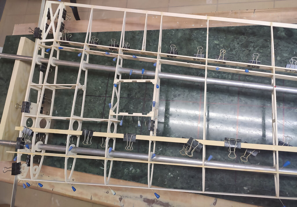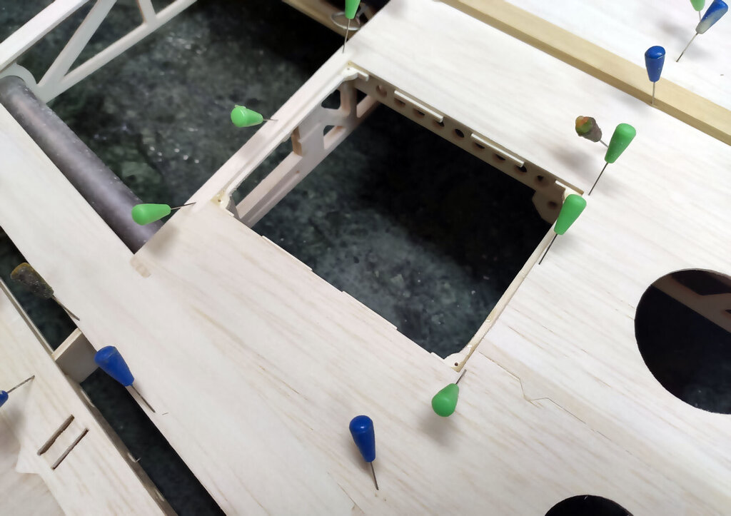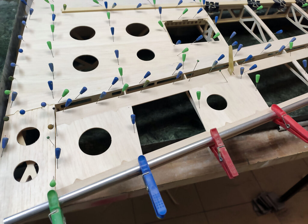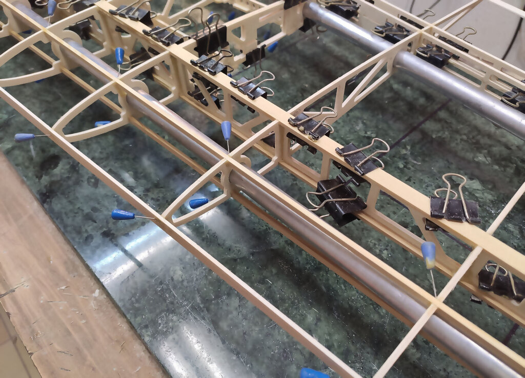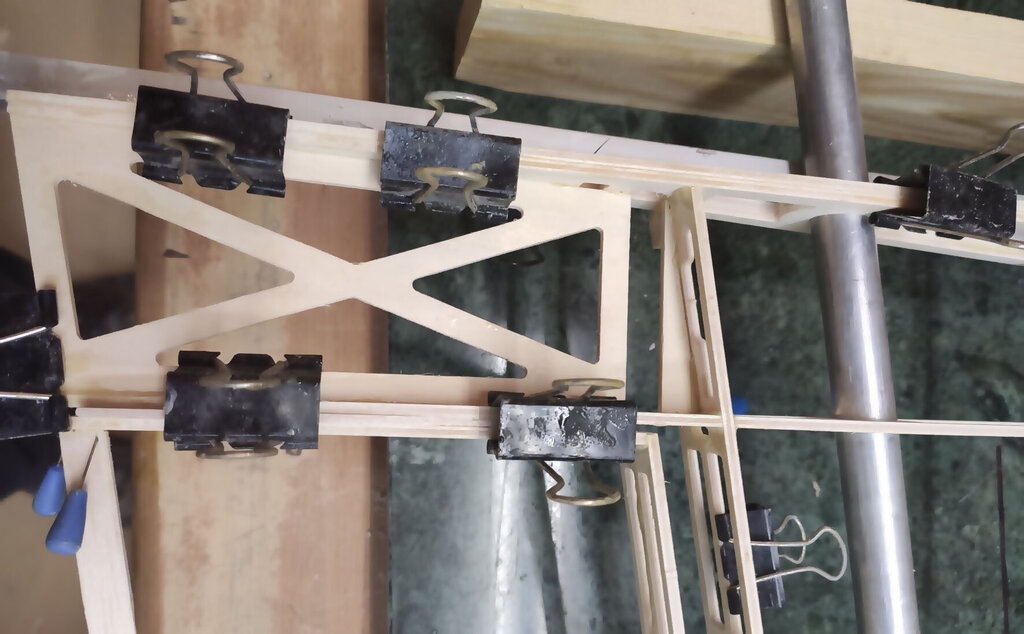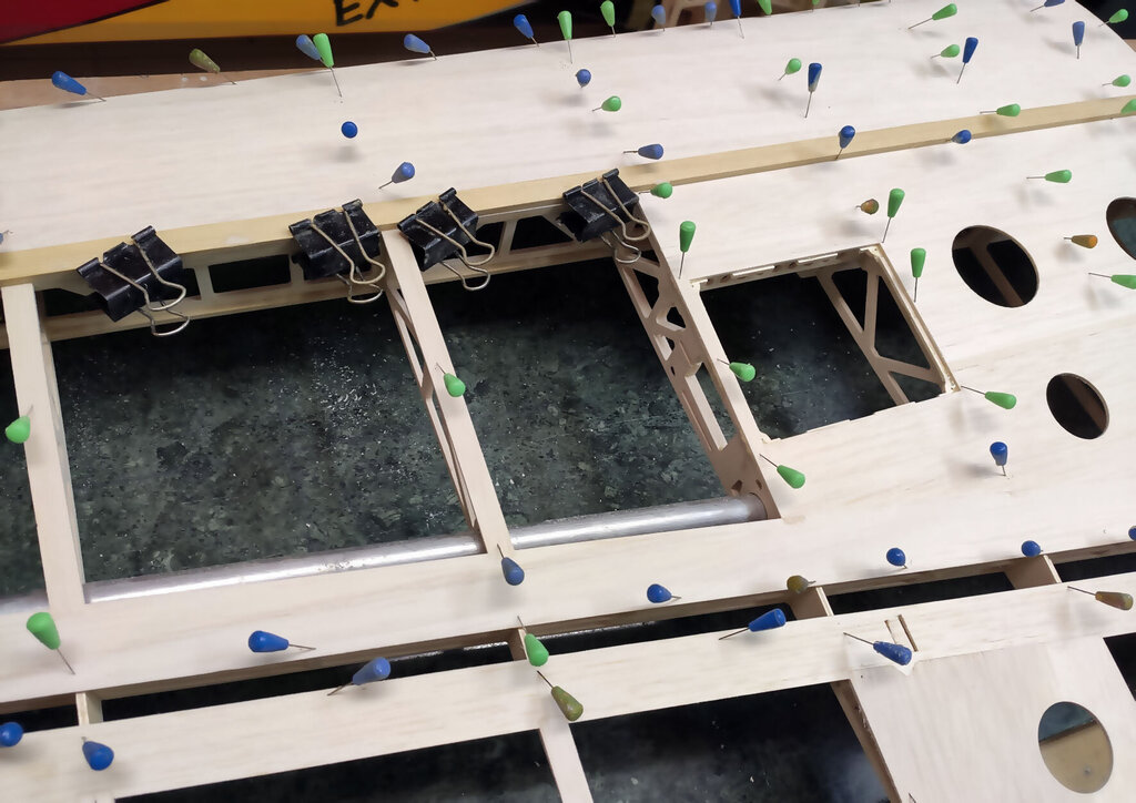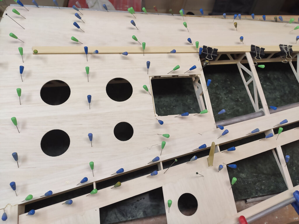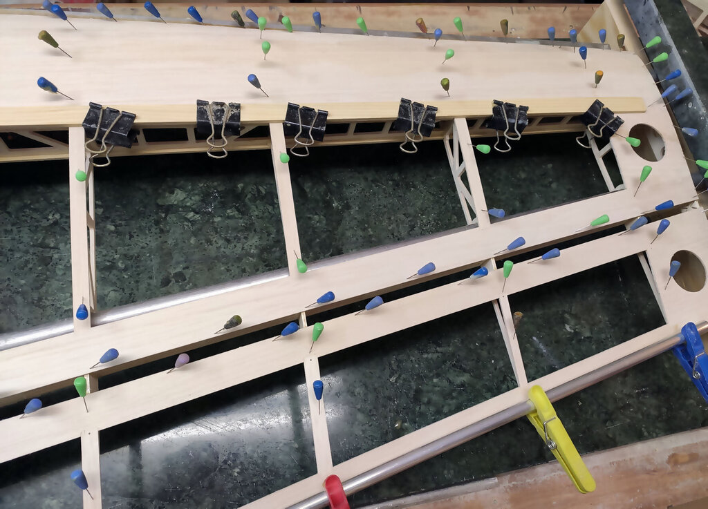 Sławek, 1. Kabinkę mocuj po obklejeniu folią. Łatwiej, mocniej i ładniej. 2. Proponuję Ci zmianę technologii kesonowania. Tak duża ilość ścisków prawdopodobnie zrobiła Ci miazgę z balsowej listwy na natarciu. No i pewnie pozostawią ślady na poszyciu. Nie potrzebujesz tak dużej ilości ścisków. - jeżeli chcesz robić ściskami to podłóż pod ściski listwy sosnowe jakieś tak z 3 lub 4 mm. I ścisków używaj w miejscach gdzie pod poszyciem są żebra. - możesz też spróbować jeszcze łatwiejszego sposobu. Spryskaj wodą poszycie. Potem przyłóż do konstrukcji i przyszpilkuj. Ta balsa po spryskaniu zrobi się podatna na wygięcia. To nie musi być bardzo dokładnie zrobione. Na drugi dzień po wyschnięciu wystarczy pokryć konstrukcję klejem i użyć tylko szpilek. - no i dobry jest też sposób Konrada. Czyli taśmą obklejasz naokoło i wspomagasz szpilkami. Tak jak wspomniał Konrad poszycie nie może z przodu wystawać za bardzo. Pozdrawiam