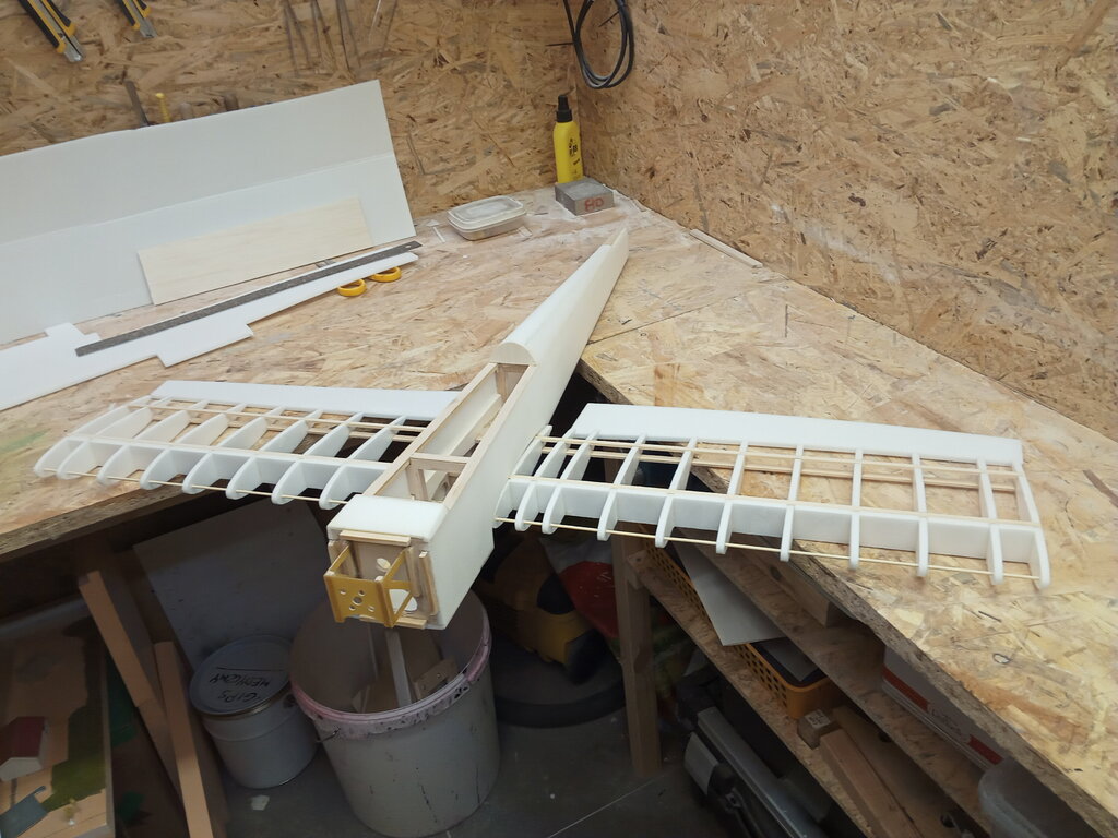 Witam. Przyszedł czas modyfikacji, a mianowicie dorobienie klap w skrzydłach. Klapy wycięte, nawet sprawnie poszło. Listewki wklejone.