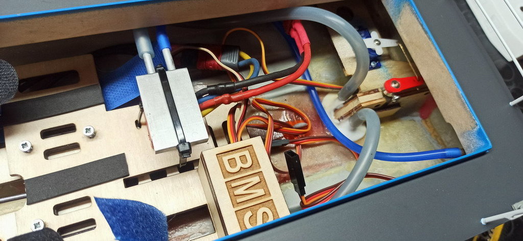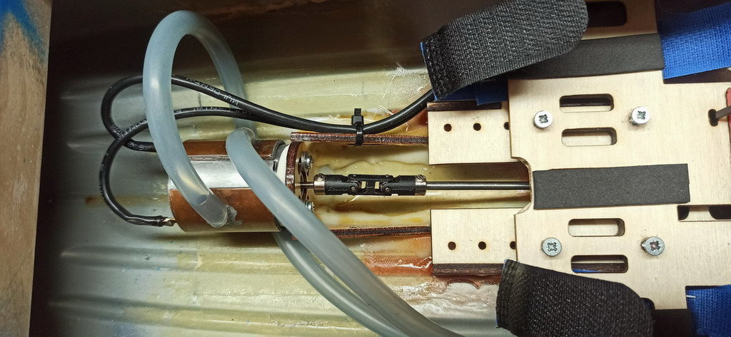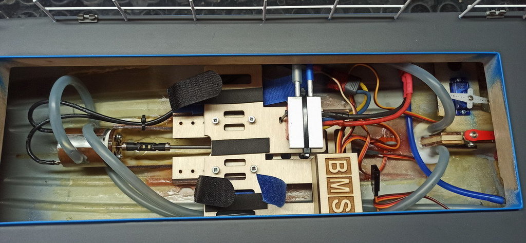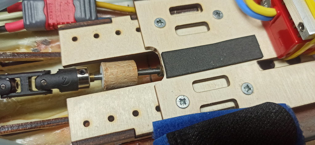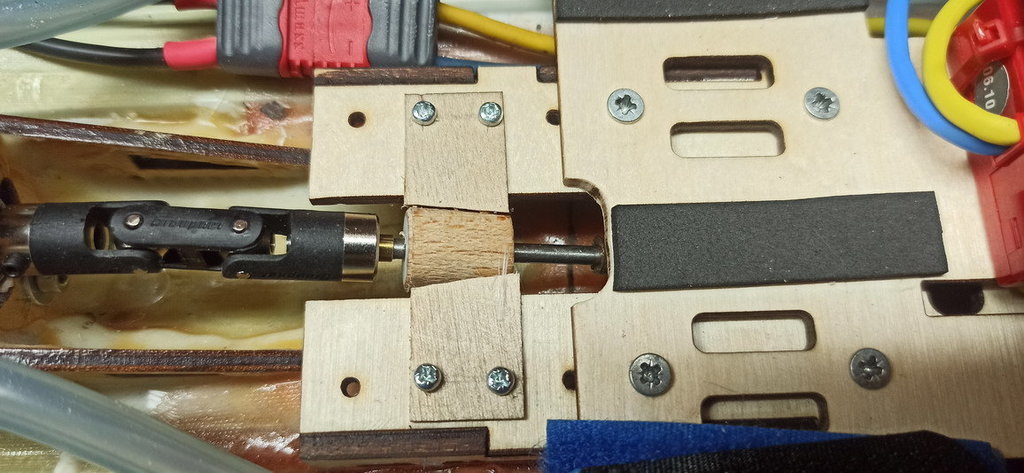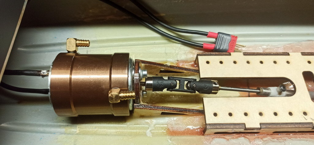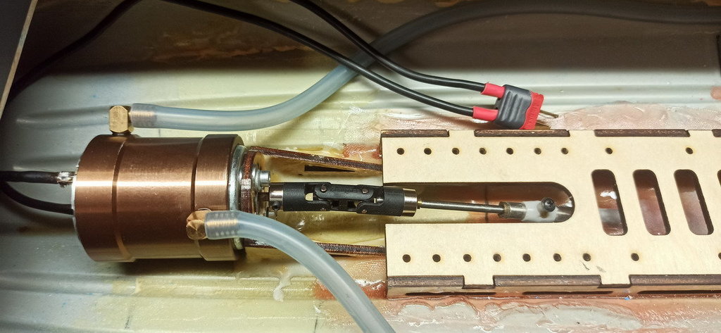 Model miał w zamyśle silnik 400, ale okazało się że jest za mało elastyczny więc zamontowałem 540-kę. Dodatkowo zrobiłem podporę wału bo końcówka wału wpadała w delikatny rezonans. Zastosowałem też większy przegub i jest teraz doskonale. Teraz jest nadmiar mocy i lepiej reaguje jak na horyzoncie pojawią się Somalijscy piraci. Tylko jak oni dopłynęli do Gdyni...? Niebawem fotki i filmy z pływanka -