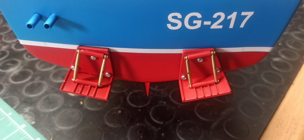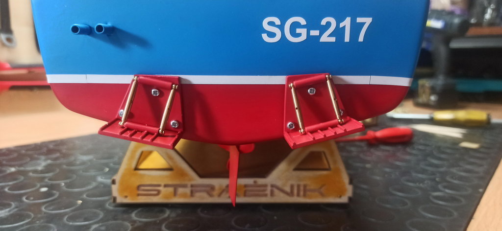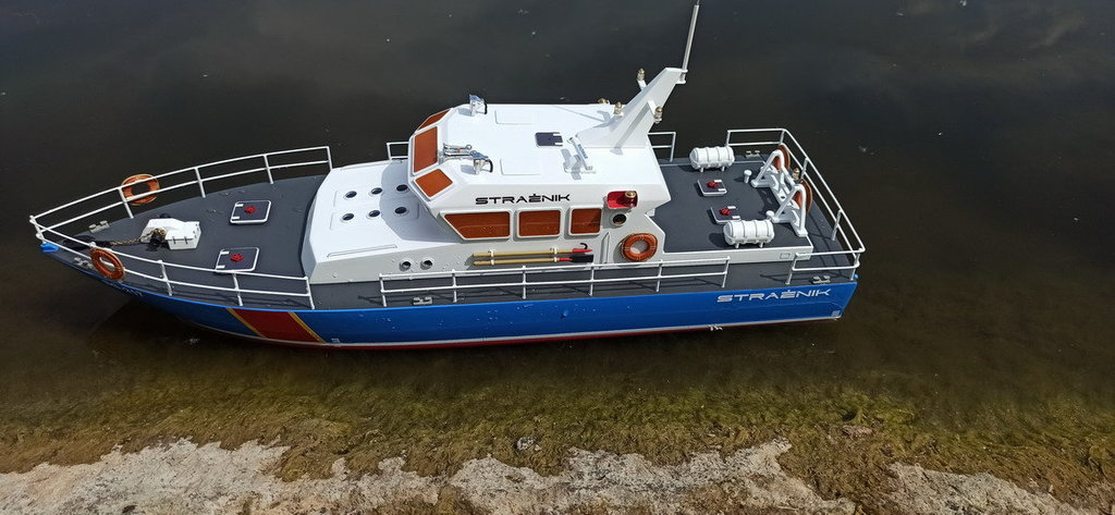 Ostatnimi dniami nastąpiły próby i regulacje. Model pływa dobrze ale ma 2 mankamenty. Pierwszy to "zalewanie" pokładu wyporem wody w okolicach dziobu i śródokręcia oraz przy prędkości "pościgowej" "tyłek" za bardzo siedzi w wodzie. Pierwszy problem rozwiążę niebawem doklejając listwy do burt aby "łamały" opływ. Co do "siedzącej" rufy to przeniosłem lekko środek ciężkości do przodu i choć efekt mniejszy to nie zniknął. Jedynym rozwiązaniem było dorobienie "trymer klap".Tylko musiałem wymyślić coś trochę "makietowego" aby nie raziły oka w takiej jednostce. Po wstępnych ustawieniach trochę lepiej ale nadchodzące czarne chmury nie pozwoliły na końcowe ustawienia i testy. Może dziś coś się da zadziałać i wtedy będą jakieś filmiki. -