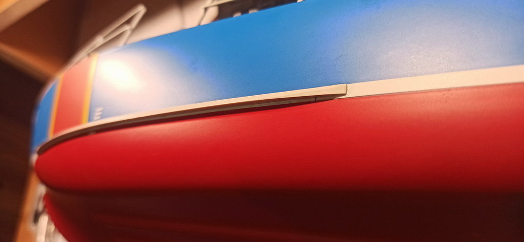 I dlatego to chlapanie odrobinę zniweluje. Dziś przyszły listwy i to 3 rodzaje do wdrożenia mojego pomysłu. Wybrałem listewkę PVC 3x3mm ,o przekroju trójkątnym 90 stopni. Postanowiłem tak jak miałem w zamyśle dokleić ją wzdłuż linii wodnej powyżej załamania dna. To spowoduje złamanie fali i mam nadzieję że trochę pomoże…Po doklejeniu okazało się że jest ledwo widoczna i na dodatek powstał mimowolnie akcent „makietowy”. Teraz tylko woda i próby. Po tych zabiegach albo będzie lepiej albo nie. Zobaczymy. Dziękuję wszystkim za uwagi. -