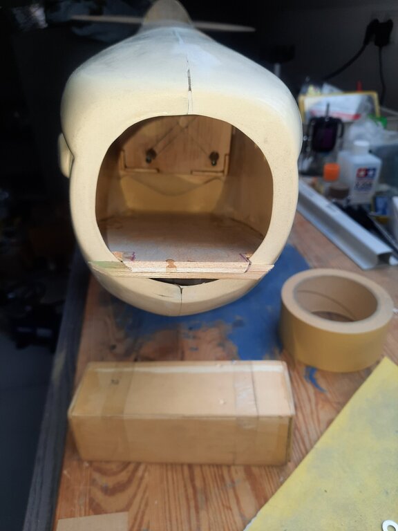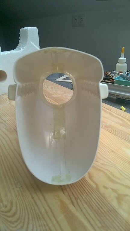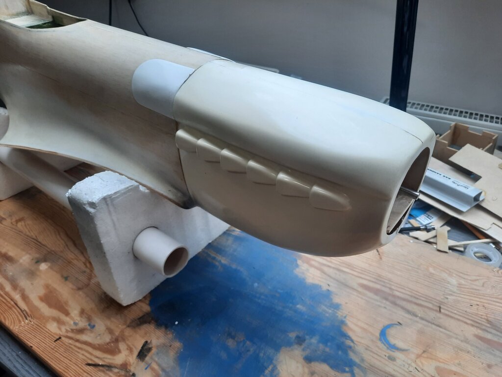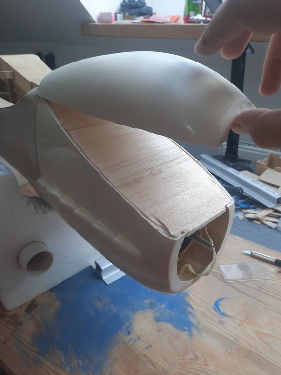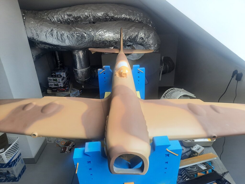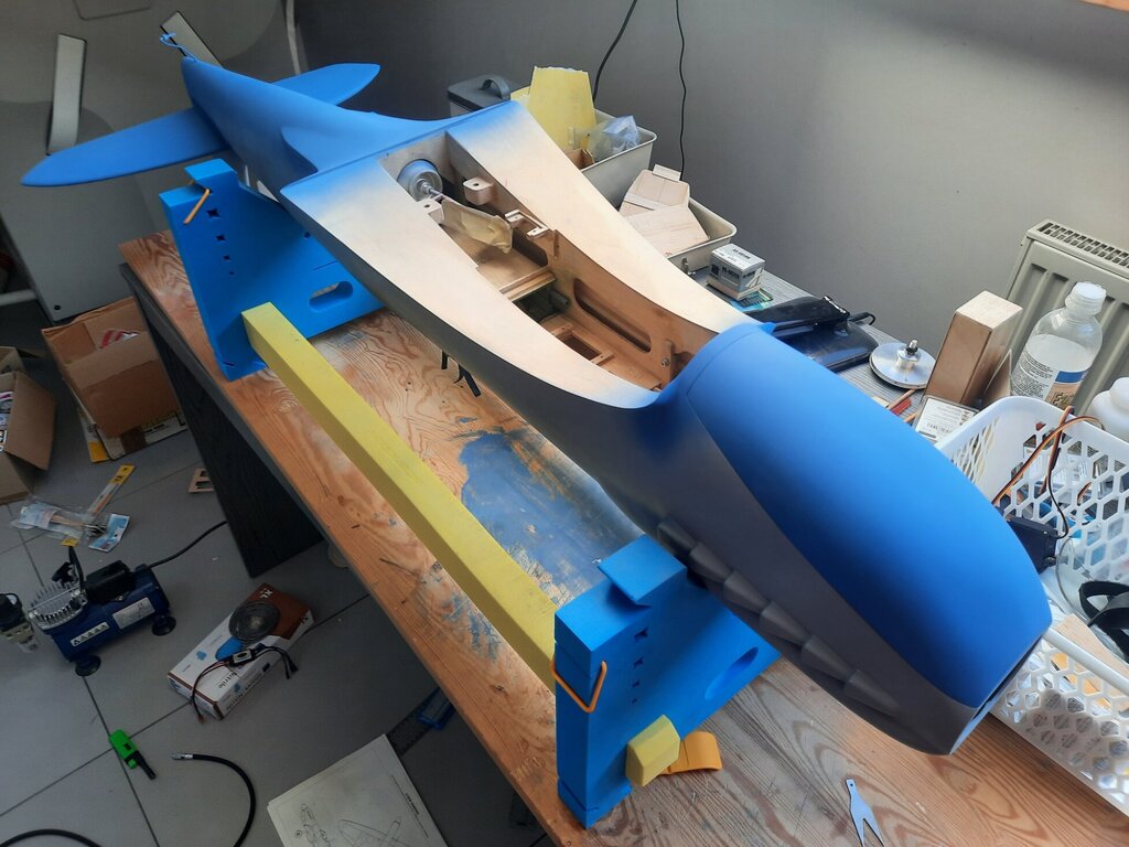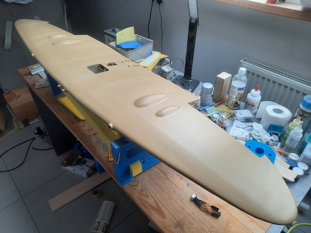 Długo się nie odzywałem, miałem znaczną przerwę ale już nadrabiam zaległości. Udało się dokończyć skrzydło z klapami, dopasować je do kadłuba oraz zrobić połączenie/przejście pomiędzy kadłubem i skrzydłem. Skleiłem również dwie połówki (prawą i lewą) przedniej osłony. Wzmocniłem ją paskiem szklanym z żywicą i zaszpachlowałem. Zgodnie z instrukcją osłona ta ma być zakładana od przodu po zdjęciu śmigła. Takie rozwiązanie niezbyt mi się podoba, planuję więc ponownie ją przeciąć, tym razem na część górną i dolną. Część górną planuję zamontować na stałe i zaszpachlować łączenie. Część dolna natomiast będzie zdejmowana. Cięcie planuję zrobić na granicy kolorów w przyszłym malowaniu. Byłoby idealnie gdyby pod tą osłoną mógł być zamontowany pakiet, byłby do niego bardzo dobry dostęp, miejsca jest pod dostatkiem. Obawiam się jednak, że tak duża masa tak mocno przesunięta do przodu spowoduje, że będzie problem z sensownym wyważeniem i pakiet będzie musiał jednak trafić za silnik, w miejsce gdzie oryginalnie miał się znaleźć zbiornik paliwa. W takim układzie wymiana go będzie niestety wymagała zdjęcia skrzydła. -