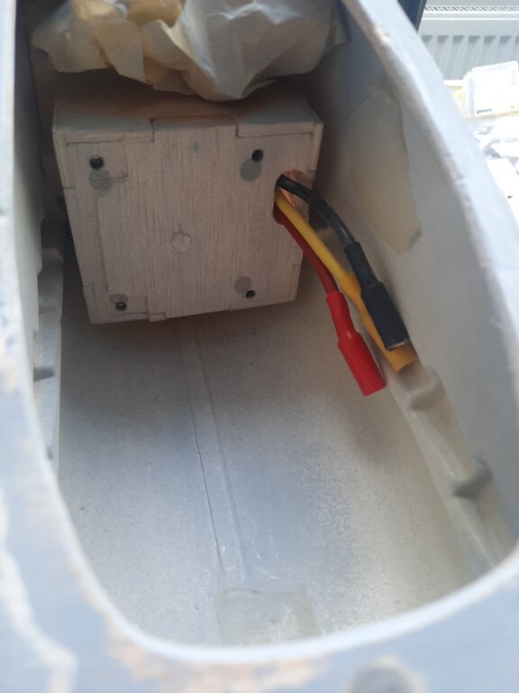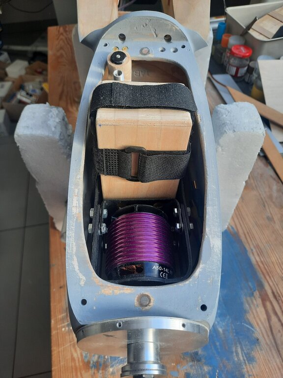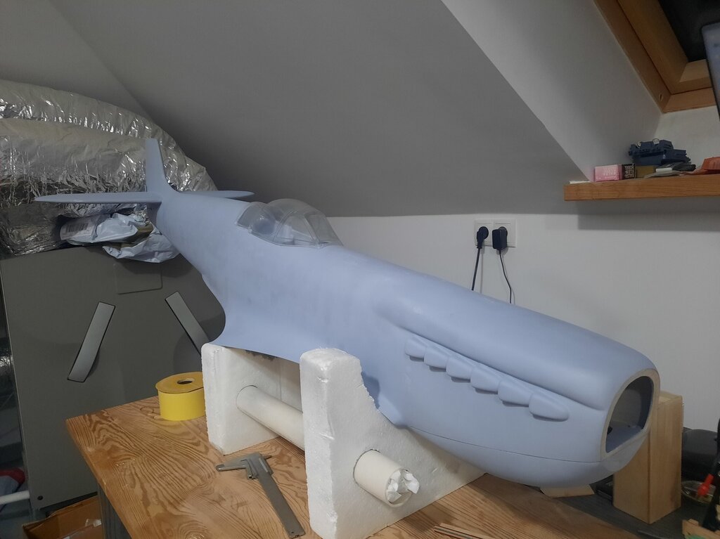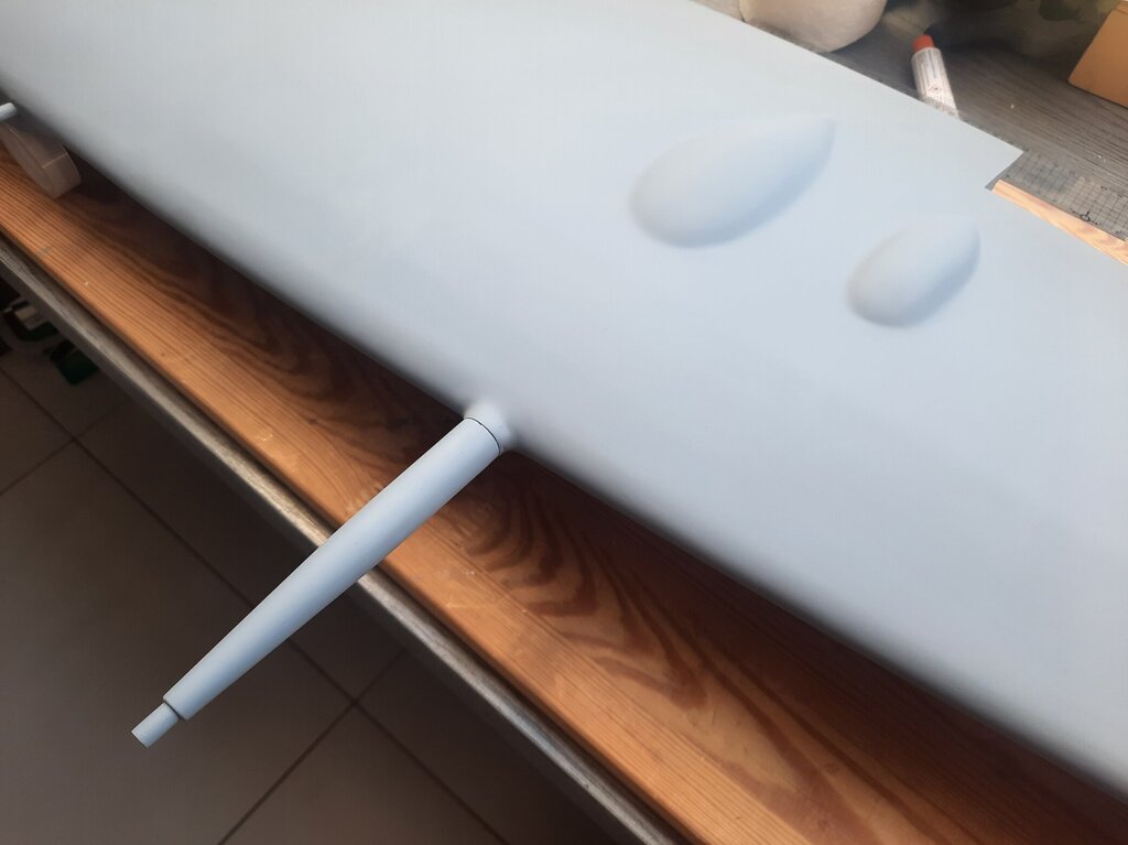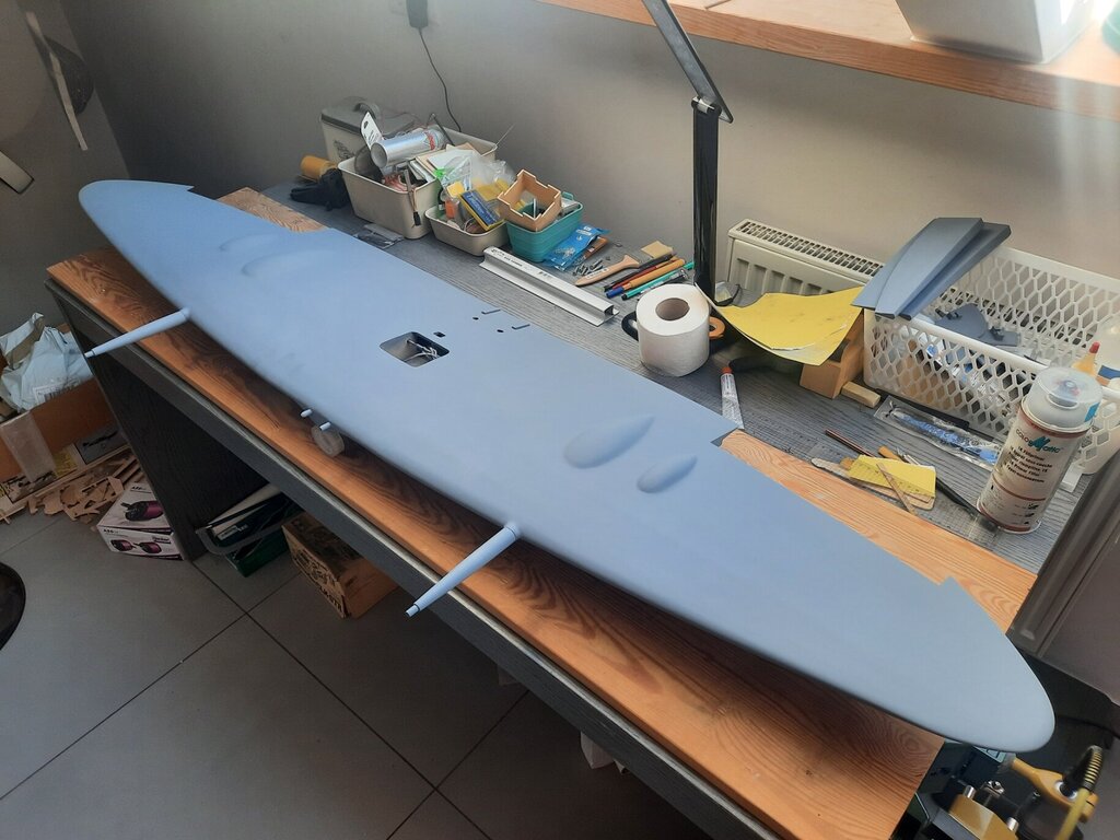 No i prace ruszyły - baaardzo powoli. Od ostatniego wpisu minęły dwa lata, zrobione zostało niewiele ale to co zostało to pokazuję. Przede wszystkim zostały zrobione działka. Proces pewnie niezbyt odkrywczy jednak własny, wyglądał tak: - wytoczyłem odpowiedni kształt z balsowego wałka na wiertarce przy pomocy papieru ściernego - odciąłem 'gniazdo' od działka - wydrążyłem działko pod rurkę węglową - wydrążyłem gniazdo pod większą rurkę węglową - wkleiłem rurki - przyciąłem rurki do odpowiedniej długości oraz doszlifowałem krawędzie styku Takie działka wkleiłem w skrzydło, dodatkowo przykleiłem również radiatory, oraz 'owiewki' działek. Z tego co się orientuję to w tym egzemplarzu przy tych działkach powinna być jedna duża owiewka na skrzydło. Do zestawu były jednak dołączone dwie mniejsze formowane próżniowo. Jakie były takie przykleiłem. Łączenia zostały wygładzone szpachlą, całość pomalowana podkładem, lekko przeszlifowana i w takiej formie będzie już malowana. W międzyczasie kupiłem silnik wraz z mocowaniem. Poprzedni pomysł ze sklejkowym przedłużeniem poszedł więc do kosza. Pod znakiem zapytania stoi również pomysł by bateria trafiła nie do wnętrza kadłuba tylko pod owiewkę. Przygotowałem model baterii w odpowiednim rozmiarze oraz z odpowiednią masą i chociaż być może dało by radę całość wyważyć, to okazało się, że miejsca jednak trochę brakuje. -