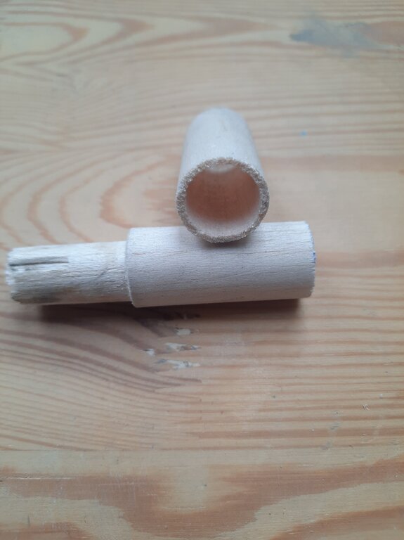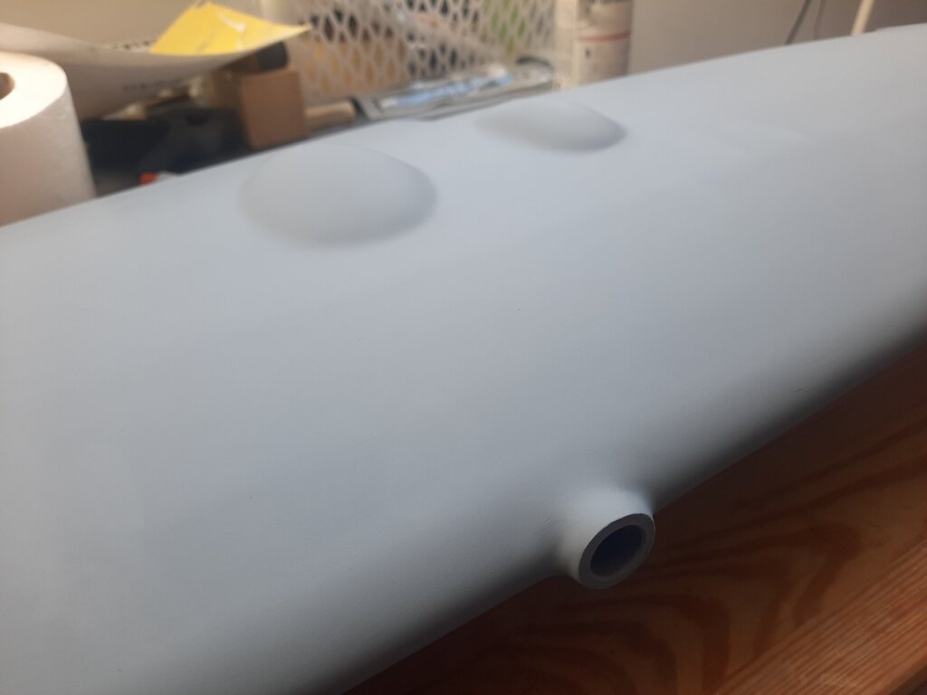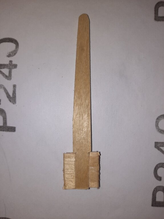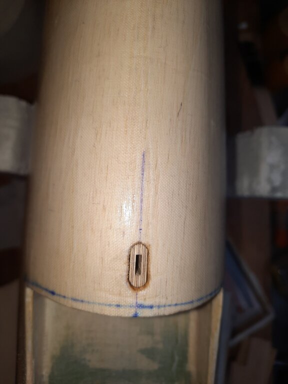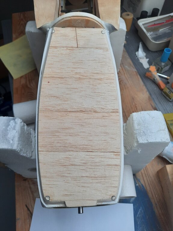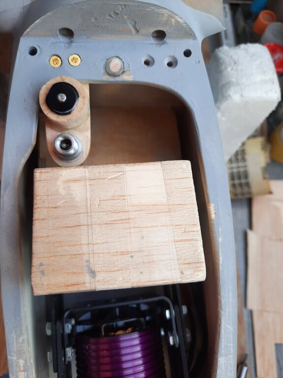No i prace ruszyły - baaardzo powoli. Od ostatniego wpisu minęły dwa lata, zrobione zostało niewiele ale to co zostało to pokazuję. Przede wszystkim zostały zrobione działka. Proces pewnie niezbyt odkrywczy jednak własny, wyglądał tak: - wytoczyłem odpowiedni kształt z balsowego wałka na wiertarce przy pomocy papieru ściernego - odciąłem 'gniazdo' od działka - wydrążyłem działko pod rurkę węglową - wydrążyłem gniazdo pod większą rurkę węglową - wkleiłem rurki - przyciąłem rurki do odpowiedniej długości oraz doszlifowałem krawędzie styku Takie działka wkleiłem w skrzydło, dodatkowo przykleiłem również radiatory, oraz 'owiewki' działek. Z tego co się orientuję to w tym egzemplarzu przy tych działkach powinna być jedna duża owiewka na skrzydło. Do zestawu były jednak dołączone dwie mniejsze formowane próżniowo. Jakie były takie przykleiłem. Łączenia zostały wygładzone szpachlą, całość pomalowana podkładem, lekko przeszlifowana i w takiej formie będzie już malowana. W międzyczasie kupiłem silnik wraz z mocowaniem. Poprzedni pomysł ze sklejkowym przedłużeniem poszedł więc do kosza. Pod znakiem zapytania stoi również pomysł by bateria trafiła nie do wnętrza kadłuba tylko pod owiewkę. Przygotowałem model baterii w odpowiednim rozmiarze oraz z odpowiednią masą i chociaż być może dało by radę całość wyważyć, to okazało się, że miejsca jednak trochę brakuje. -